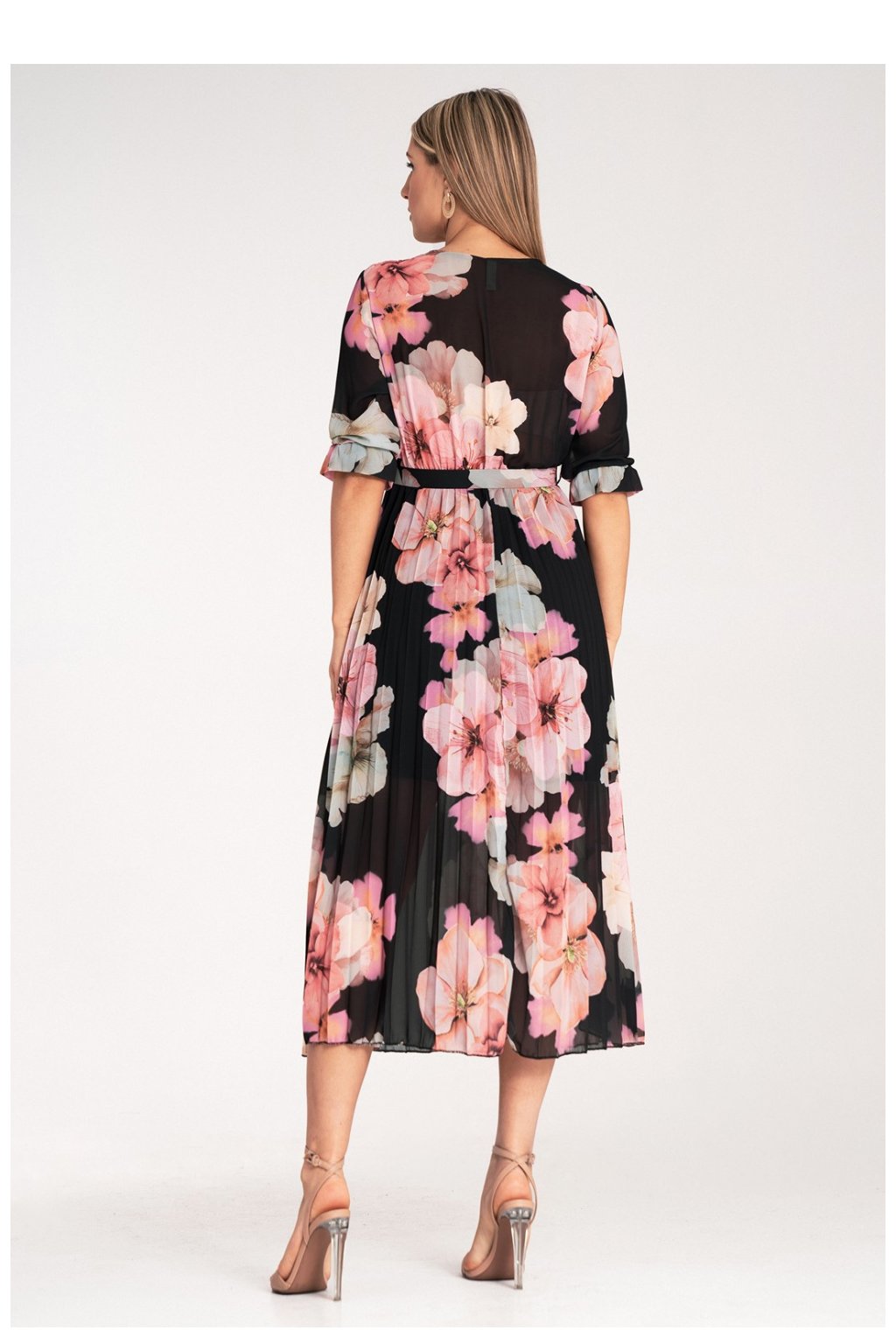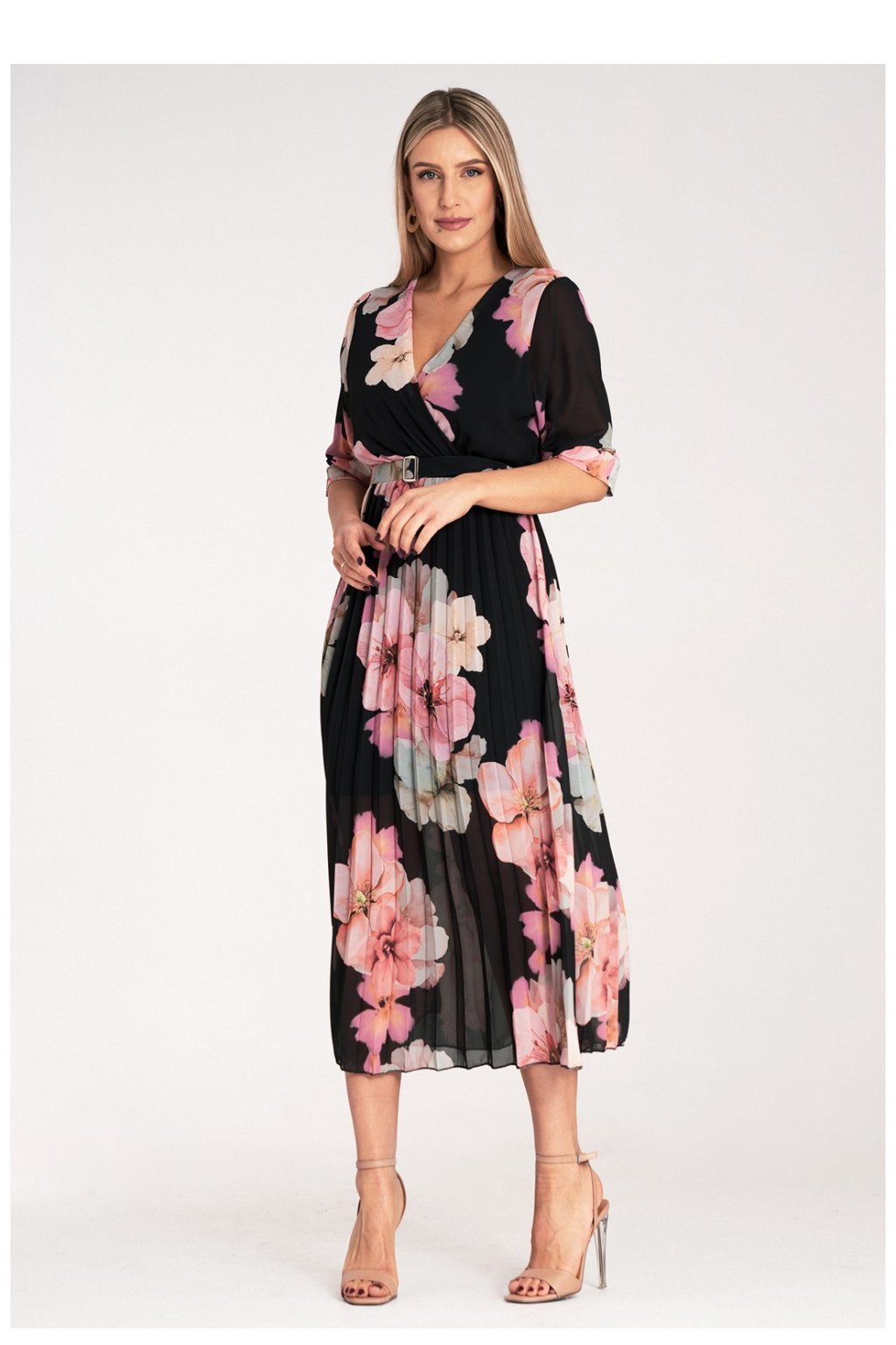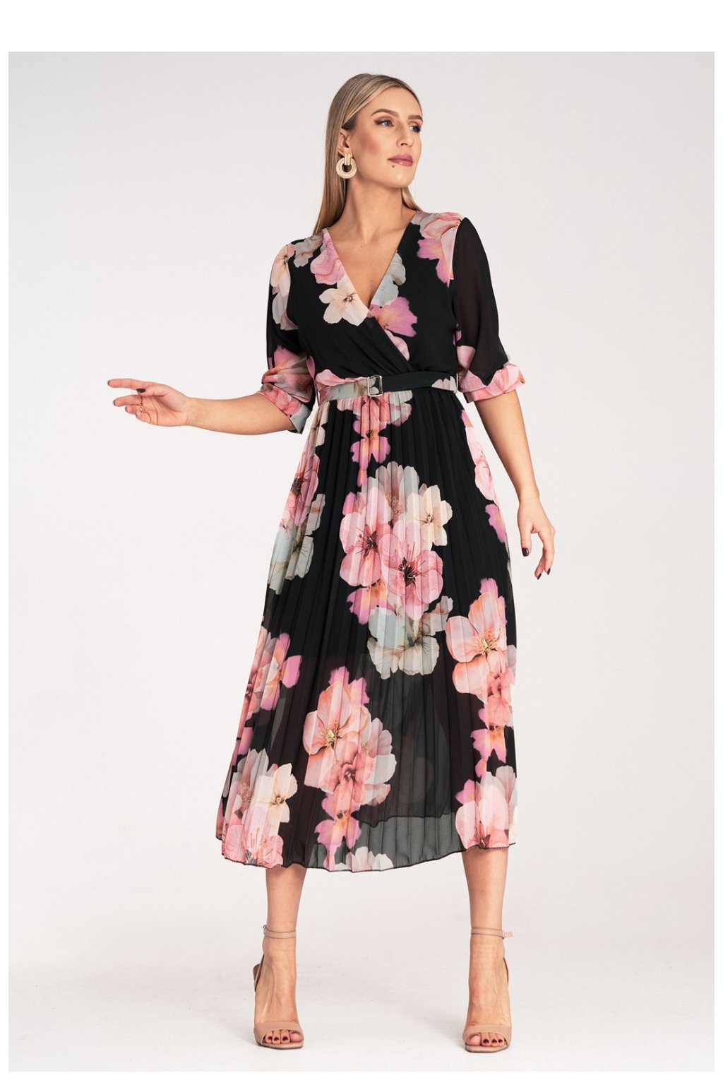 Midi šaty s efektním květinovým potiskem a plisí. Model s přesahujícím výstřihem, elastickým pasem a páskem zdůrazňujícím pas. Rukávy délky 3/4 zakončené jemnými záhyby. Viskózová podšívka.Polyester 95 %