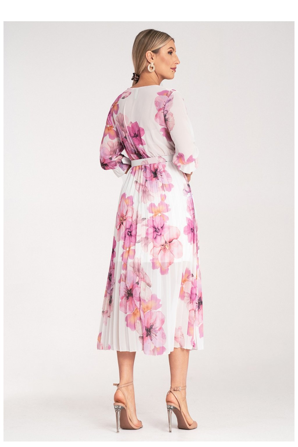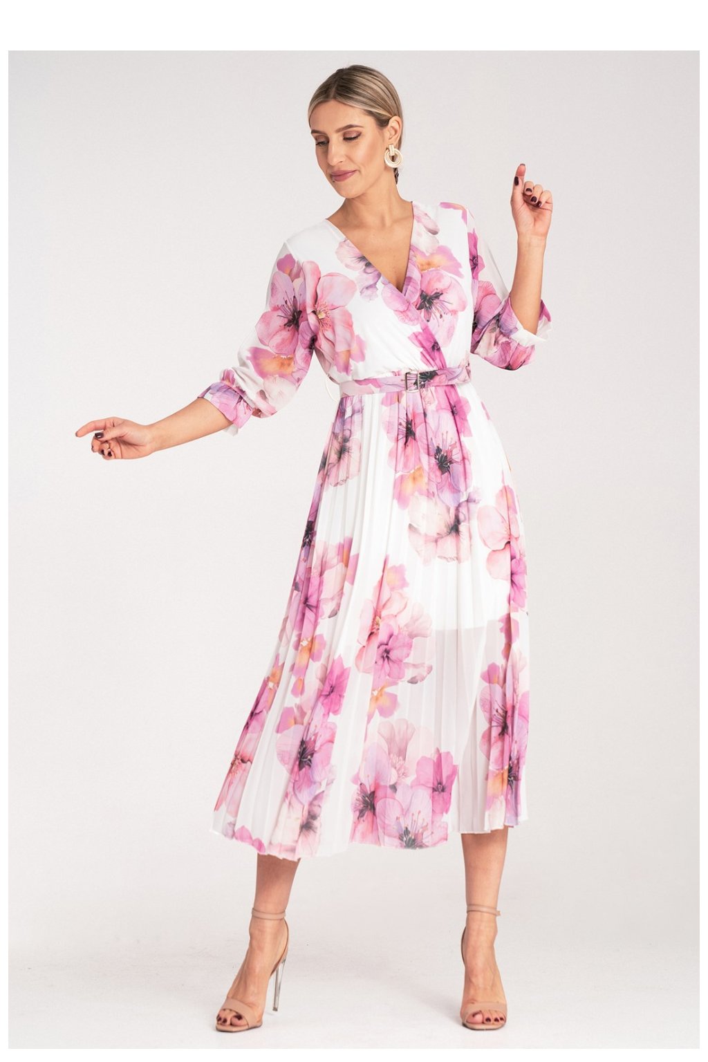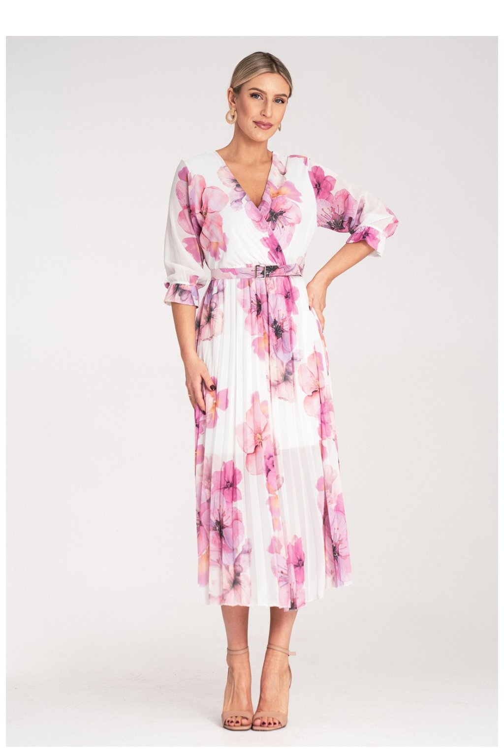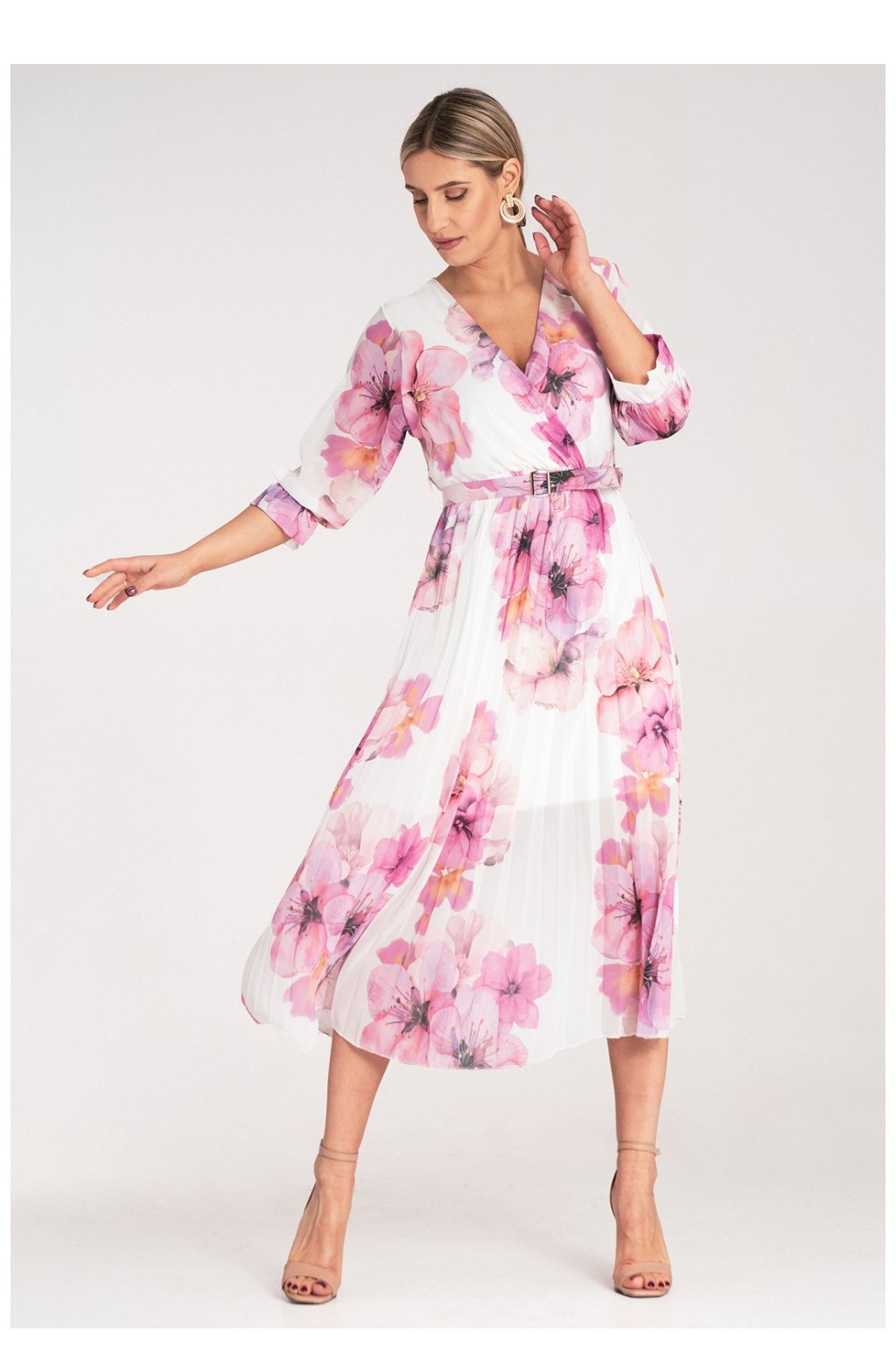 Šaty midi s efektním květinovým potiskem a střihem do záhybu. Model s přesýpacím výstřihem, elastickým pasem a páskem zdůrazňujícím pas. Rukávy délky 3/4 zakončené jemnými záhyby. Viskózová podšívka.Polyester 95 %