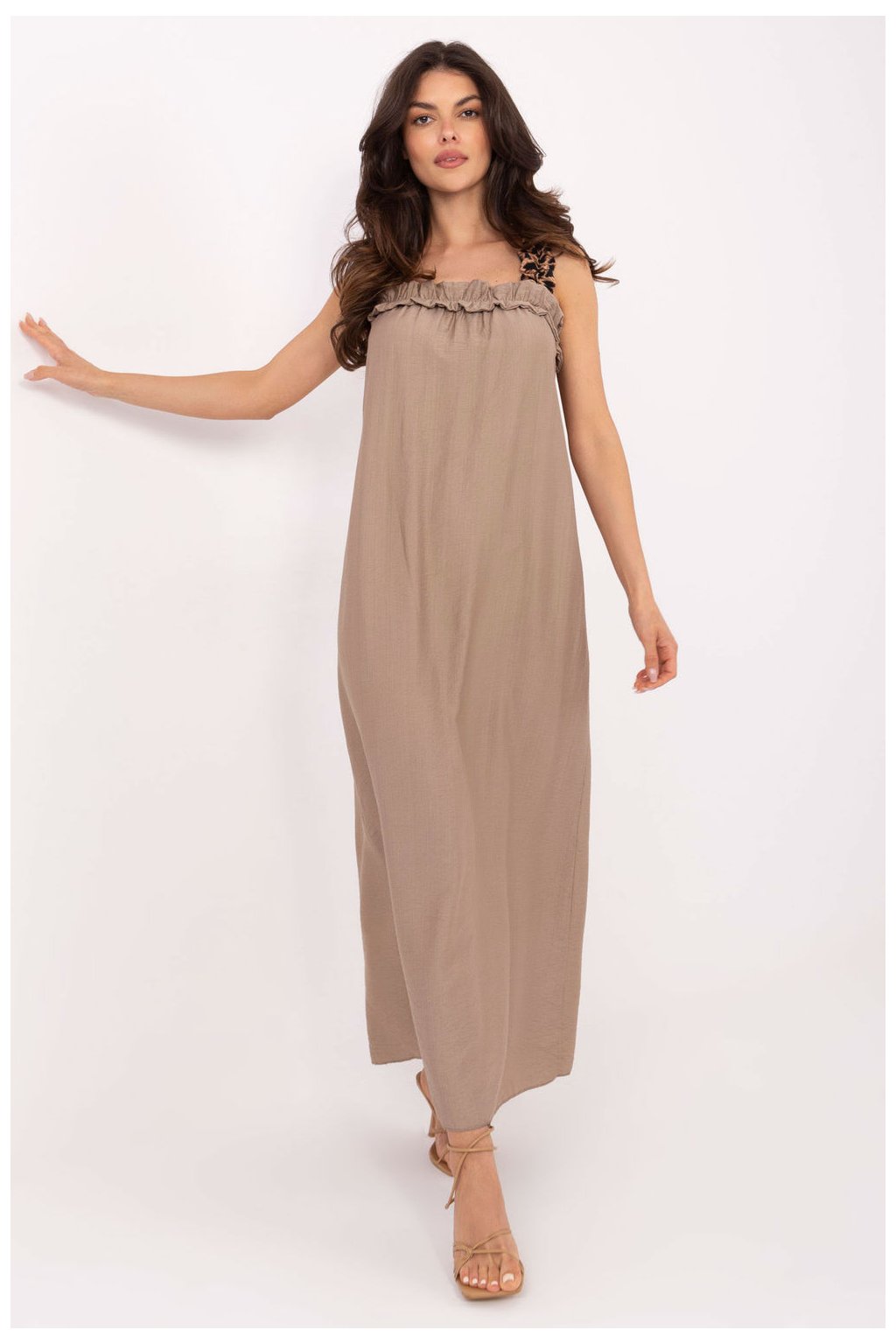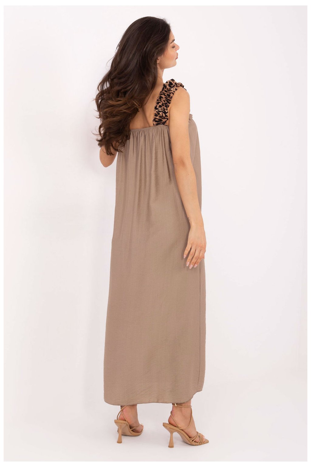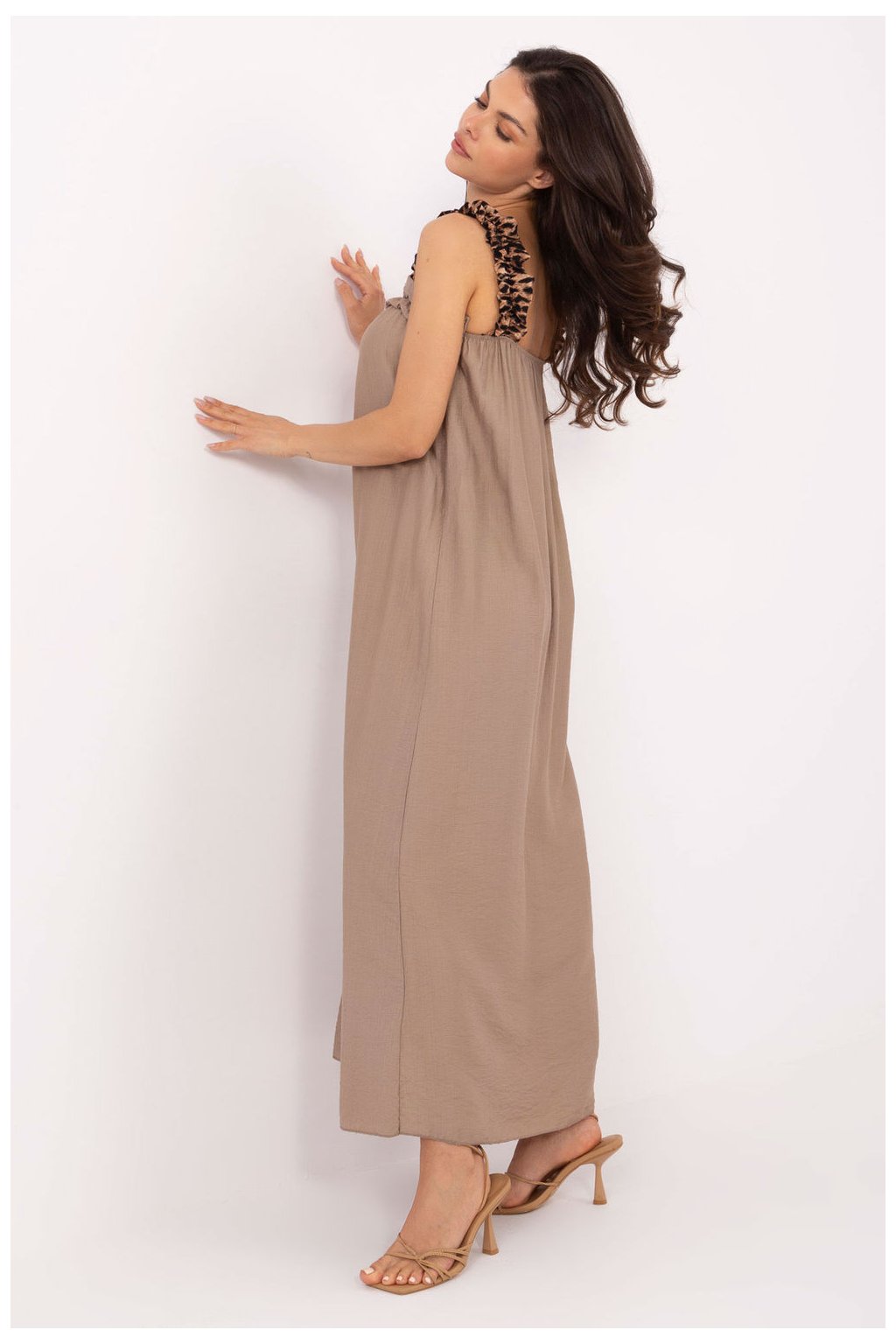 Letní maxi šaty na ramínka vyrobené z lehké, prodyšné viskózy jsou ideální volbou pro každodenní outfit v teplých dnech. Střih lehce rozšířený, zdůrazňující ženskou siluetu a poskytující volnost pohybu. Šaty se vyznačují obdélníkovým výstřihem zdobeným decentní volánkou, která celku dodává romantický charakter. I když hlavním vzorem je hladká látka, na ramínkách se objevuje módní akcent ve formě leopardího vzoru, který stylizaci dodává trochu divokosti. Model nemá zapínání a obléká se přes hlavu, což zvyšuje pohodlí nošení. Ideální na procházky, nákupy nebo letní setkání s přáteli.| Velikost | Délka | Obvod beder | Obvod prsou | Obvod v pase |