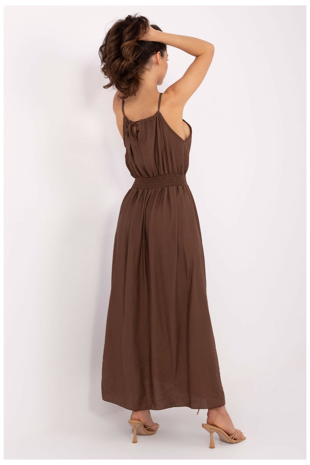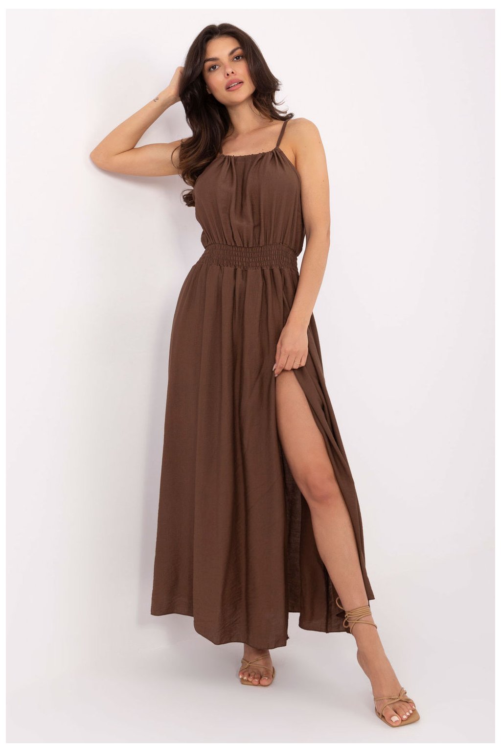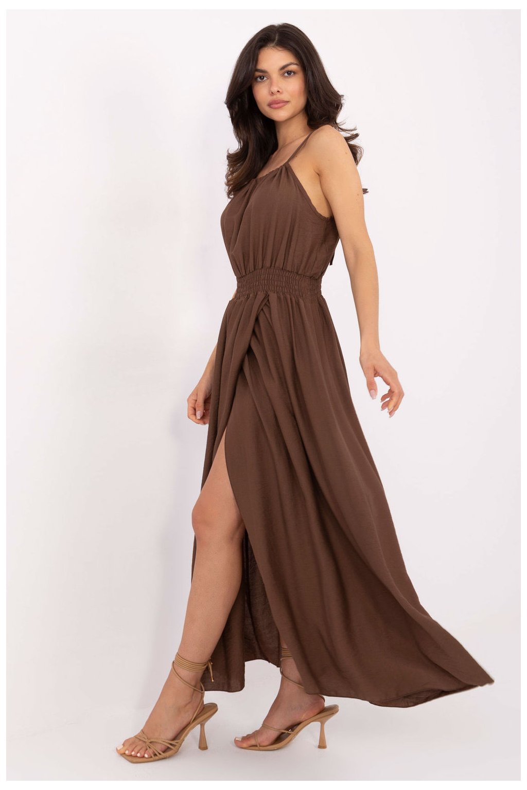 Letní maxi šaty na ramínka s obalem střihu jsou kombinací pohodlí a decentní elegance na každý den. Vyrobeny z lehkého, prodyšného materiálu směsi viskózy a nylonu, poskytují pohodlí i v horkých dnech. Hladká látka zdůrazňuje univerzální charakter šatů a kulatý výstřih dodává šaty něžnosti. Model nemá zapínání, obléká se přes hlavu, s dodatečným šněrováním na zádech, které nejen stabilizuje střih, ale také představuje zajímavý, ženský detail. Škrtící pas krásně tvaruje postavu, přidává lehkost a vzdušnost. Ideální na každodenní procházky, schůzky nebo letní výlety.Viskóza 88 %
