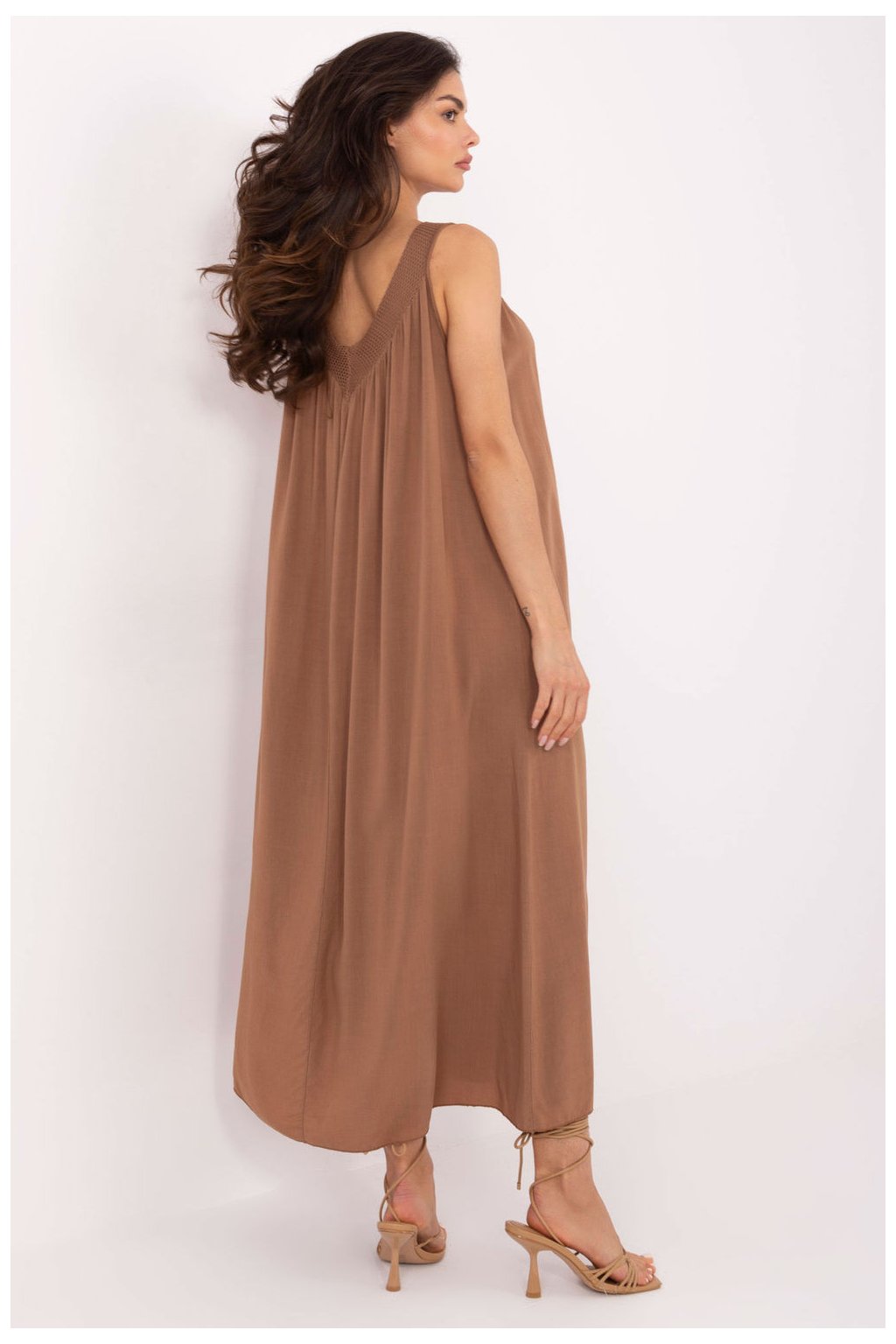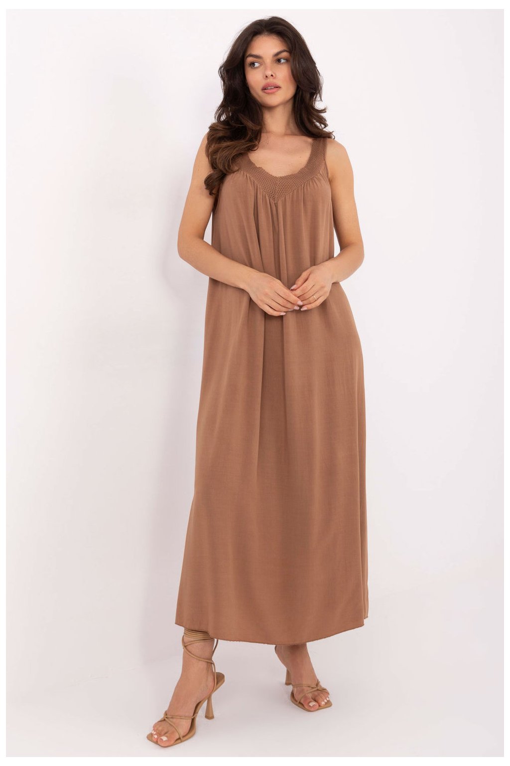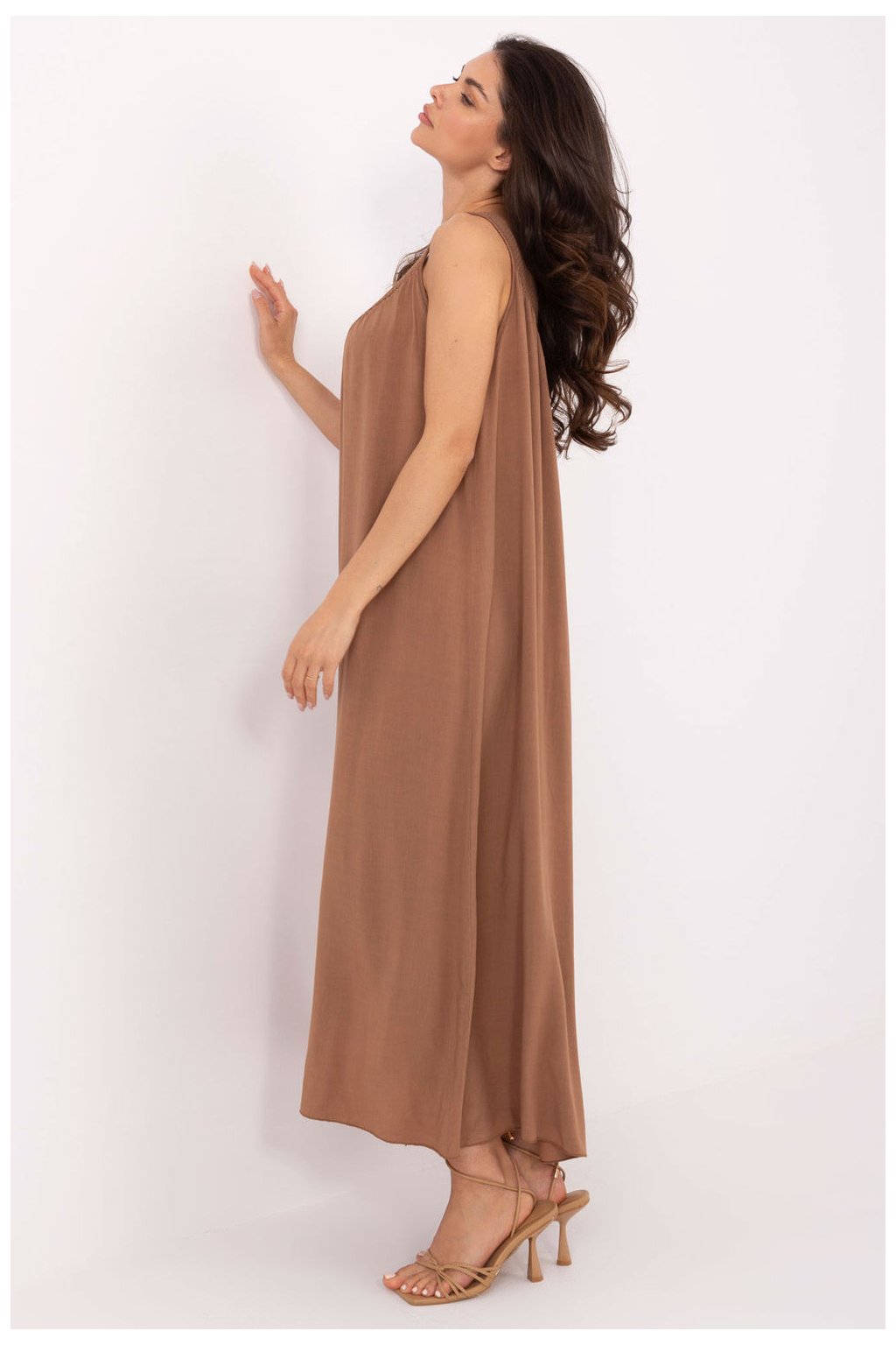 Letní midi šaty ve stylu oversize jsou ideální volbou pro každodenní, volné stylování. Vyrobené z lehkého a prodyšného viskózu, skvěle se hodí na teplé dny, poskytují pohodlí a pohodlí. Hladká látka a volný střih zaručují plnou volnost pohybu, a výstřih do V jemně zdůrazňuje linii krku a dodává ženský šarm. Šaty s tenkými ramínky, bez zapínání, snadno se oblékají a jsou velmi praktické. Je to ideální model na léto lehký, prodyšný a stylový ve své jednoduchosti.| Velikost | Obvod prsou | Obvod v pase |