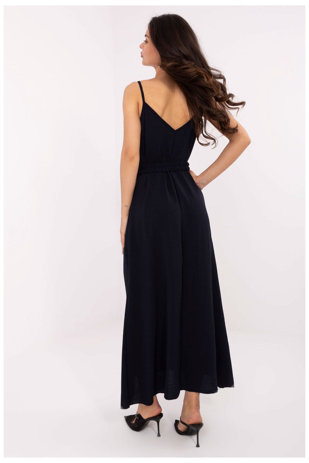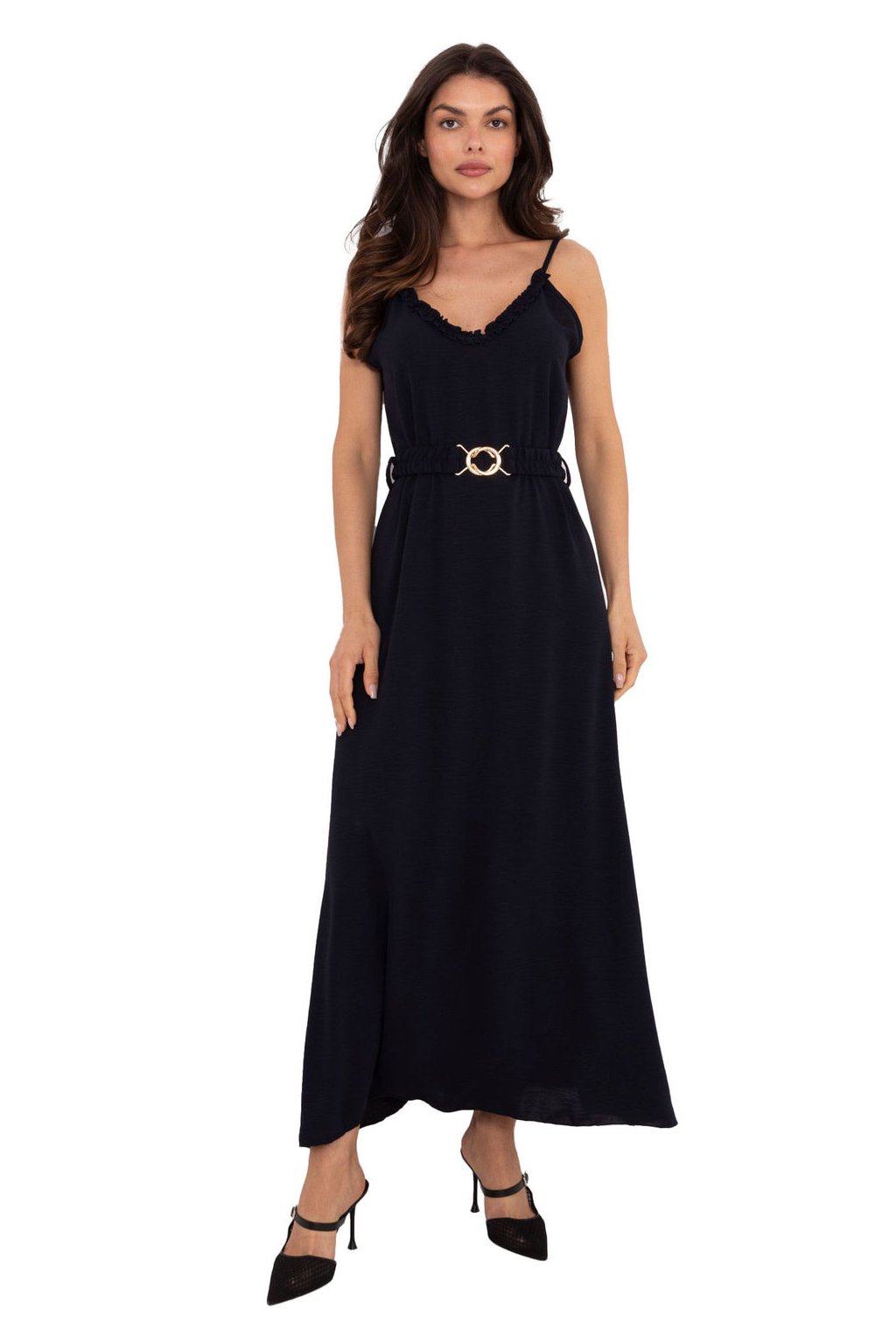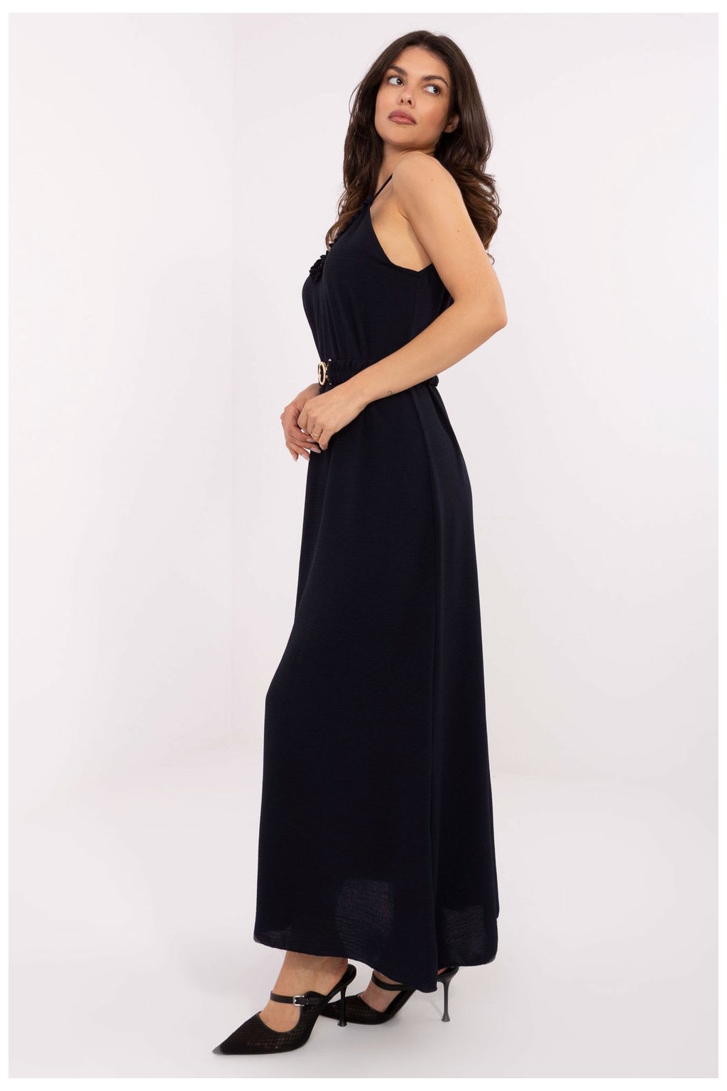 Letní maxi šaty na ramínka jsou stylovým a pohodlným návrhem pro každodenní výlety. Vyrobené z lehkého polyesteru, který se dobře přizpůsobuje postavě a je snadno udržovatelný. Hladké tkaniny zdůrazňují eleganci modelu, zatímco rozkvetlý střih dodává lehkost a volnost. Výstřih v srdíčkovém tvaru zdobený jemným volánem dává šatům ženský půvab a romantický charakter. Model nemá žádné zapínání, nasazuje se přes hlavu, což zvyšuje pohodlí nošení. Další výhodou je zapínací pásek, který umožňuje zdůraznit pas a dát postavě požadovaný tvar. Ideální na letní procházky, setkání nebo každodenní aktivity.| Velikost | Obvod prsou | Obvod v pase |