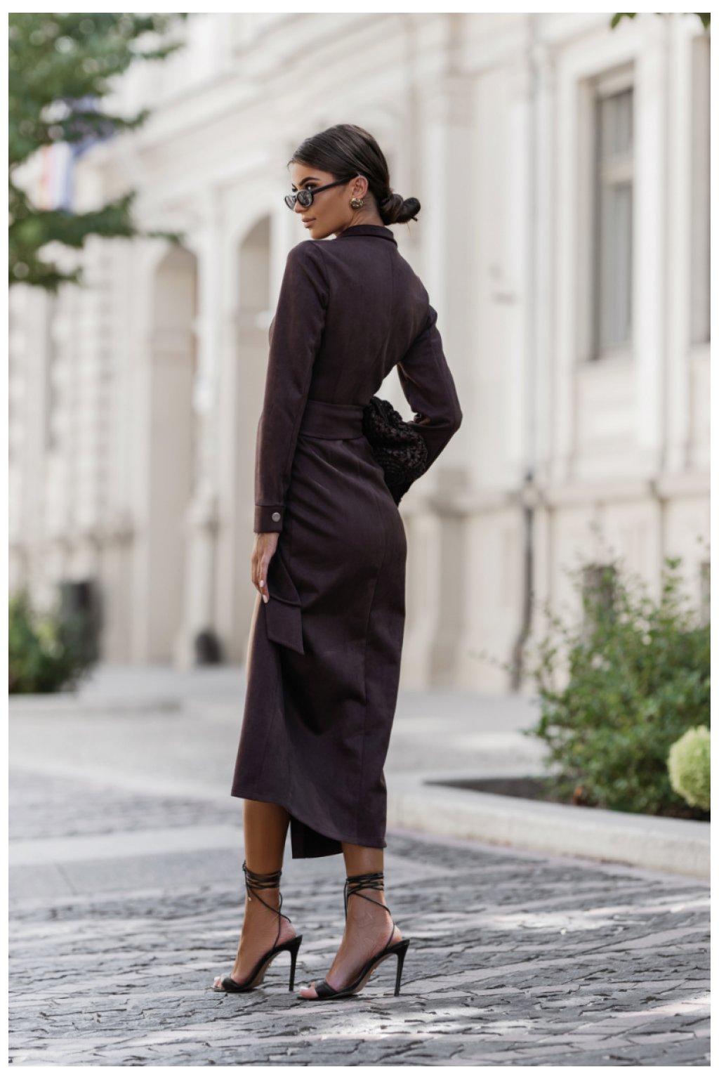 Šaty v délce ke kolenům s 3/4 rukávy, zavazují se v pase. Jemné prošívání pěkně tvaruje siluetu. Boční rozparky dodávají šik a eleganci.
