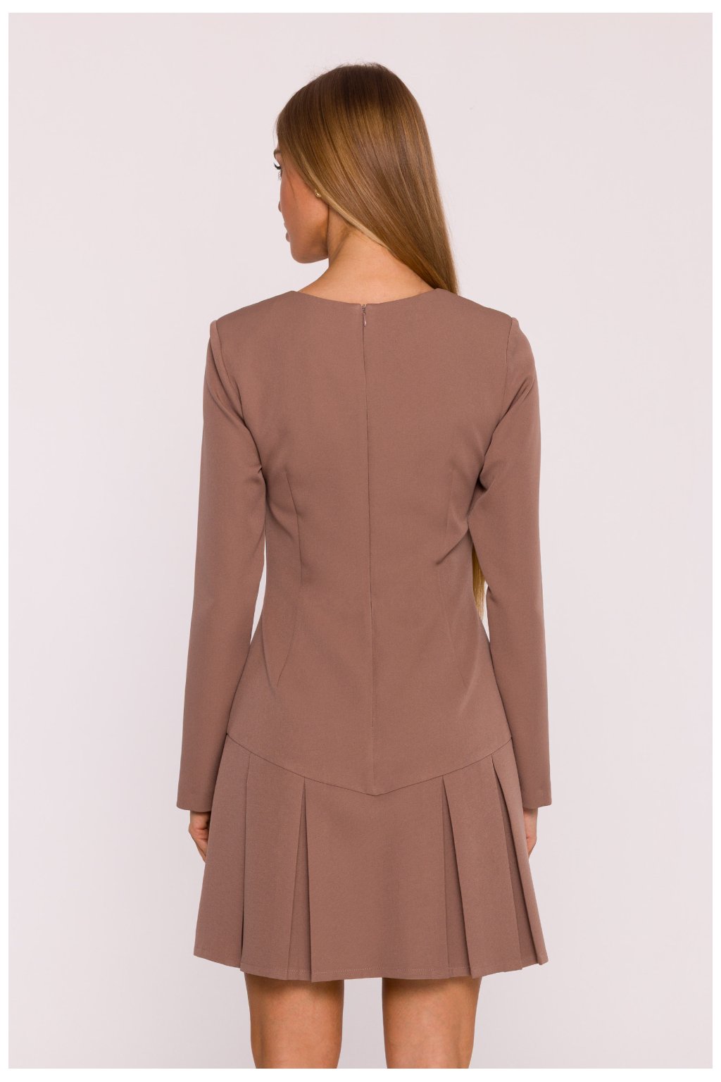 Klasické šaty vyrobené z hladké látky s matným povrchem jsou návrhem, který spojuje jednoduchost a eleganci v moderním provedení. Minimalistický design zaručuje vynikající využití jak v každodenních outfitách, tak při formálnějších příležitostech. Model má jemný dekolt ve tvaru lodě a dlouhé rukávy, které dodávají celku nadčasový charakter. Šaty se zapínají na skrytý zip na zádech, co zajišťuje pohodlí a estetické provedení. Střih lehce přiléhavý v horní části je doplněn dolní částí v kontrafaľdách, které dodávají siluetě lehkost a ženskou grácii. Jednoduchá, talířová linie jemně zdůrazňuje postavu a mini délka dodává šatům moderní, dívčí charakter. Navrženo a ušito v Polsku, vytvořeno pro ženy, které oceňují nadčasovou eleganci v minimalistickém provedení.Polyester 95 %