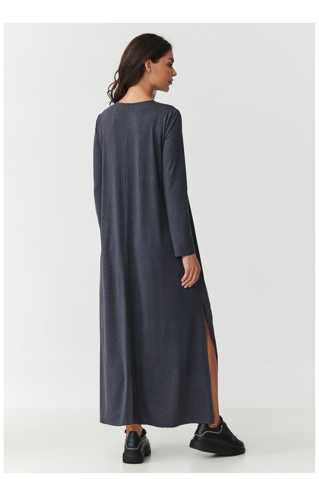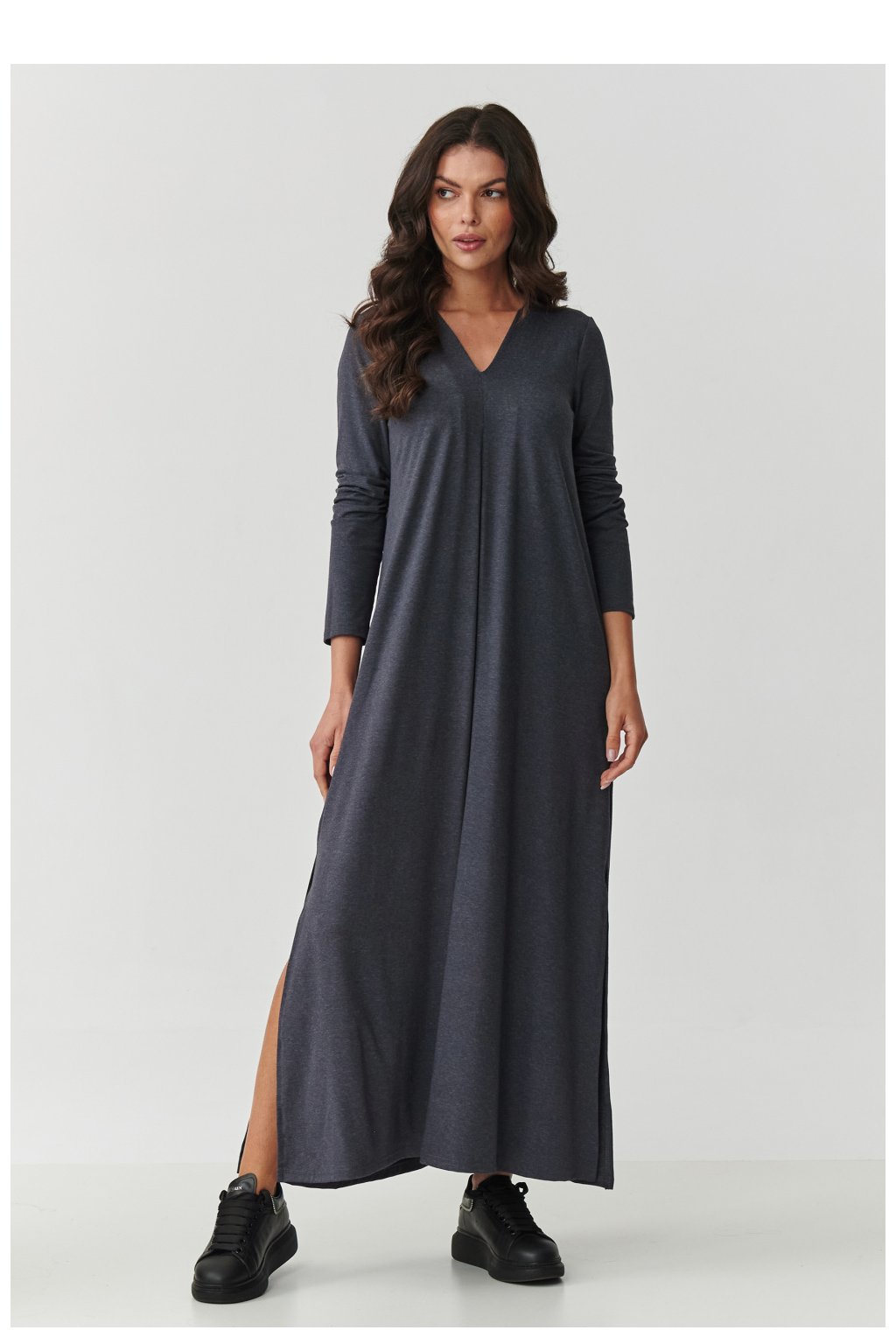 Vsadíte na nadčasovou klasiku a maximální pohodlí! Naše dlouhá maxi šaty vyrobené z vysoce kvalitní viskózy s přídavkem elastanu jsou ideální volbou jak pro každodenní nošení, tak i na speciální příležitosti. Díky přírodní prodyšnosti viskózy a pružnosti látky se šaty krásně přizpůsobí postavě, neomezují pohyb. Model má výstřih ve tvaru V, který decentně zdůrazňuje ženské tvary, a lehce rozšířený střih s rozparkem na bocích dodává lehkost a moderní charakter. Dlouhé rukávy zaručují, že se šaty hodí na každou roční dobu - můžete je nosit jak na jaře a v létě, tak i na podzim a v zimě ve spojení s botami nebo kozačkami. K dispozici jsou ve stylových barvách: čokoládová - hluboký, elegantní odstín, který zdůrazňuje krásu a dodává třídu, černá - nadčasová klasika, nenahraditelná v každé skříni, khaki - stylová a univerzální barva v militaristickém stylu a antracit - hluboký, tmavě šedý odstín ideální pro elegantní i každodenní stylizace. Tyto maxi šaty jsou skvělou volbou pro ženy, které ocení pohodlí, minimalismus a elegantní styl. Skvěle vypadají jak s sportovními teniskami, tak s elegantními podpatky.Viskóza 95 %