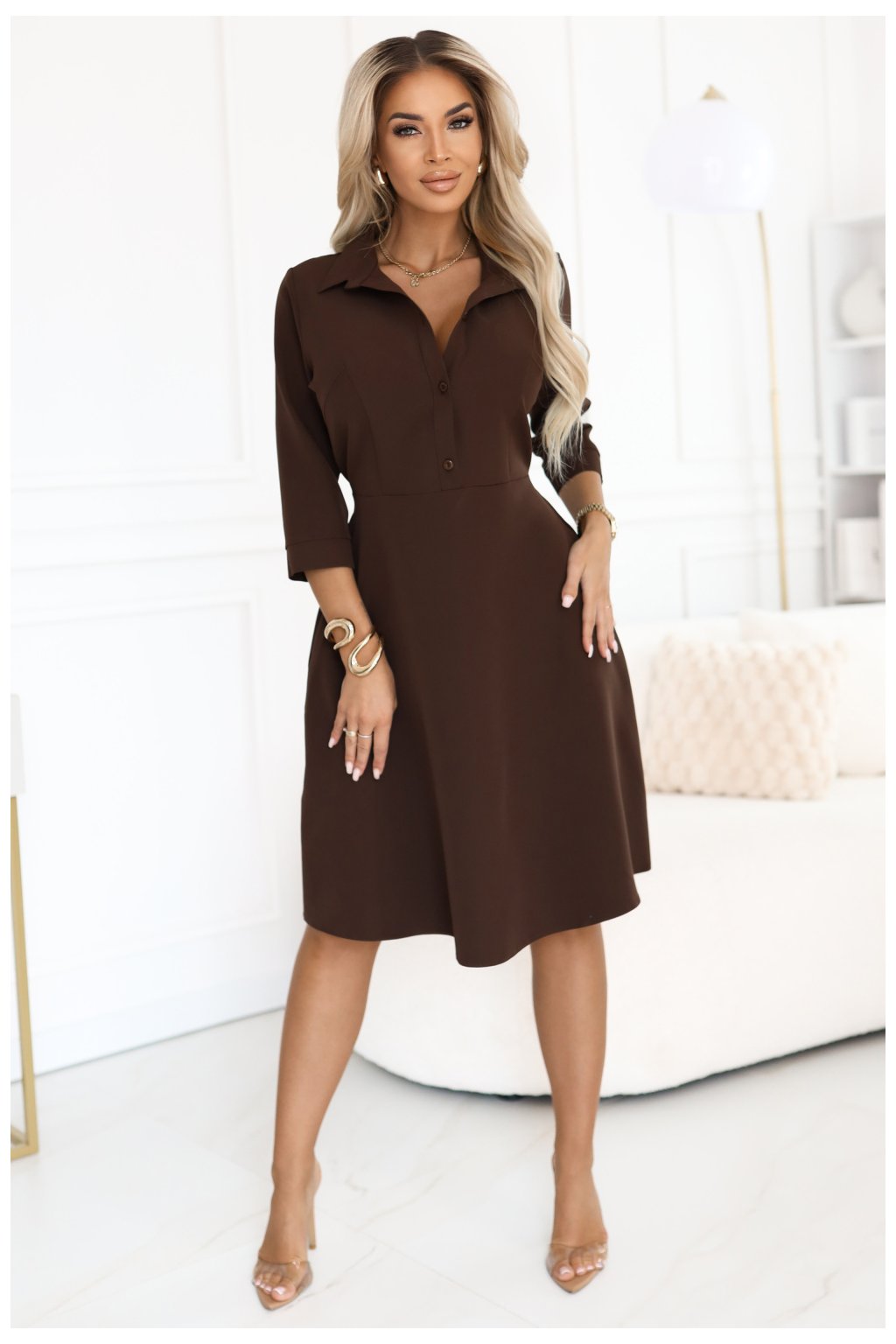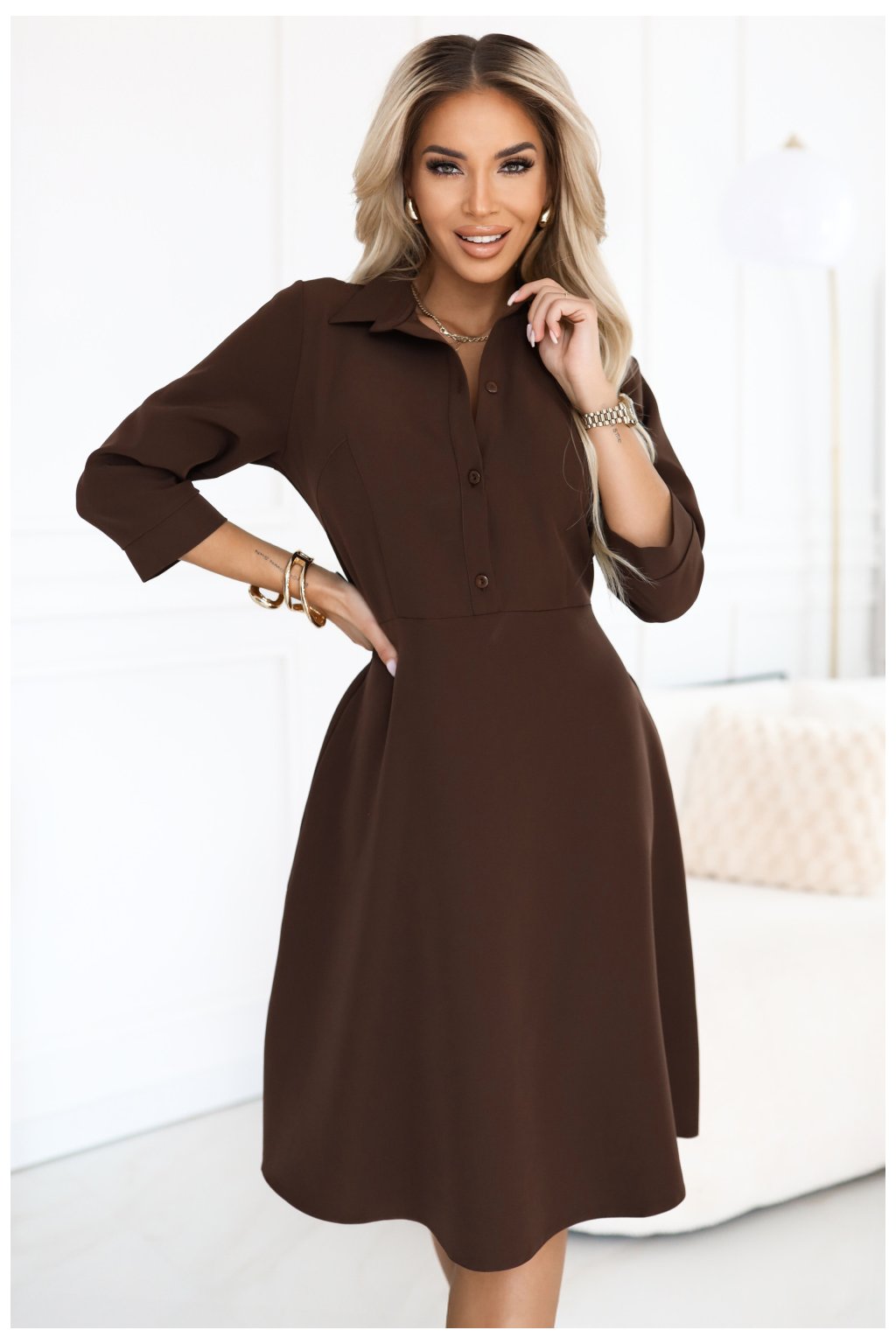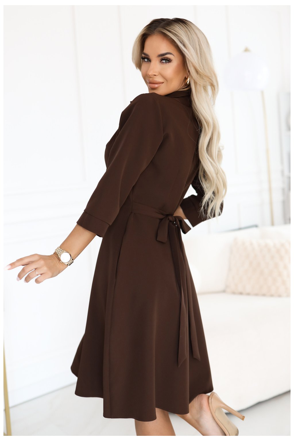 Elegantní midi sako značky Numoco v odstínu hluboké čokolády je ideální volbou do práce i na každý den. Klasický límec a knoflíkové zapínání zúží postavu, lehce rozšířený spodek krásně pracuje v pohybu. Šněrování vzadu umožňuje přizpůsobit pas, 3/4 rukáv a kapsy zaručují pohodlí. Polský produkt.Polyester 95 %