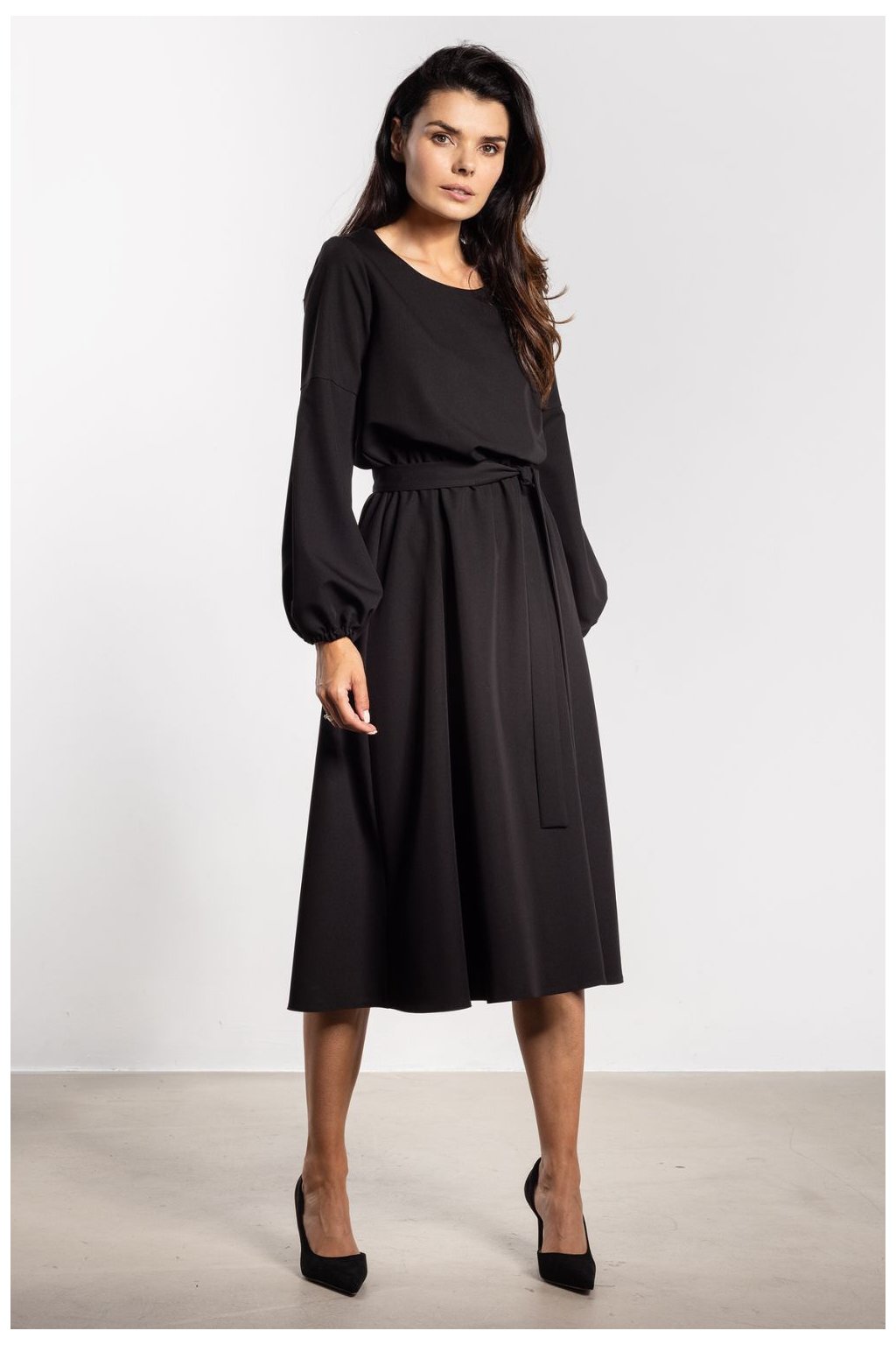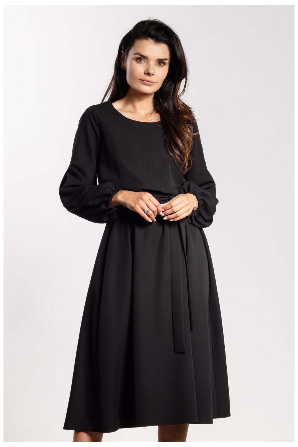 Sukně midi s volným střihem kombinuje pohodlí s elegancí. Guma v pasu se přizpůsobí postavě a dodaný pásek navíc zdůrazní ženské tvary. Dlouhé nadýchané rukávy s jemným nažehlením dodávají lehkost a jednoduchý kulatý výstřih dělá model univerzálním a elegantním. Lehce rozkročený spodek a délka nad koleno dodávají stylizaci třídy a volnosti, činíce šaty vhodnými jak na každodenní nošení, tak na elegantní příležitosti.Polyester 60 %