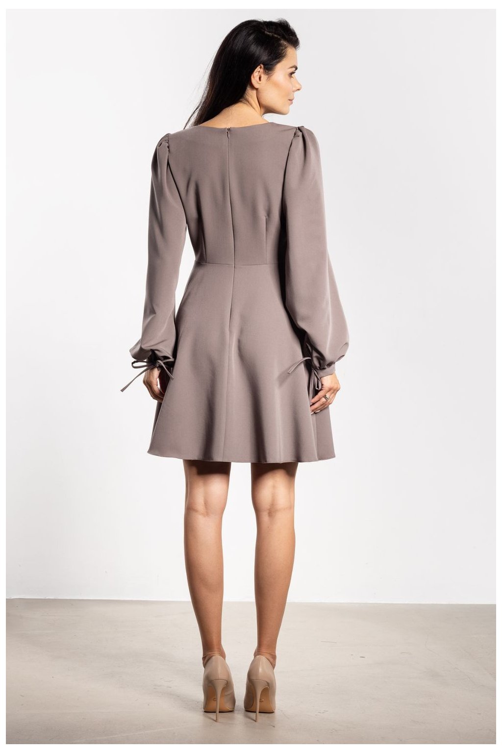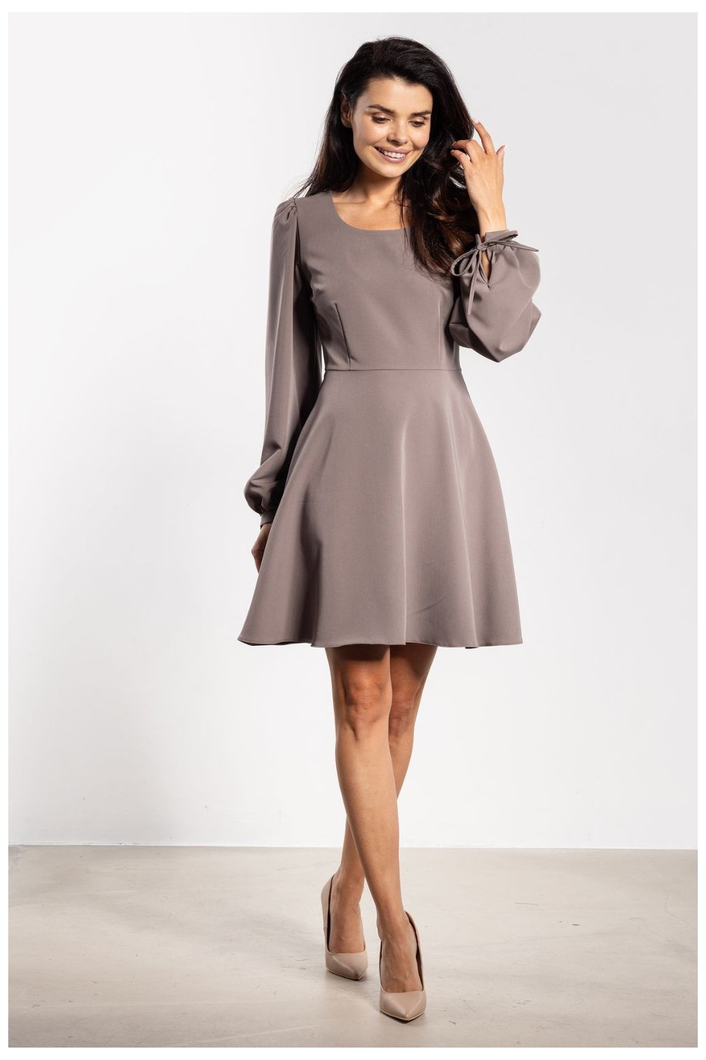 Šaty mini s rozšířeným střihem spojují eleganci s lehkostí. Polokruhový výstřih jemně zdůrazňuje krk a ramena, a ozdobný šňůrování dodává celku půvabný charakter. Dlouhé nafouklé rukávy ukončené manžetou s gumou přidávají lehkosti a ženského šarmu. Rozkvetlý spodek se jemně skládá v pohybu, poskytujíc volnost a elegantní efekt. Model se hodí jak na společenská setkání, tak i na elegantní události.Polyester 60 %