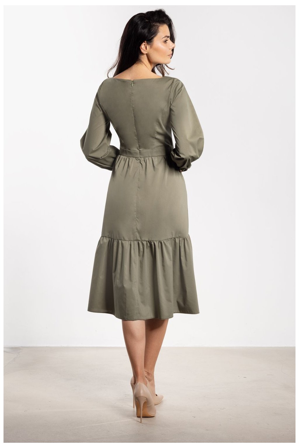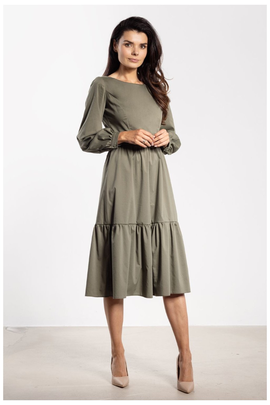 Elegantní midi šaty s rozšířeným střihem spojují eleganci s ženským půvabem. Přizpůsobený vršek jemně zdůrazňuje postavu a pasový řez dodává harmonické proporce. Rozšířený spodek s širokou volánem se lehce skládá při každém pohybu, přinášejíc romantický akcent. Dlouhé rukávy s manžetami a knoflíkem přidávají eleganci a délka pod kolena zajišťuje, že šaty budou vhodné jak do každodenního života, tak na oficiální události.Nylon 55 %