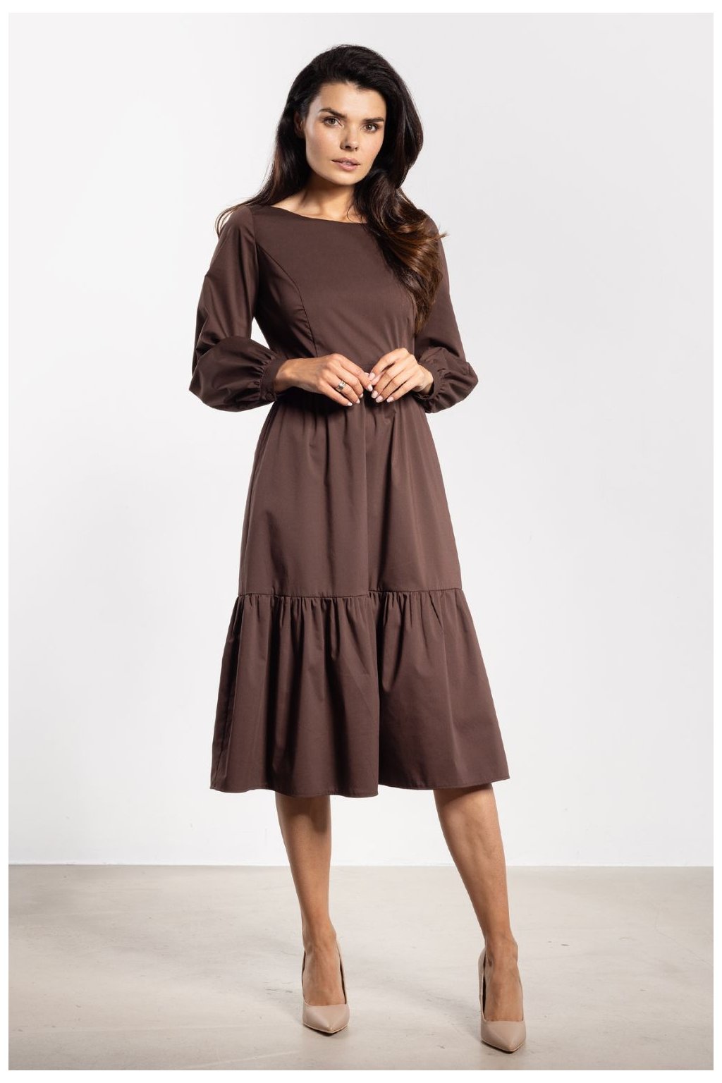 Elegantní midi šaty s rozkročeným střihem spojují eleganci s ženským šarmem. Přizpůsobený vrchní díl jemně zdůrazňuje postavu a pasové střihy dodávají harmonické proporce. Rozkročená sukně s širokým volánem se lehce skládá s každým pohybem, přinášejíc romantický akcent. Dlouhé rukávy s manžetami a knoflíkem přidávají eleganci, a délka nad koleno zajišťuje, že šaty budou vhodné jak na každý den, tak na oficiální události.Nylon 55 %