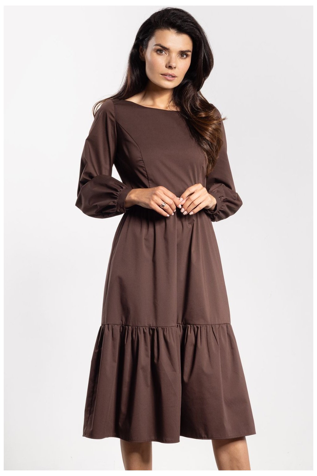 Parádní model volných šatů svázaných v pase. Delší záda a volánek ve výstřihu zdůrazňují ženské tvary. Boční rozparky pro elegantní a šik vzhled.