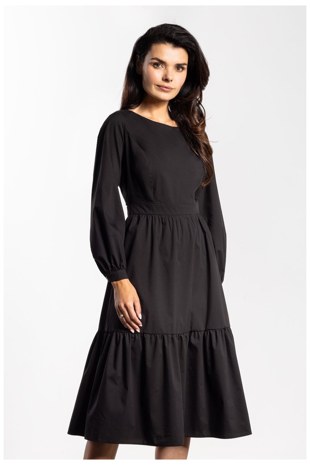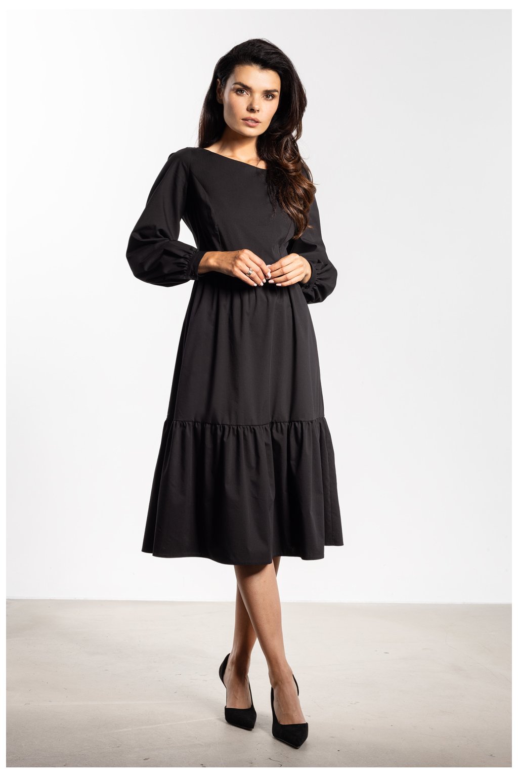 Elegantní středně dlouhé šaty s rozšířeným střihem spojují eleganci s ženským půvabem. Přizpůsobený vršek jemně zdůrazňuje postavu a pasový řez dodává harmonické proporce. Rozšířený spodek s širokým volánem se lehce skládá při každém pohybu, přinášejíc romantický akcent. Dlouhé rukávy s manžetami a knoflíkem přidávají eleganci, a délka pod koleno zajišťuje, že šaty jsou vhodné jak do každodenního nošení, tak na oficiální události.Nylon 55 %