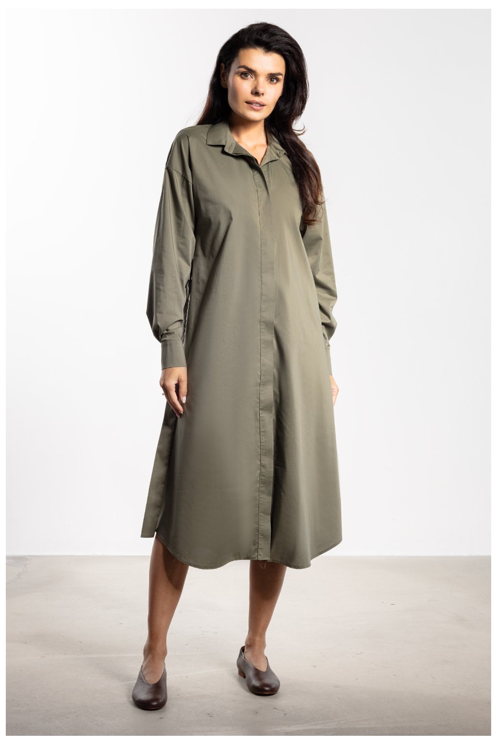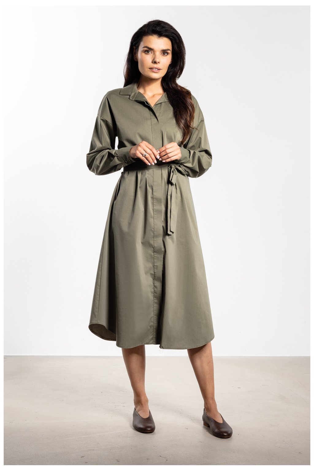 Šaty midi s košilovým střihem kombinují klasiku s pohodlím. Jednoduchá linie s knoflíky po celé délce zaručuje, že se tento model hodí na mnoho příležitostí. Klasický límec a dlouhé rukávy s manžetami zdůrazňují elegantní charakter. Pásek ze stejného materiálu umožňuje nosit šaty volně nebo svázané v pase, zdůrazňující ženské proporce siluety. Délka nad kolena jí dodává univerzálnost ideální pro práci, setkání a výjimečné příležitosti.Nylon 55 %