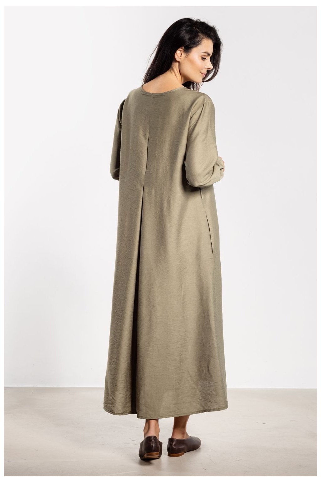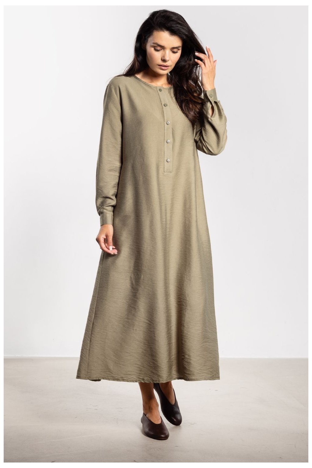 Maxi šaty s jednoduchým střihem A spojují eleganci s pohodlím na každý den. Délka po kotníky jemně prodlužuje postavu a minimalistický střih vypadá moderně. Vpředu je řada drobných knoflíků, které dodávají lehkost. Pásek ze stejného materiálu umožňuje nosit šaty volně nebo zdůraznit pas, což vystavuje ženské proporce. Dlouhé rukávy s manžetami zajišťují pohodlí a nadčasový charakter, díky čemuž se model hodí jak do každodenních, tak do elegantních stylizací.Rayon 80 %