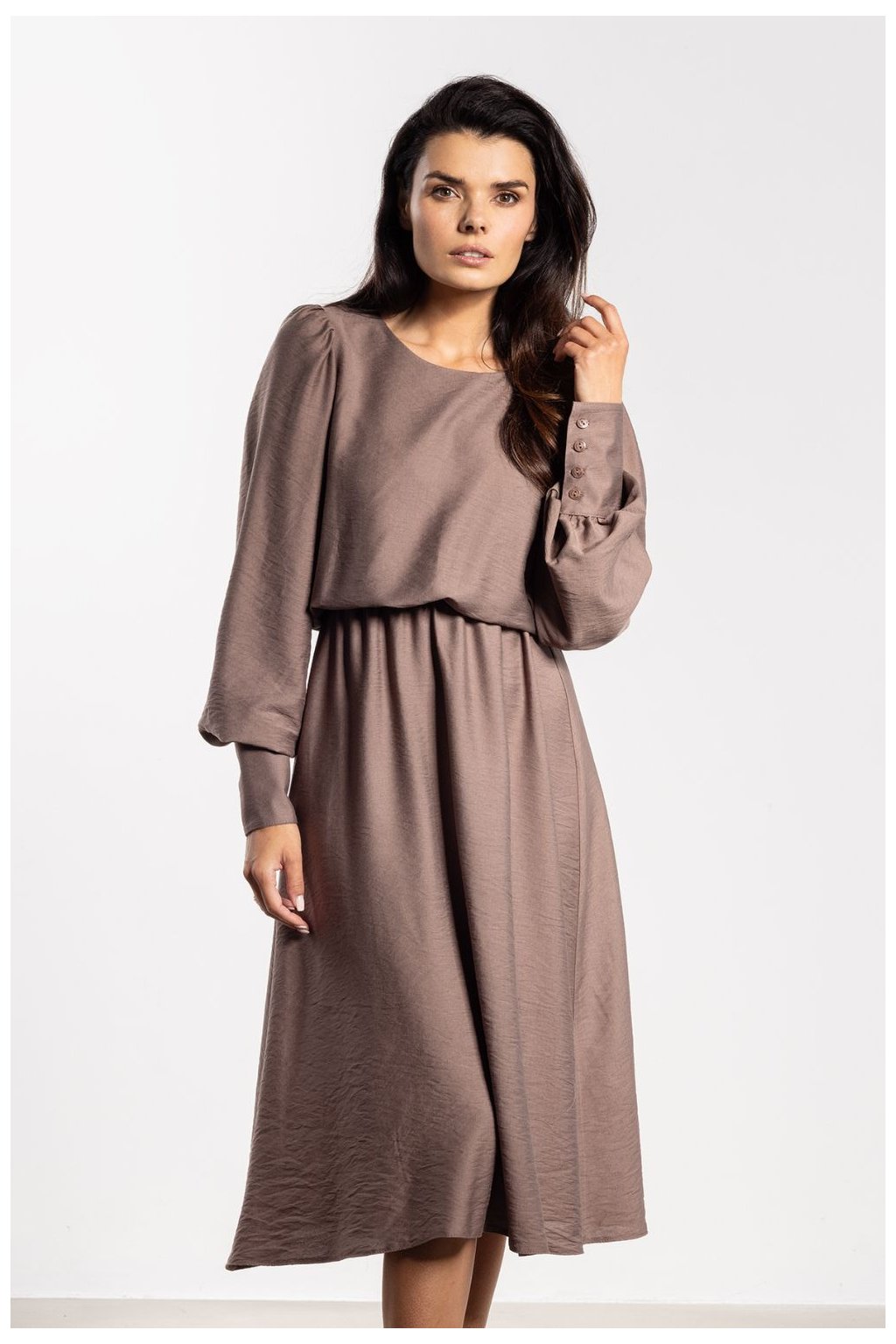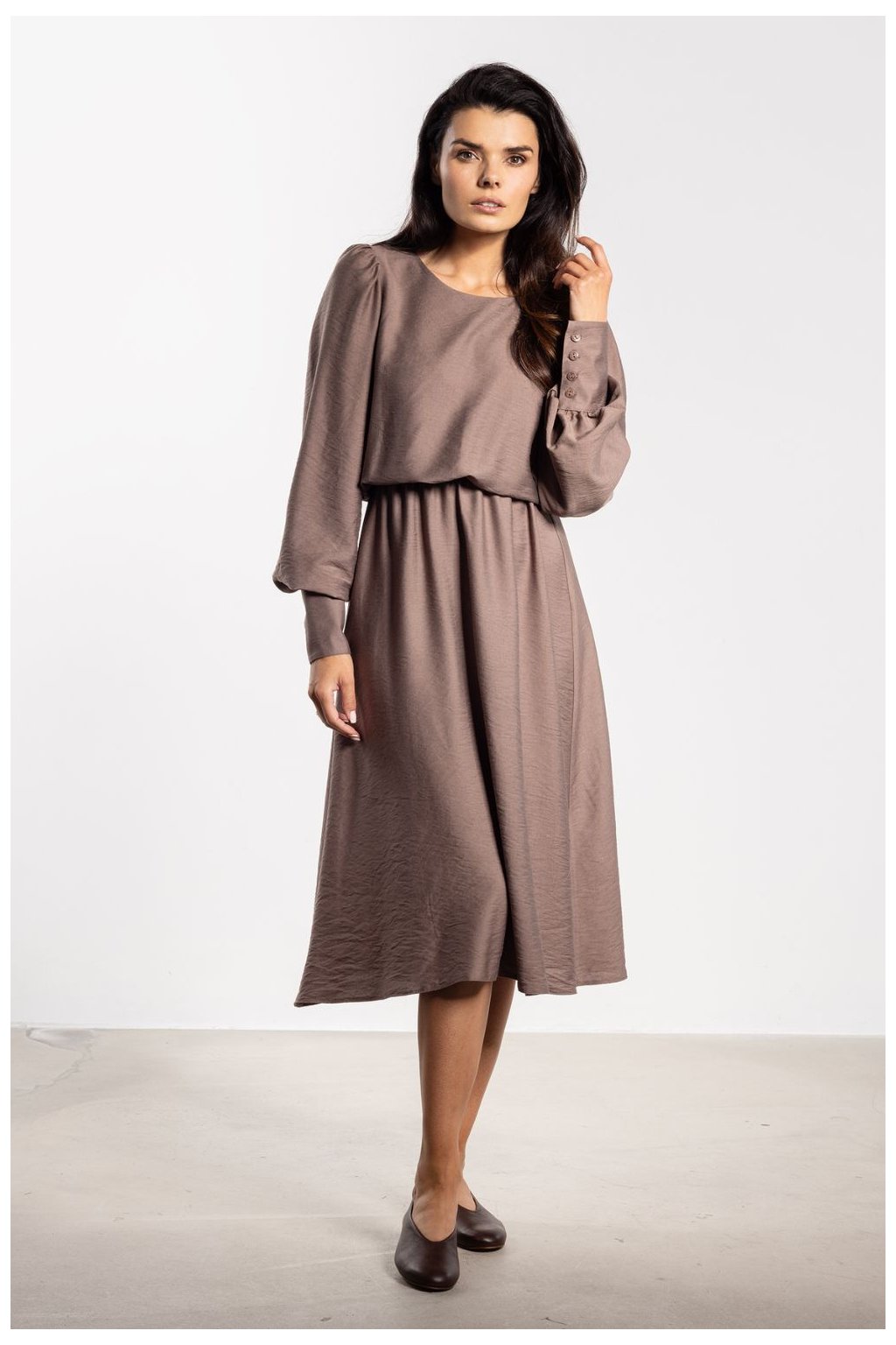 Elegantní midi šaty s volným střihem spojují pohodlí s ženským stylem. Volnější horní část ladí s elastickým pasem, který zdůrazňuje pas a postavu. Dlouhé rukávy s širokými manžetami a knoflíky přidávají eleganci a zaoblený výstřih zajistí nadčasový vzhled. Délka po kolena dělá šaty vhodné jak na každý den, tak na formálnější události, zachovávající klasický a elegantní charakter.Rayon 80 %