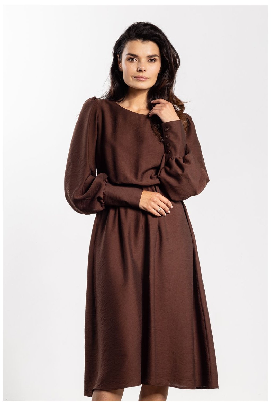Elegantní midi šaty s volným střihem spojují pohodlí s ženským stylem. Volnější horní část ladí s elastickým pasem, který zdůrazňuje pas a postavu. Dlouhé rukávy s širokými manžetami a knoflíky dodávají eleganci a zaoblený výstřih zajišťuje nadčasový vzhled. Délka nad koleno dělá šaty vhodné jak na každý den, tak na formální příležitosti, zachovávající klasický a elegantní charakter.Rayon 80 %