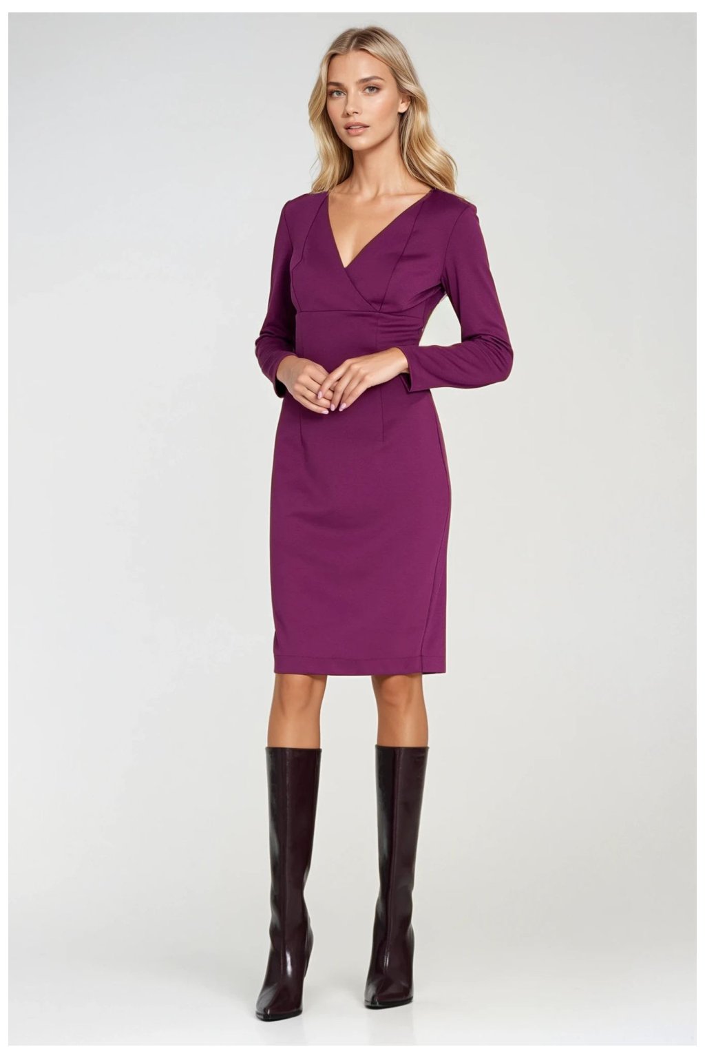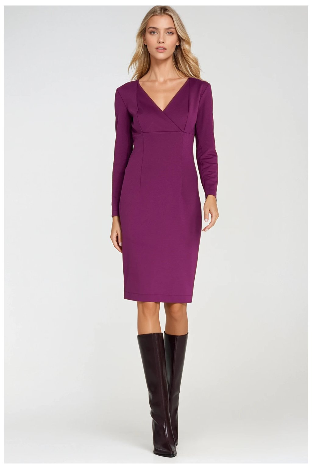 Elegantní šaty s přiléhavým střihem, vyrobené z měkké a elastické pleteniny, která se dokonale přizpůsobuje postavě. Model s přesýpacím dekoltem ve tvaru písmene V, jemně zdůrazňujícím ženskou linii krku a dekoltu. Šaty mají dlouhé rukávy a úzkou spodní část, což vytváří klasickou a nadčasovou siluetu. Zapínají se na skrytý zip vzadu uprostřed, což zajišťuje estetické provedení. Délka ke kolenům z nich činí model ideální volbu jak do práce, tak na speciální příležitosti.Polyester 38 %