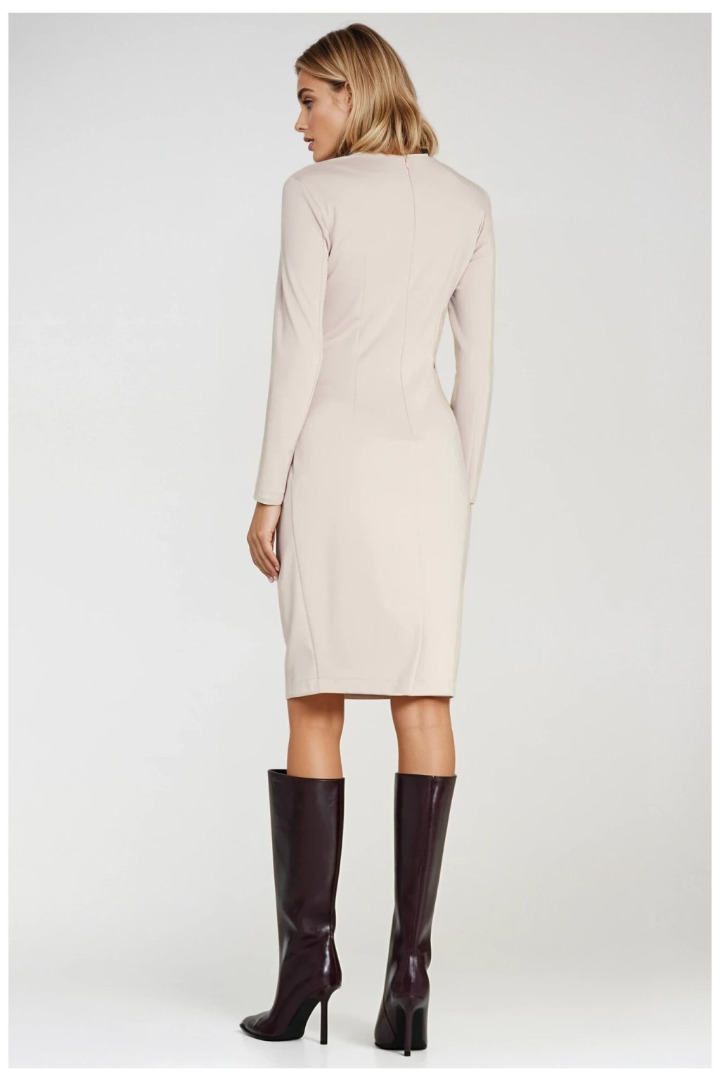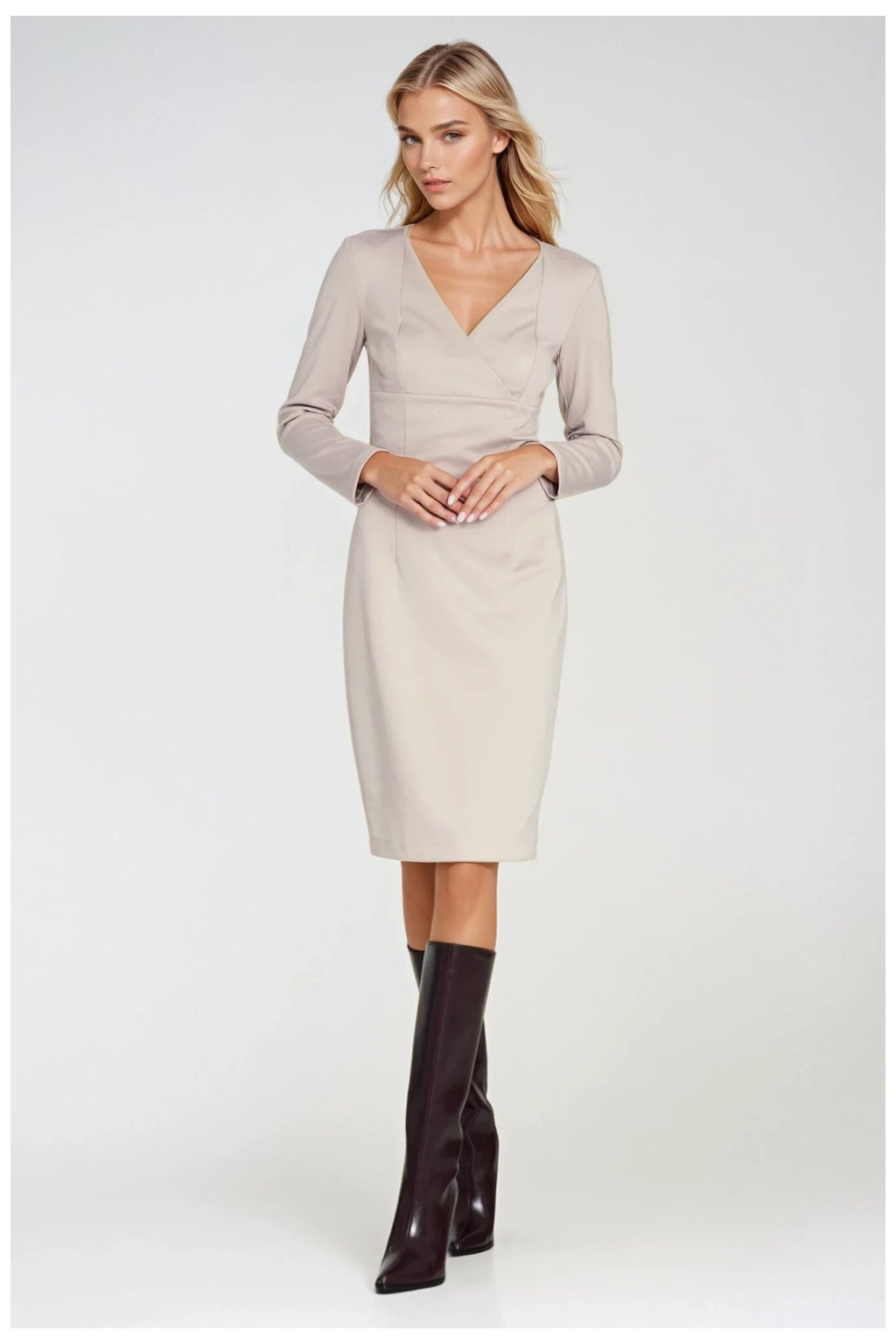Elegantní šaty s přiléhavým střihem, vyrobené z měkké a elastické pleteniny, která skvěle padne na postavě. Model s přesahujícím výstřihem ve tvaru písmene V, jemně zdůrazňující ženskou linii krku a dekoltu. Šaty mají dlouhé rukávy a úzkou dolní část, co vytváří klasickou, nadčasovou siluetu. Zapínají se vzadu na skrytý zip umístěný uprostřed, což zajistí estetické provedení. Délka po kolena zaručuje, že model se skvěle hodí jak do pracovních outfitů, tak na speciální příležitosti.Polyester 38 %