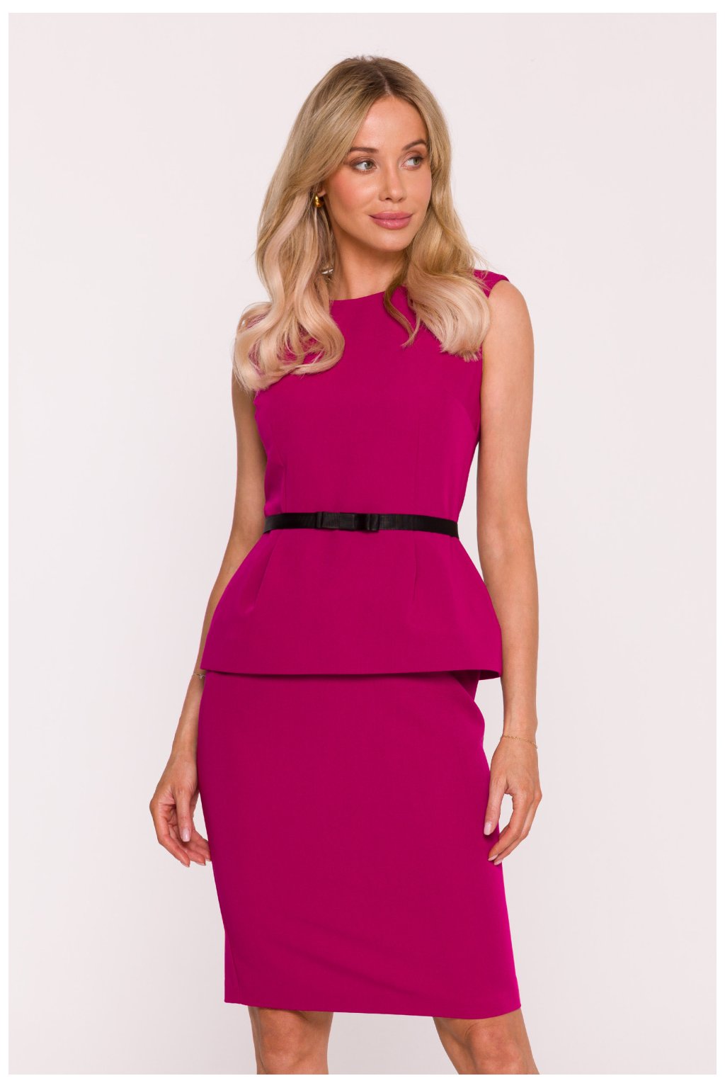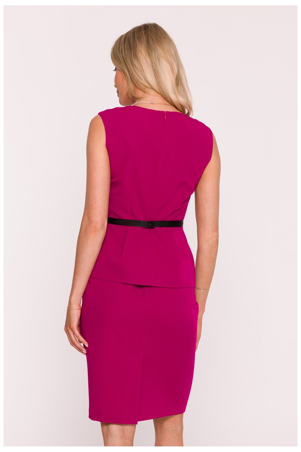 Elegantní úzký šaty s náplastí jsou klasikou v moderním provedení. Vyrobeny z hladké, příjemné látky na podšívce krásně zdůrazňují ženskou siluetu a zároveň poskytují pohodlí při nošení. Model má jemný, polokruhový výstřih a bezrukávový střih, který se skvěle hodí jak do kanceláře, tak na elegantní události. Pas je jasně označen páskem a subtilní náplastí, která opticky tvaruje siluetu a jemně zakrývá oblast boků a břicha. Spodek šatů má přiléhavý úzký střih, který zdůrazňuje nohy a dodává celku klasický charakter. Na zádech jsou dva skryté zipy, díky nimž se šaty ideálně přizpůsobí postavě. Celkový vzhled doplňuje tenký pás v kontrastní barvě, zapínán na knoflík, stylový detail, který přidává charakteru. Navrženo a ušito v Polsku s důrazem na detaily a vysokou kvalitu provedení.Polyester 65 %