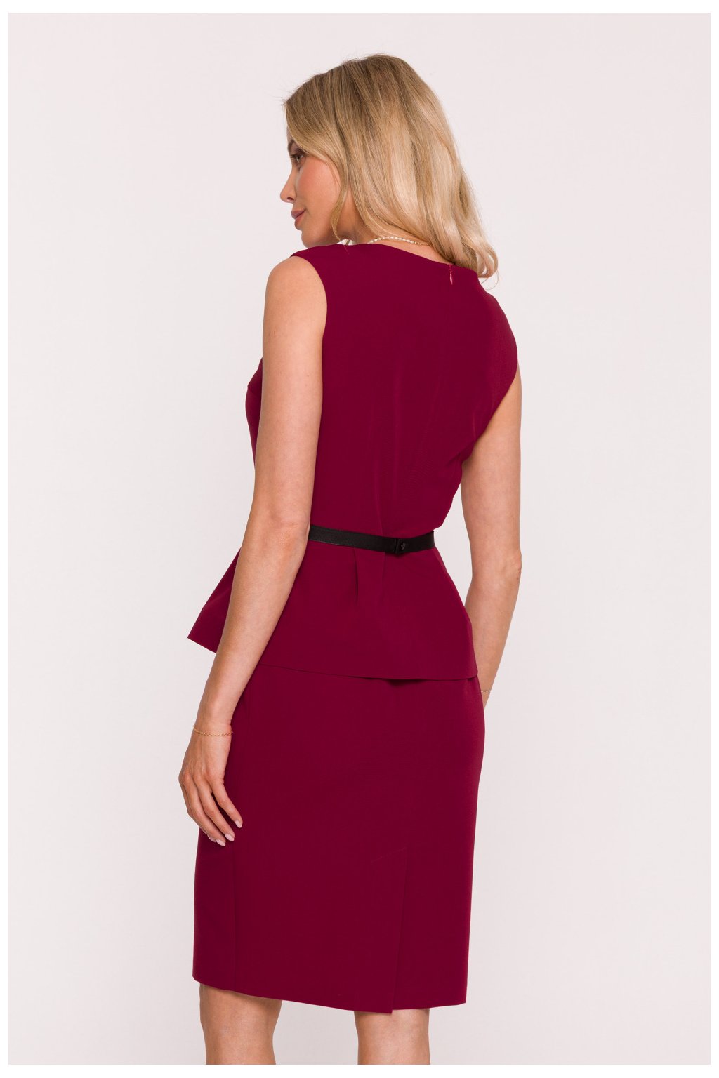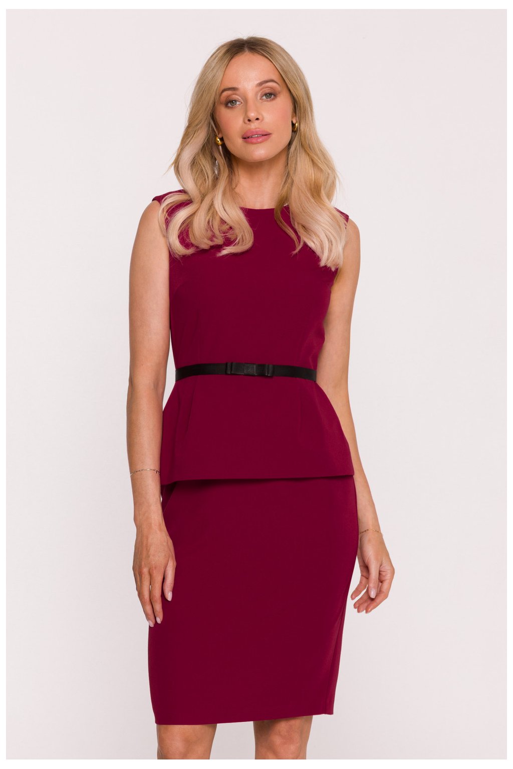 Elegantní úzké šaty s baskinkou jsou klasikou v moderním provedení. Vyrobené z hladké, příjemné látky na podšívce, krásně zdůrazňují ženskou postavu a zároveň poskytují pohodlí při nošení. Model má jemný polooblý výstřih a bezrukávový střih, který se skvěle hodí jak do kanceláře, tak na elegantní události. Pas je jasně zdůrazněn páskem a subtilní baskinkou, která opticky modeluje postavu a jemně zakrývá oblasti boků a břicha. Spodek šatů má přiléhavý úzký střih, který zdůrazňuje nohy a dodává celku klasický charakter. Na zádech jsou dva skryté zipy, díky nimž se šaty dokonale přizpůsobí postavě. Celou věc doplňuje tenký pás v kontrastní barvě, zapínající se na knoflík, stylový akcent, který dodává charakteru. Navrženo a ušito v Polsku s důrazem na detaily a vysokou kvalitu zpracování.Polyester 65 %