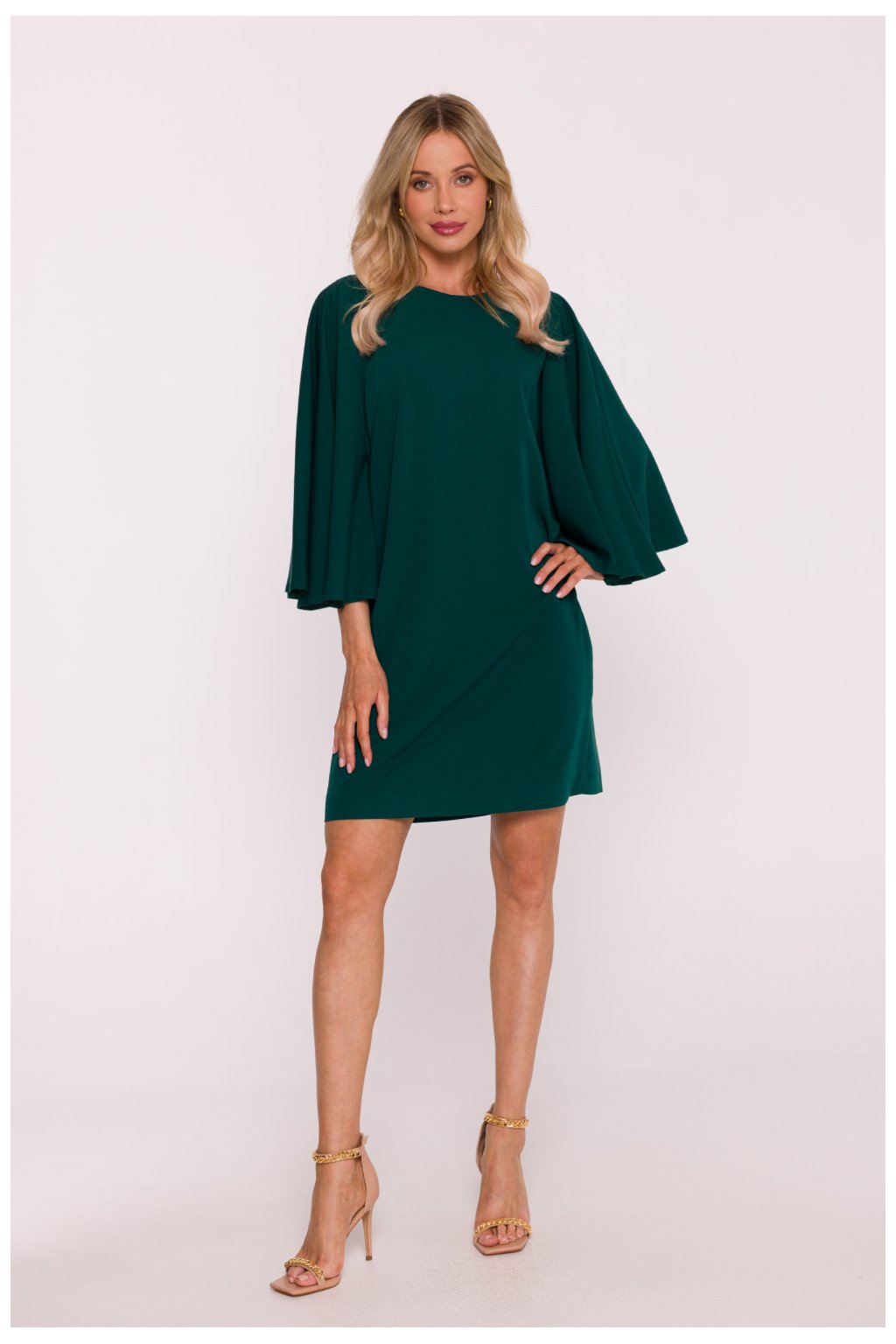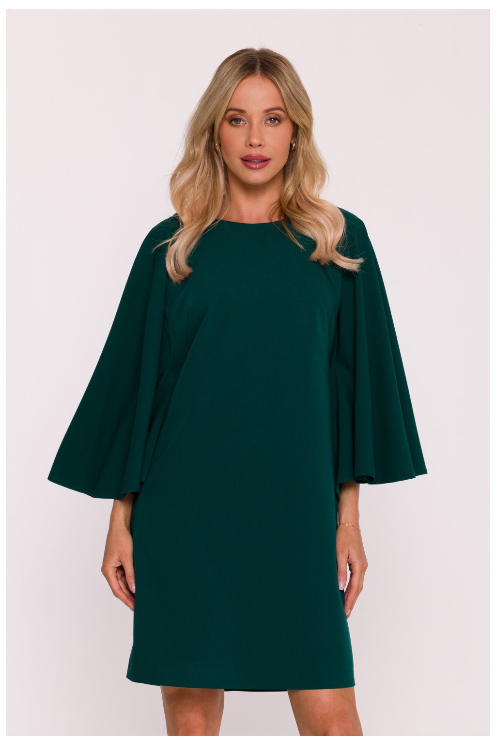 Elegantní šaty ve tvaru trapezu, vyrobené z hladké, příjemné látky na dotek. Model vyniká efektními širokými rukávy typu netopýr délky 3/4, které dodávají celku lehkost a jemný charakter. Polo-kulatý výstřih zdůrazňuje ženskou siluetu jemným způsobem, a volná pas zapewňuje pohodlné nošení a nevystavuje postavu. Spodek šatů je rovný, co ve spojení s volným vrškem vytváří harmonický, elegantní celek. Šaty se zapínají na skrytý zip na zádech, takže vypadají mimořádně esteticky. Délka mini nad koleno jí dodává moderní charakter, činíce ji ideální volbou jak na elegantní večírky, tak i na méně formální setkání. Navrženo a ušito v Polsku s důrazem na každý detail.Polyester 65 %
