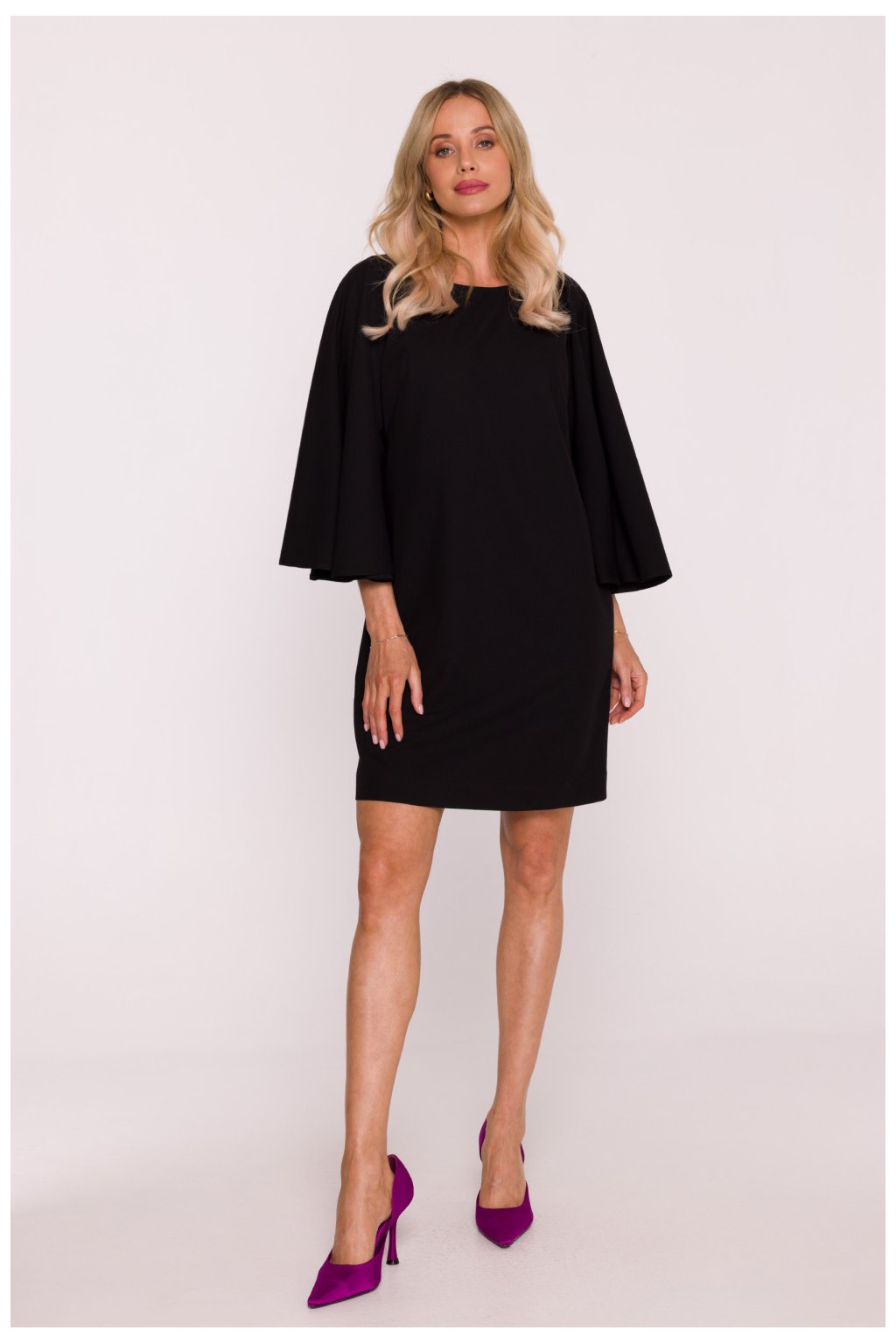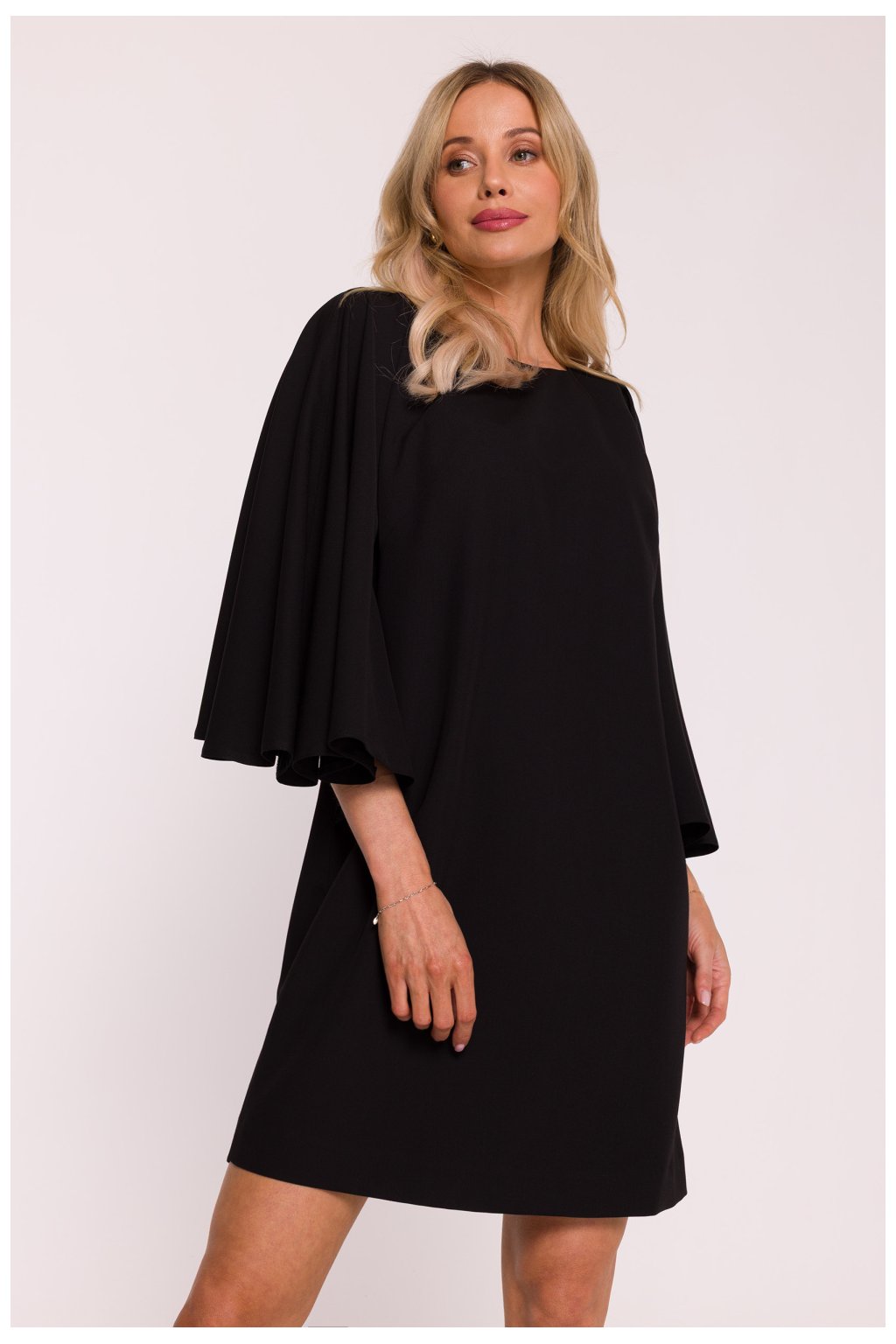 Elegantní šaty ve tvaru trapezu, vyrobené z hladké, příjemné látky k doteku. Model vyniká efektními širokými rukávy typu netopýr s délkou 3/4, které dodávají celku lehkost a jemný charakter. Polokruhový výstřih zdůrazňuje ženskou siluetu jemným způsobem, a volná pas zapewňuje pohodlí nošení a neštíhlí postavu. Spodek šatů je rovný, co ve spojení s volným vrchem vytváří harmonický, elegantní celek. Šaty se zapínají na skrytý zip na zádech, díky čemuž vypadají mimořádně esteticky. Délka mini před koleno jí dodává moderní charakter, čímž se stává ideální volbou jak na elegantní večírky, tak na méně formální setkání. Navrženo a ušito v Polsku s péčí o každý detail.Polyester 65 %