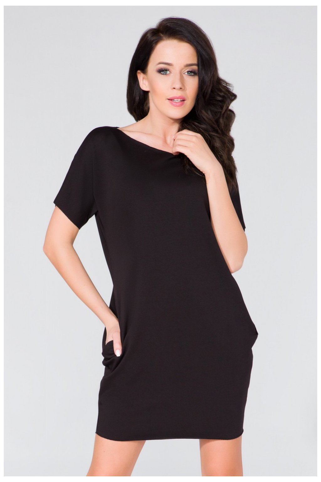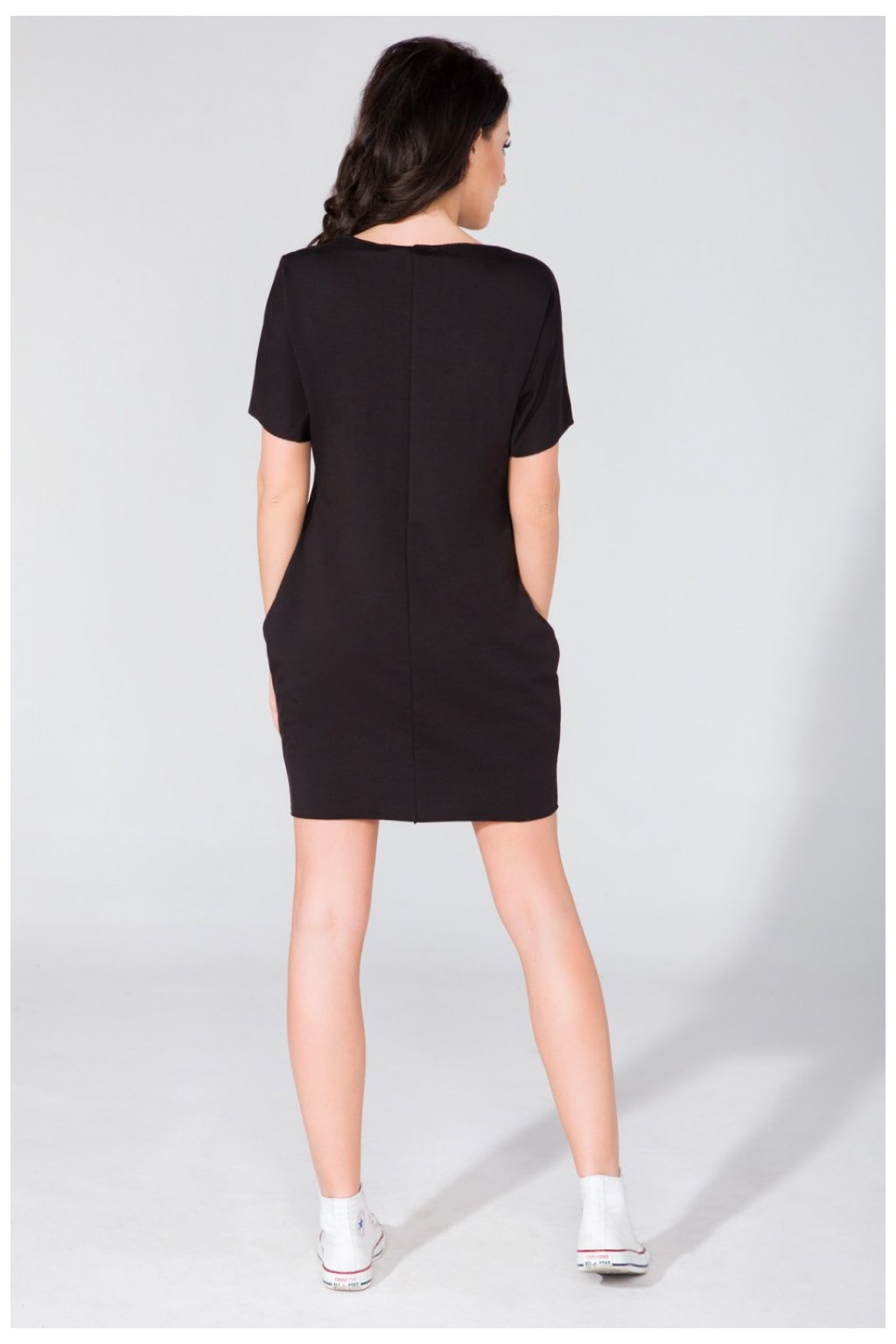 Šaty širokého střihu s kapsami na bocích. Výstřih, rukávy a spodní část zůstaly nezpracované.Složení: 70 % bavlna, 22 % polyester, 8 % elastan.