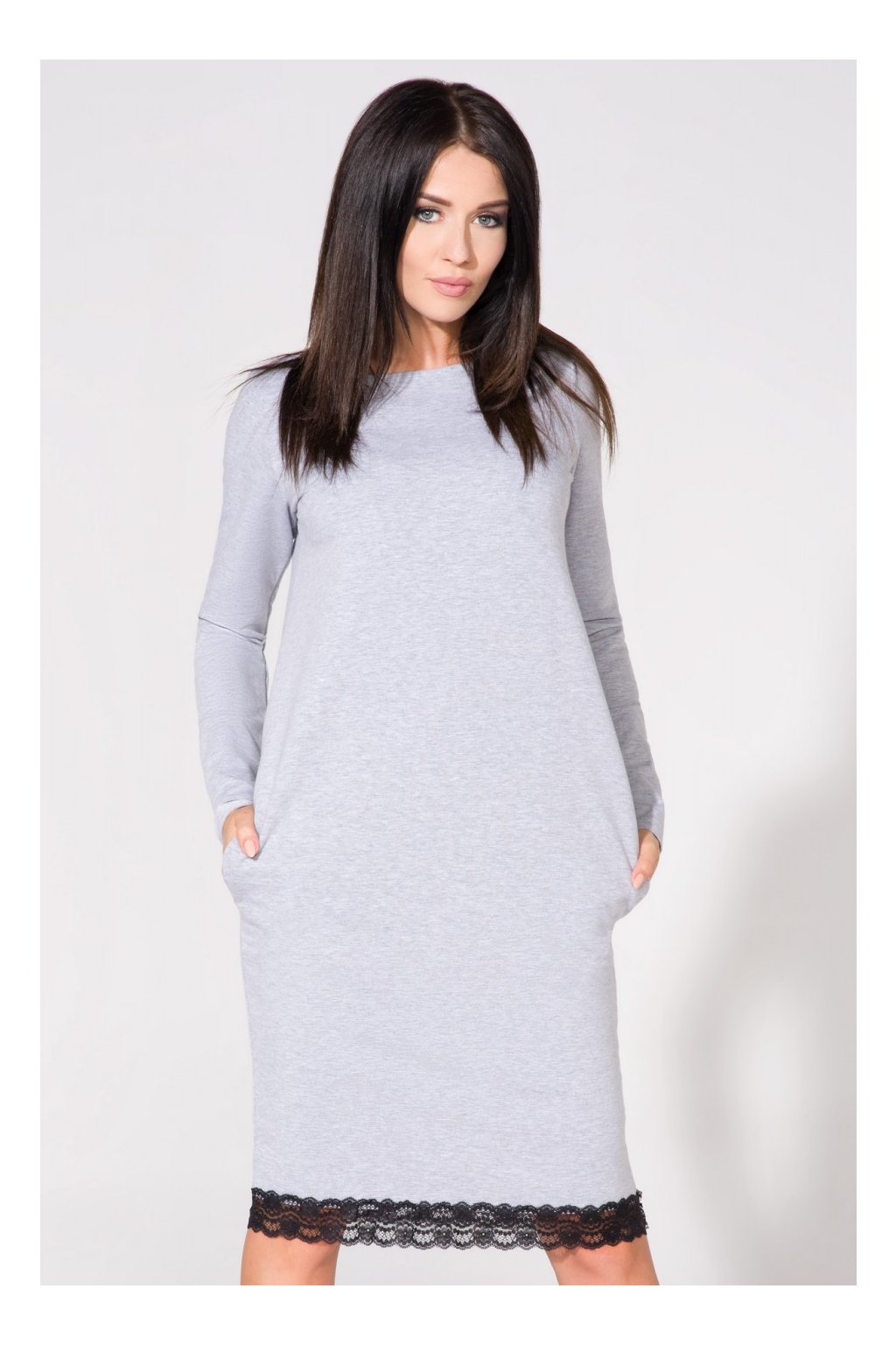 Šaty v pletené mikině. Ozdobná slza na zadní straně se saténovou stuhou uvázanou na mašli. Spodní část je zakončena krajkou a rukávy jsou ponechány v surovém stavu. Na bocích kapsy ve švu.Složení materiálu: 70 % bavlna, 30 % polyester