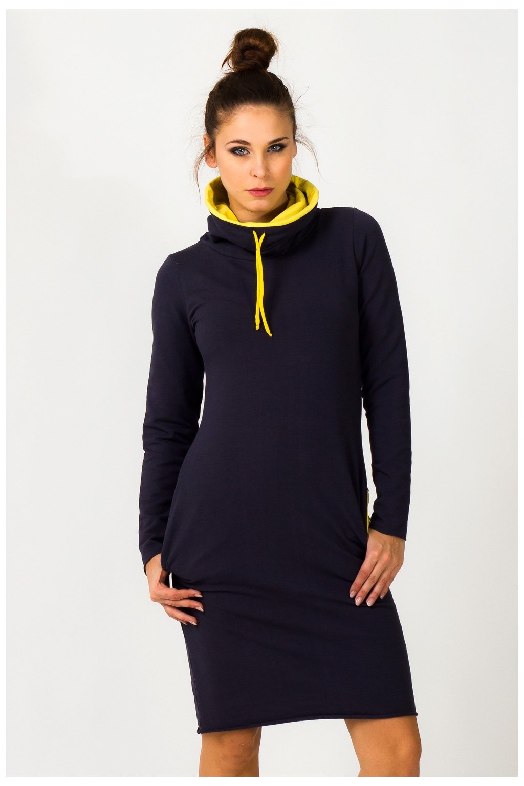 Sportovní šaty s praktickými postranními kapsami z barevné pletené mikiny. Komínový výstřih, který lze ohrnout nahoru nebo dolů a vytvořit tak rolákový efekt, a dlouhé rukávy o délce přibližně 62 cm. Vnitřní část komína v kontrastní barvě. Původní zakončení s neupravenými okraji ve spodní části i na rukávech lze efektně ohrnout, čímž se manipuluje s délkou šatů a rukávů. Výška komína 23 cm.Polyester 30 %