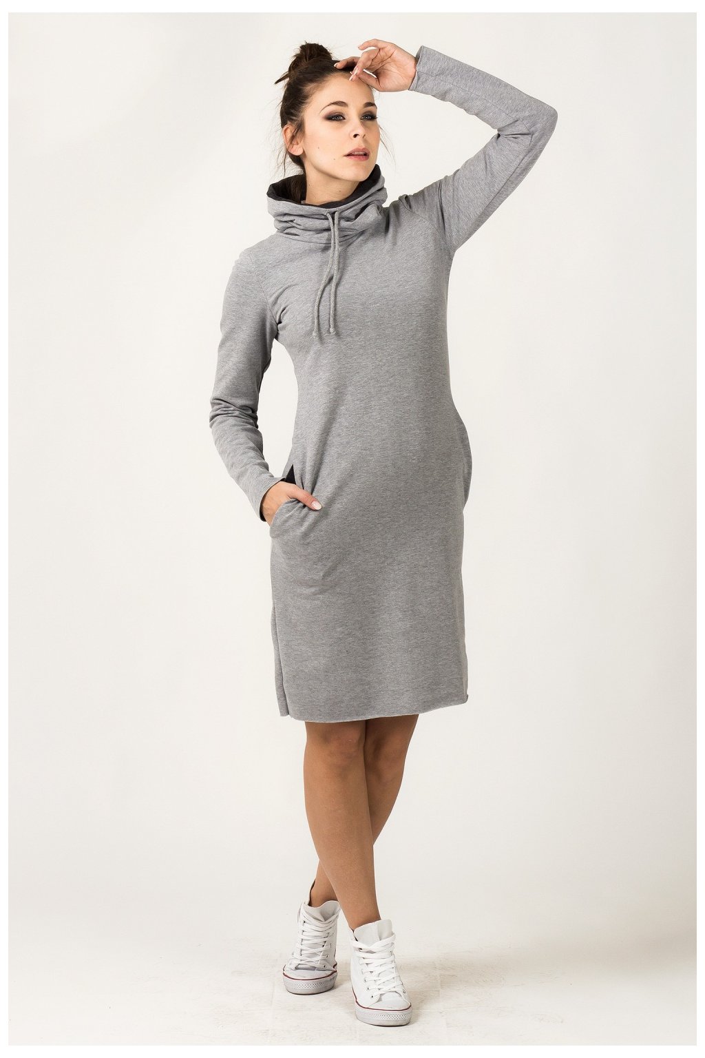 Sportovní šaty s praktickými postranními kapsami z barevné pletené mikiny. Komínový výstřih, který lze ohrnout nahoru nebo dolů a vytvořit tak rolákový efekt, a dlouhé rukávy o délce přibližně 62 cm. Vnitřní část komína v kontrastní barvě. Původní zakončení s neupravenými okraji ve spodní části i na rukávech lze efektně ohrnout, čímž se manipuluje s délkou šatů a rukávů. Výška komína 23 cm.Polyester 30 %