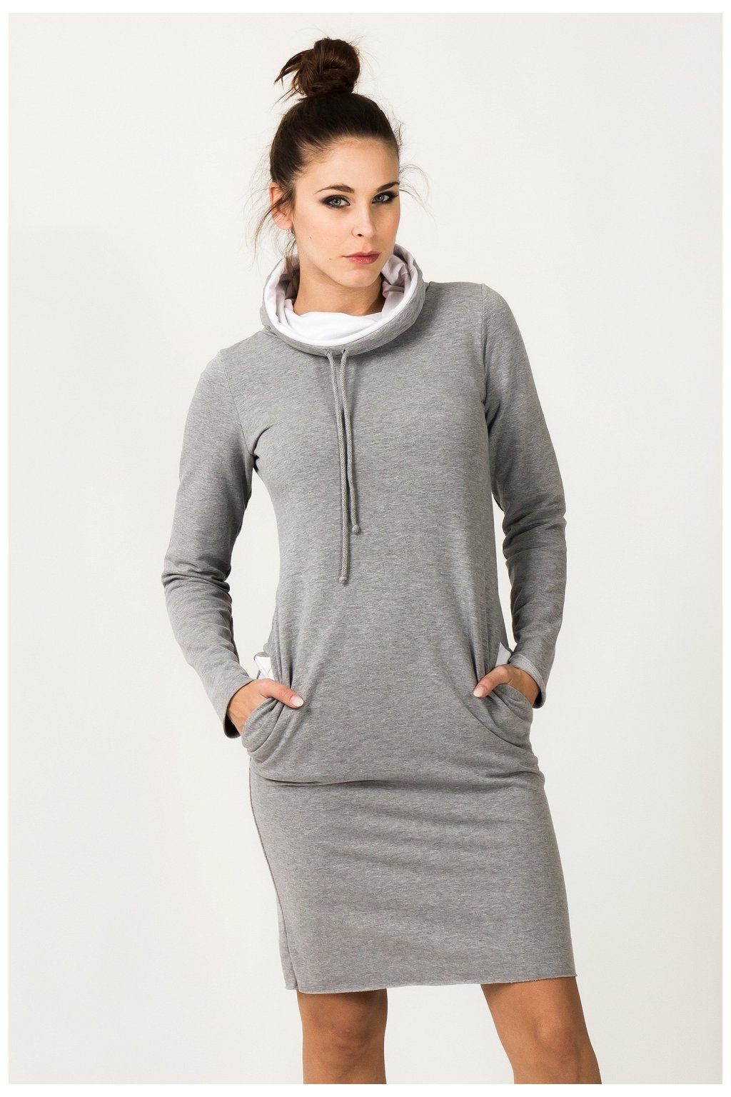 Sportovní šaty s praktickými postranními kapsami z barevné pletené mikiny. Komínový výstřih, který lze ohrnout nahoru nebo dolů a vytvořit tak rolákový efekt, a dlouhé rukávy o délce přibližně 62 cm. Vnitřní část komína v kontrastní barvě. Původní zakončení s neupravenými okraji ve spodní části i na rukávech lze efektně ohrnout, čímž se manipuluje s délkou šatů a rukávů. Výška komína 23 cm.Polyester 30 %