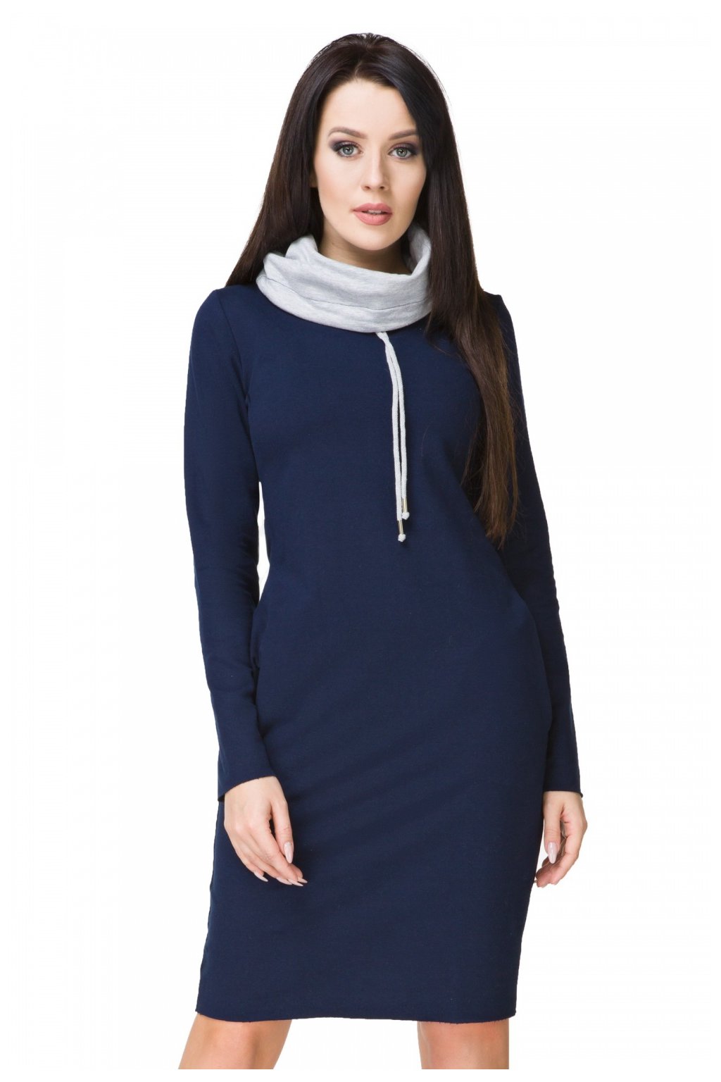 Sportovní šaty s praktickými postranními kapsami z barevné pletené mikiny. Komínový výstřih, který lze ohrnout nahoru nebo dolů a vytvořit tak rolákový efekt, a dlouhé rukávy o délce přibližně 62 cm. Vnitřní část komína v kontrastní barvě. Původní zakončení s neupravenými okraji ve spodní části i na rukávech lze efektně ohrnout, čímž se manipuluje s délkou šatů a rukávů. Výška komína 23 cm.Polyester 30 %