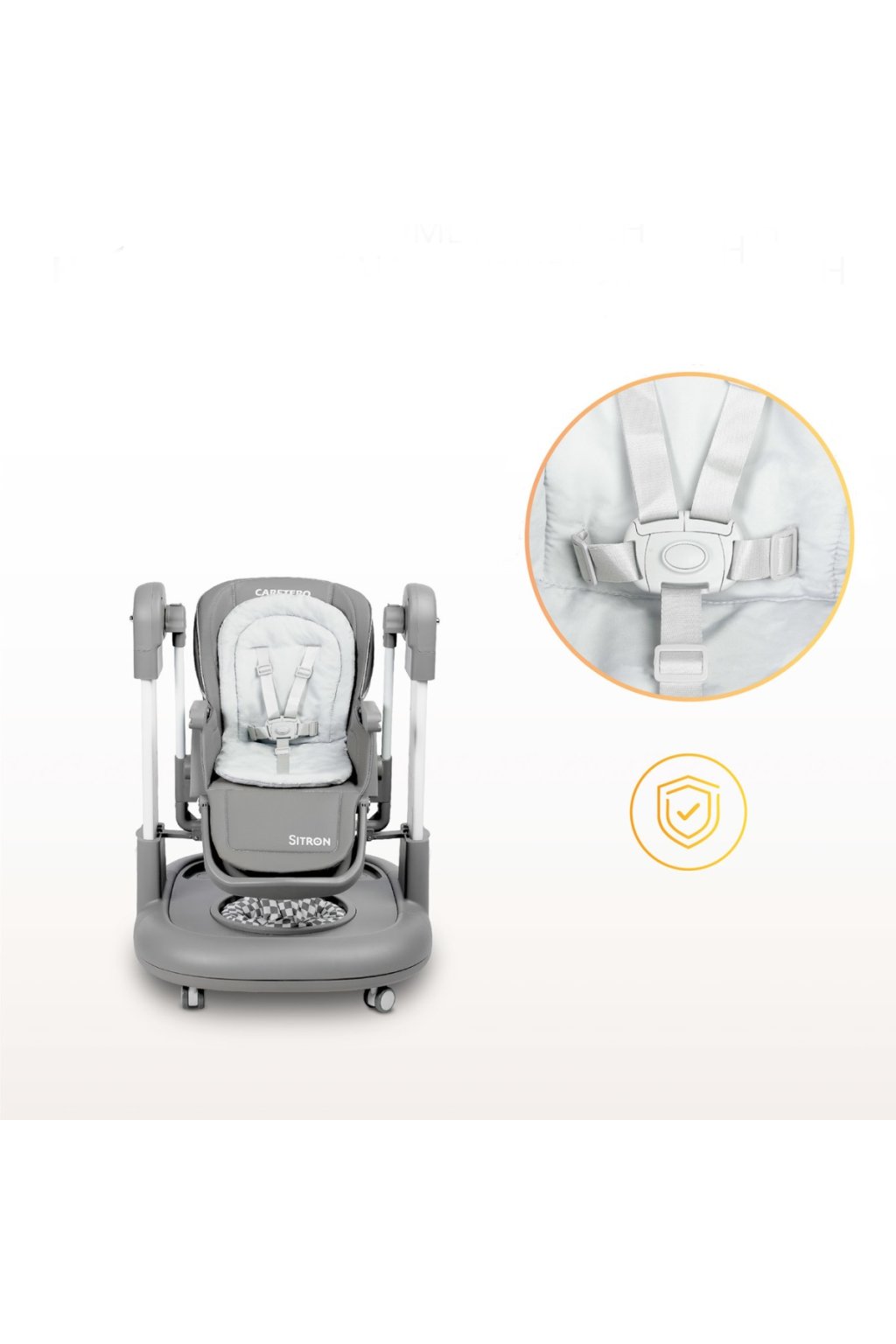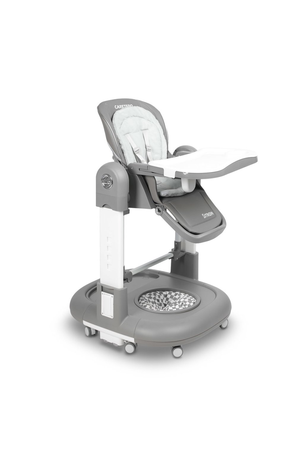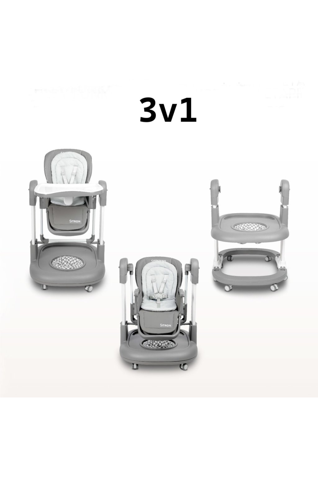 Dětská židlička Sitron 3v1 s funkcí houpačky a chodítka. Křesílko 3v1. Je ideálním řešením pro rodiče, kteří hledají praktický, prostorově úsporný a multifunkční produkt. Jeden výrobek nabízí hned tři klíčové funkce. Doprovází dítě od prvních měsíců až po období, kdy objevuje svět samostatně. Židlička je určena pro děti od 6 do 36 měsíců s maximální nosností 15 kg. Bezpečnost na prvním místě. Vaše dítě bude vždy v bezpečí díky pásům, které jej pevně udrží v sedací části. Kolečka s brzdou zajišťují stabilitu. Zaoblené hrany minimalizují riziko poranění a zvyšují komfort i bezpečnost. Houpačka pro nejmenší. Židličku lze snadno přeměnit na bezpečnou houpačku, která nabízí jemné a příjemné houpání. Skvěle se hodí pro odpočinek, usínání i hraní. Zároveň podporuje správný vývoj dítěte. Židlička na krmení. Praktická dvojitá odnímatelná jídelní tác usnadňuje čištění po jídle. Nastavitelná výška umožňuje přizpůsobení k jídelnímu stolu. Pásy a měkká vložka zajistí pohodlné a stabilní sezení. Snadno omyvatelný potah šetří váš čas při úklidu. Chodítko pro bezpečné první krůčky. Díky funkci chodítka dítě bezpečně trénuje chůzi. Stabilní konstrukce a zaoblené rohy chrání před zraněním. Výškově nastavitelná konstrukce se přizpůsobí růstu dítěte. Integrovaný tác navíc nabízí prostor pro hračky, svačinu i učení. Snadná regulace a pohodlí. Opěrku lze nastavit do 4 poloh, což je ideální jak při krmení, tak při relaxaci. Sedací část má 5 stupňů nastavení výšky, aby dokonale seděla ke každému stolu. Nastavitelná vzdálenost tácu poskytne dítěti více pohodlí a volnosti během jídla. Technické parametry. Židlička: výška 82–105 cm, šířka 63 cm. Sedadlo: hloubka 23 cm, šířka 31,5 cm, výška opěrky 41,5 cm, vzdálenost tácu max. 28 cm. Chodítko: průměr 27 cm, výška 34–46 cm, šířka 63 cm, hloubka 68 cm. Hmotnost: netto 13,5 kg / brutto 14,5 kg. Upozornění. Výrobek je určen pouze pro děti od 6 měsíců do 36 měsíců a do maximální hmotnosti 15 kg. Používejte vždy pod dohledem dospělé osoby. Nenechávejte dítě bez dozoru. Před použitím vždy zkontrolujte stabilitu a správné upevnění všech částí. Výrobek odpovídá platným normám EU a má potřebnou certifikaci CE.Doplňkové parametry