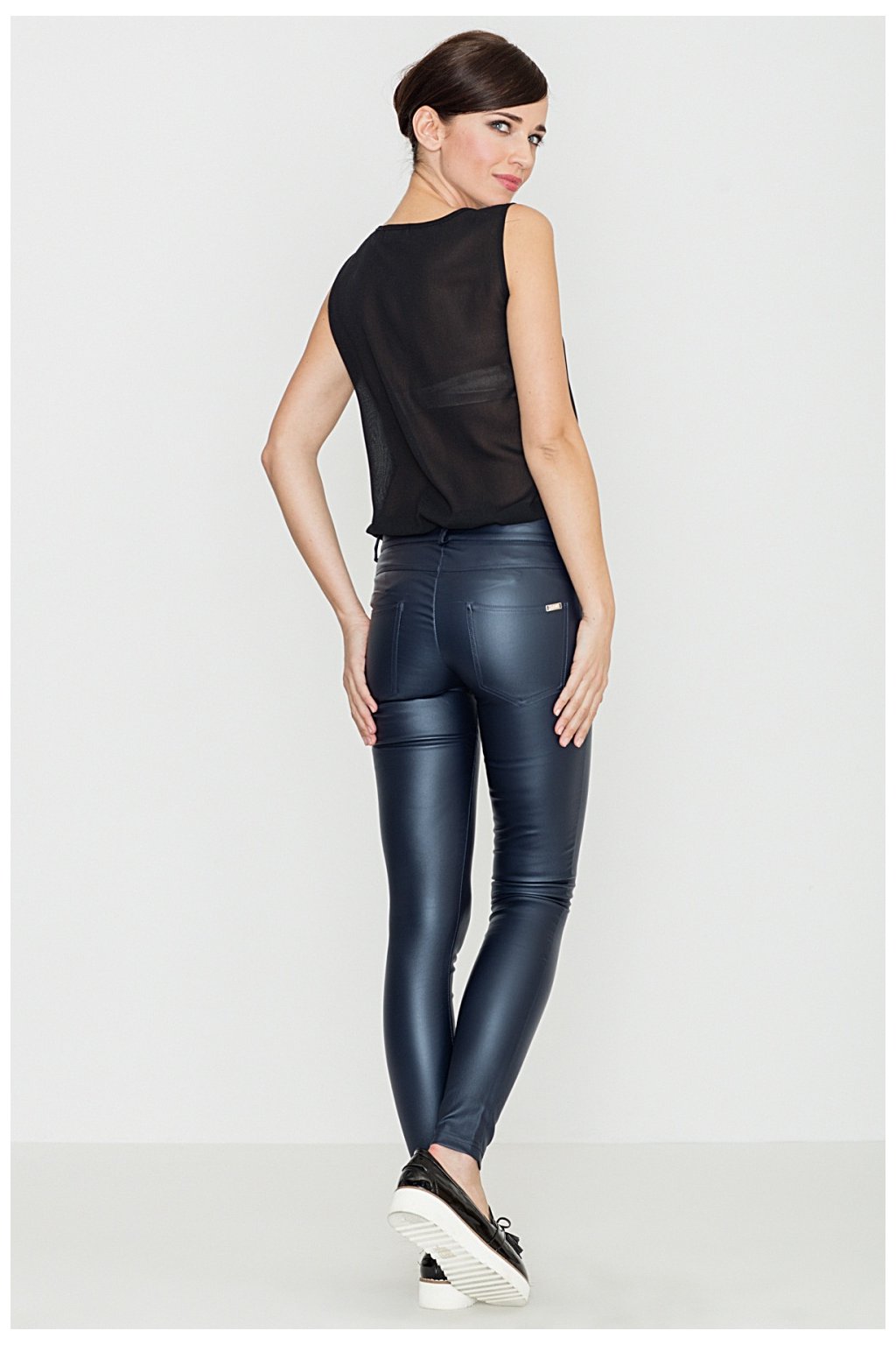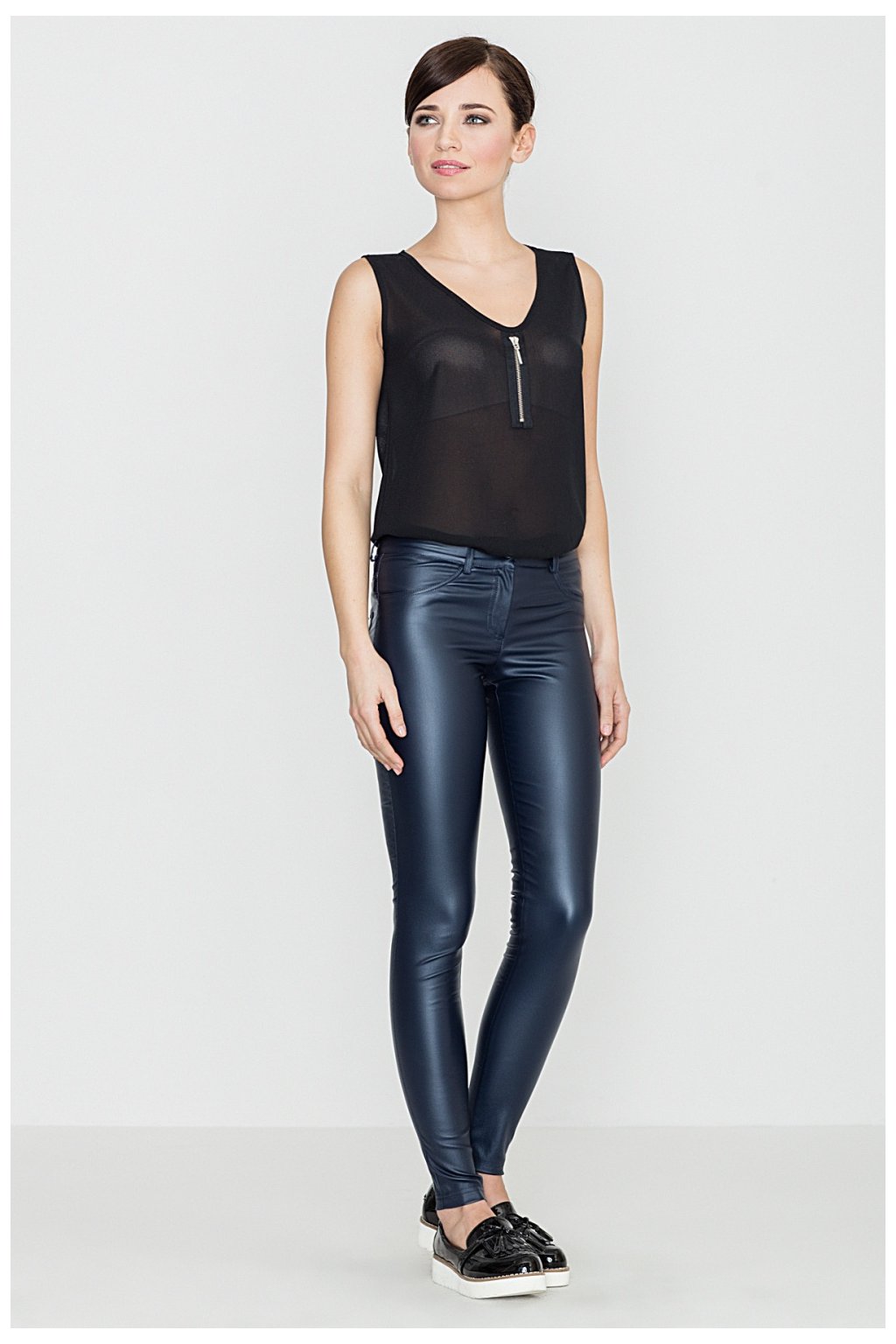 Kalhoty z voskovaného lesklého úpletu s dlouhými rovnými nohavicemi. Tkanina je pevná a pružná, takže se velmi pohodlně nosí. Kapsy na bocích, kapsy na zadní straně. Zapínání na knoflík a zip v zadním sedle, poutka v pase.