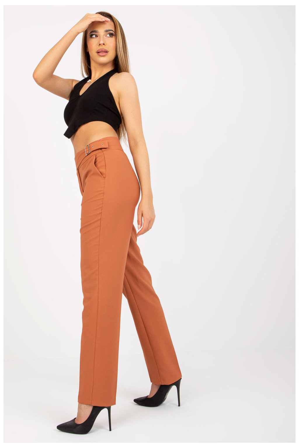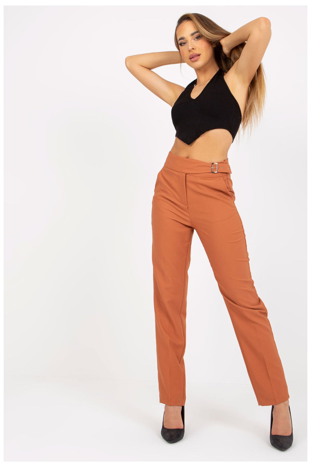 Dámské dlouhé kalhoty s rovnými nohavicemi a vysokým sedem. Kalhoty se zapínají na zip a knoflíky. V pase našitý pásek. Vsazené kapsy na bocích.