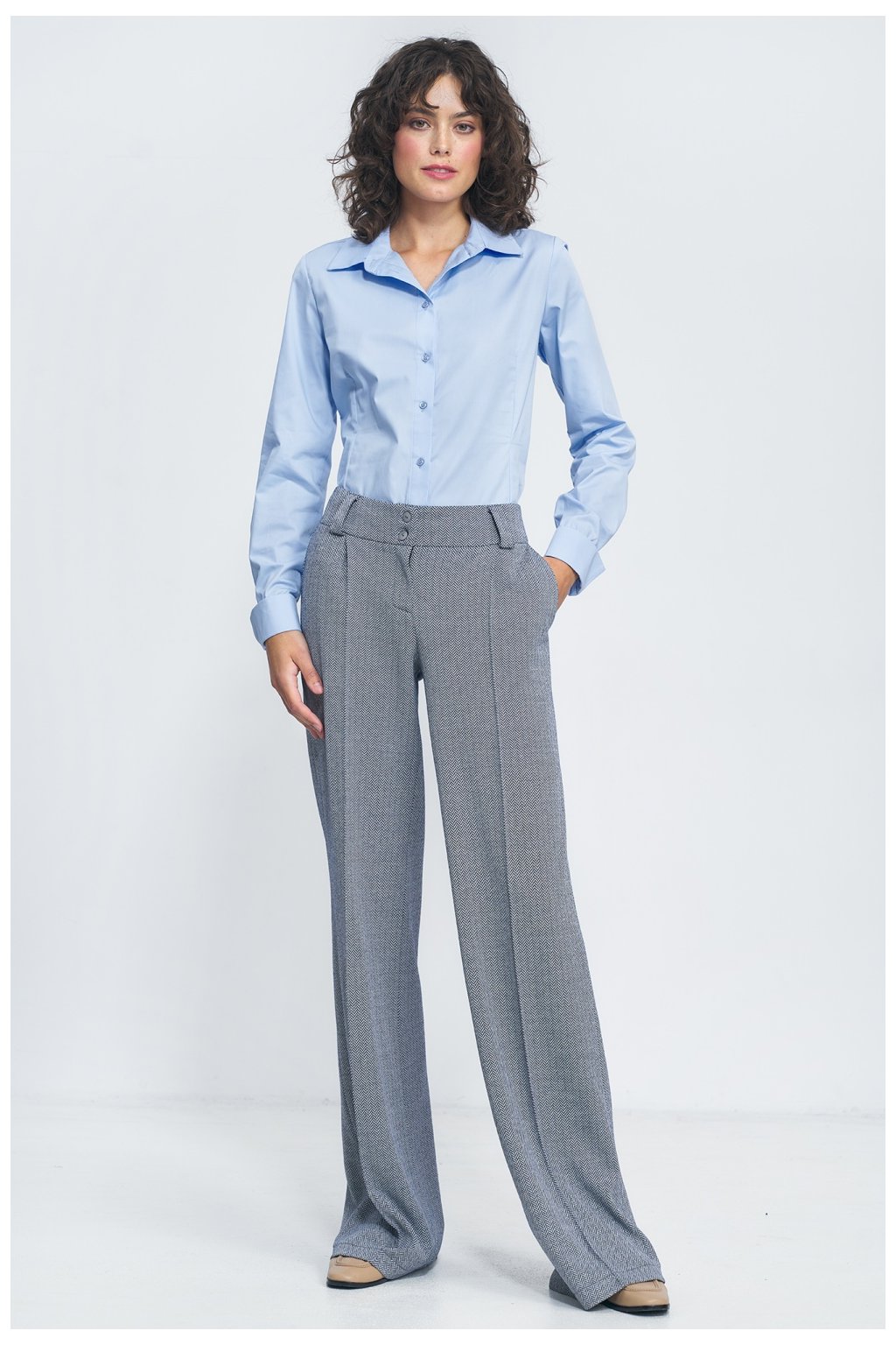 Po mnoha sezónách, kterým dominovaly úzké kalhoty, se vracejí modely se širokými nohavicemi. Tyto kalhoty se dobře hodí k oversized saku ve stejné barvě nebo vzoru. Mají mírně zvýšený pas, který opticky prodlužuje siluetu. Díky převážně viskózovému materiálu se budete cítit pohodlně po celý den.