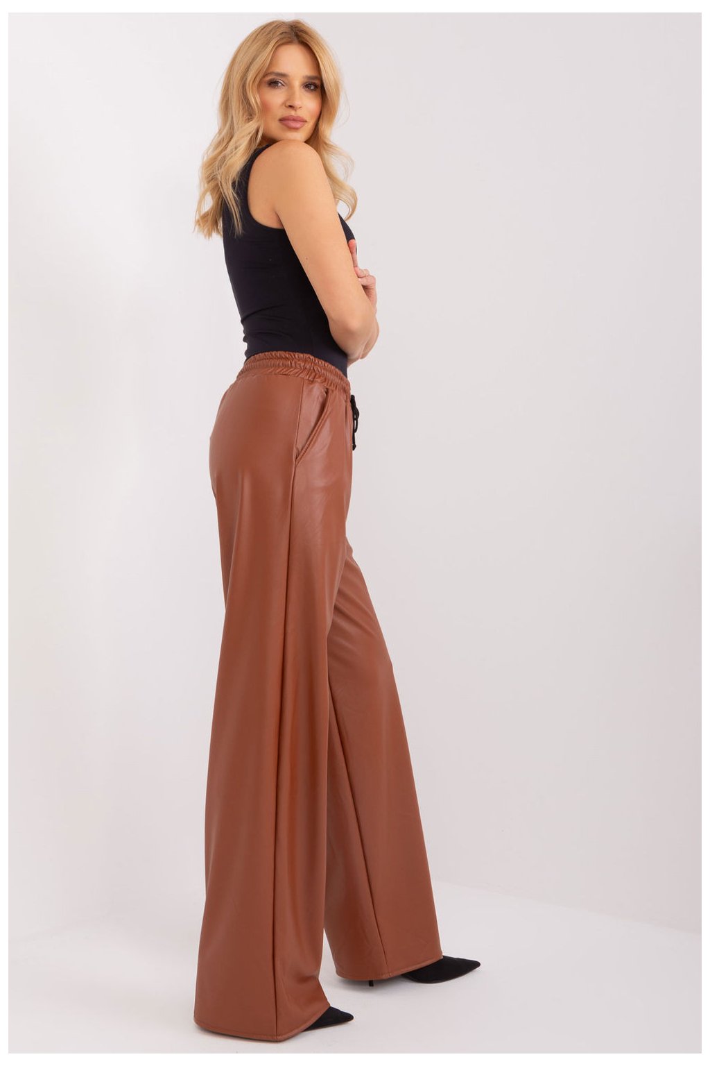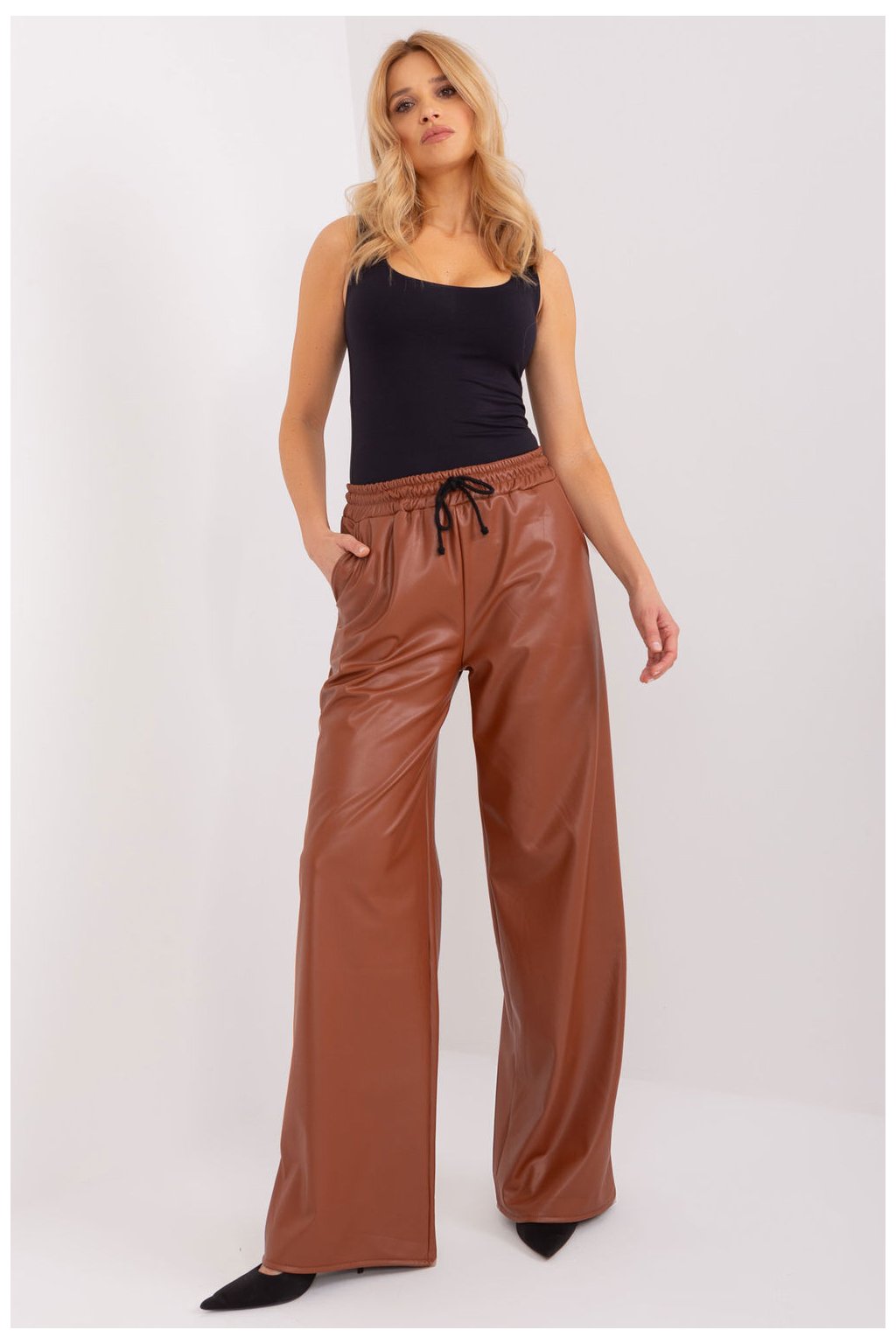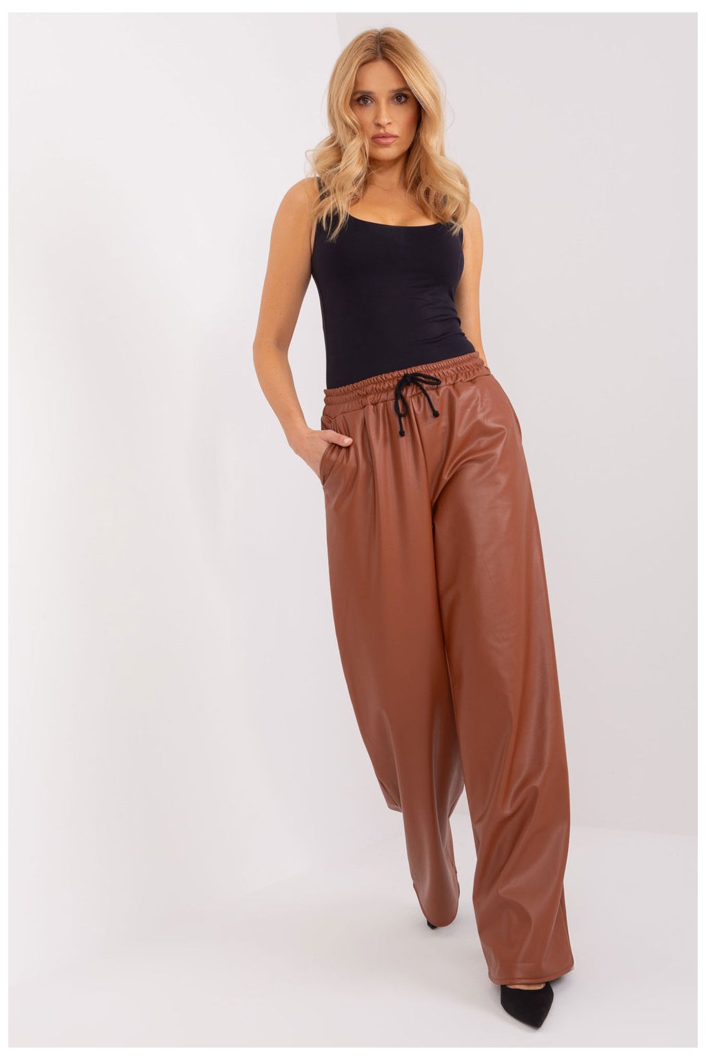 Dlouhé kalhoty z ekologické kůže se zateplením. Kalhoty s vysokým sedem a vázáním, s kapsami na bocích. Návrh pro mnoho příležitostí.