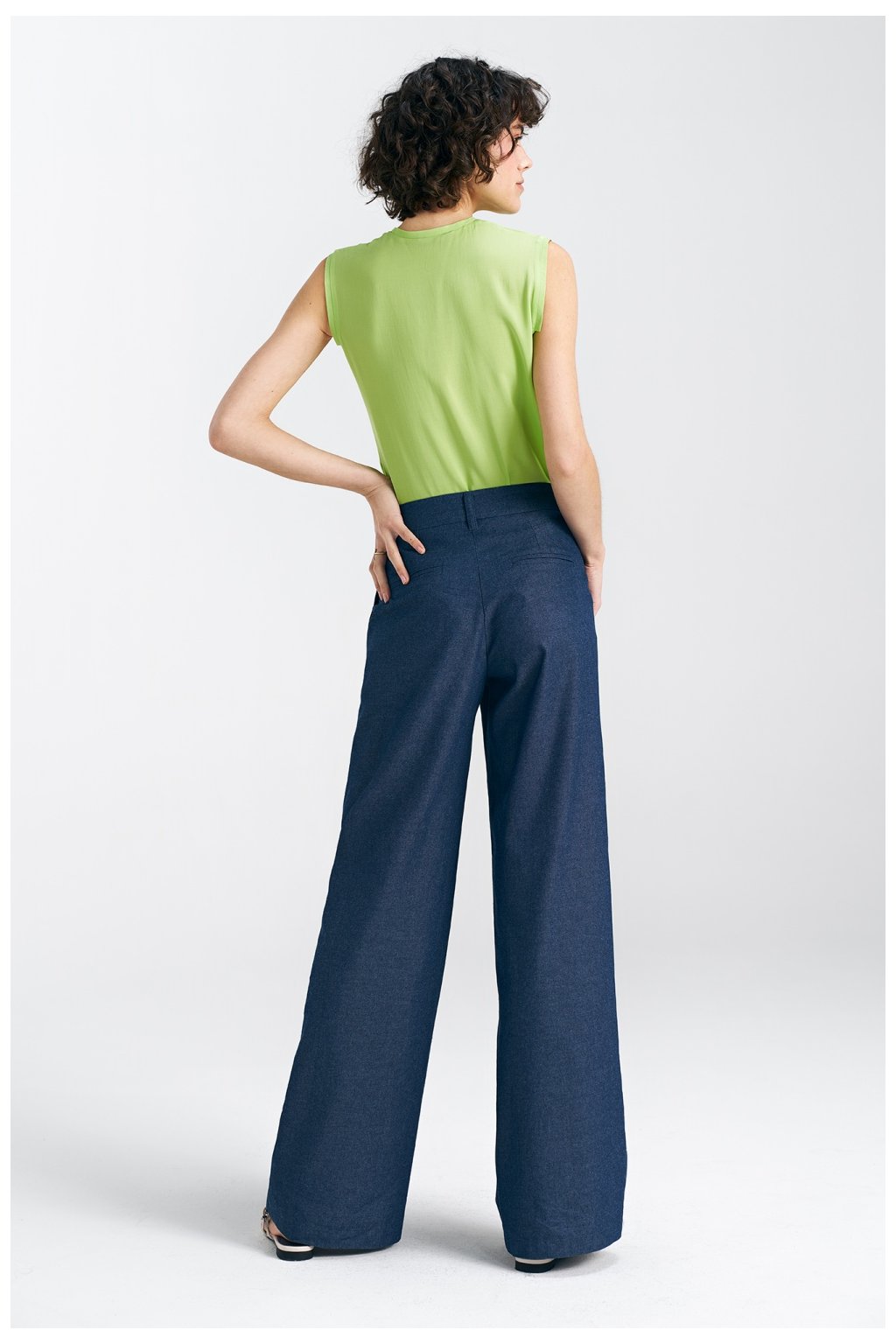 Po mnoha sezónách, kterým dominovaly úzké kalhoty, se vracejí modely se širokými nohavicemi. Tyto kalhoty se dobře hodí k oversized saku ve stejné barvě nebo vzoru. Mírně zvýšené opticky prodlužují siluetu. Ozdobné záhyby na přední straně. Kalhoty se zapínáním na zip a knoflík. Klasické nakládané kapsy.