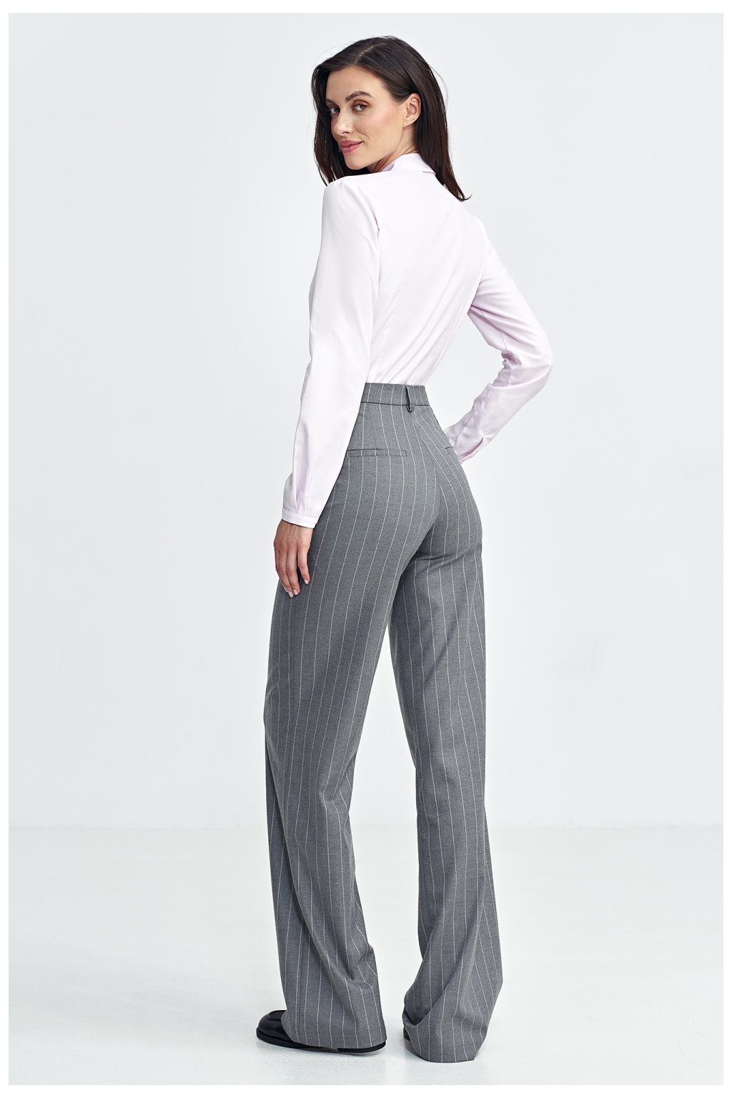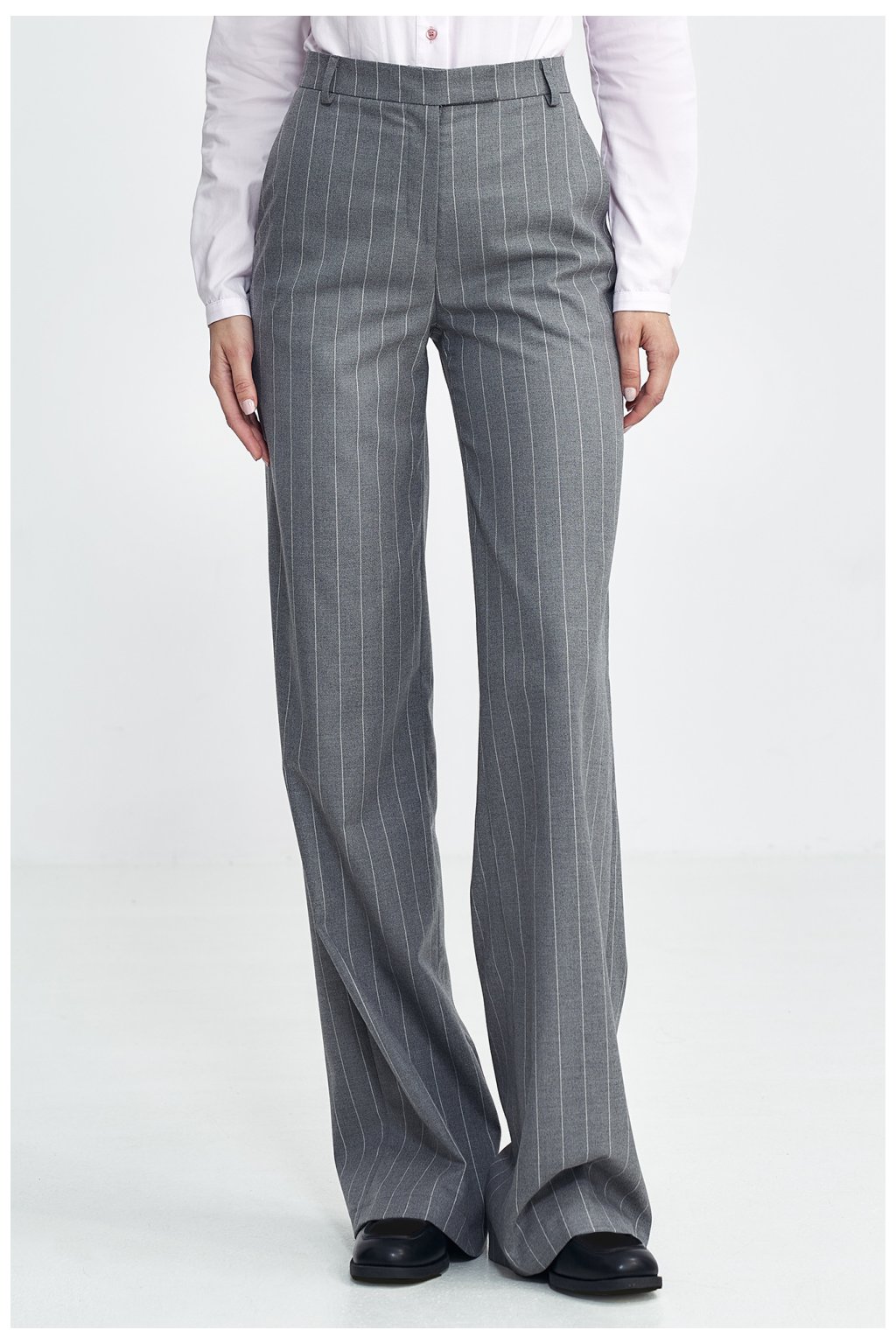 Dámské kalhoty s krojem fit, přizpůsobené postavě, vyrobené z materiálu s jemnými, kontrastními pruhy v tenisovém stylu. Mají vysoký pas, který podtrhuje pas a zajistí elegantní vzhled. Nohavice se rozšiřují bootcutovým střihem od kolen dolů, vytvářejí harmonickou linii. Kalhoty se zapínají vpředu na zip a krytou knoflíkovou knihou, což jim dodává čistý a moderní vzhled. Klasické kapsy vpředu a imitace kapes zezadu přidávají praktičnost a styl. Šlufky na pásek umožňují dodatečné přizpůsobení a doplňují celkový funkční doplněk.