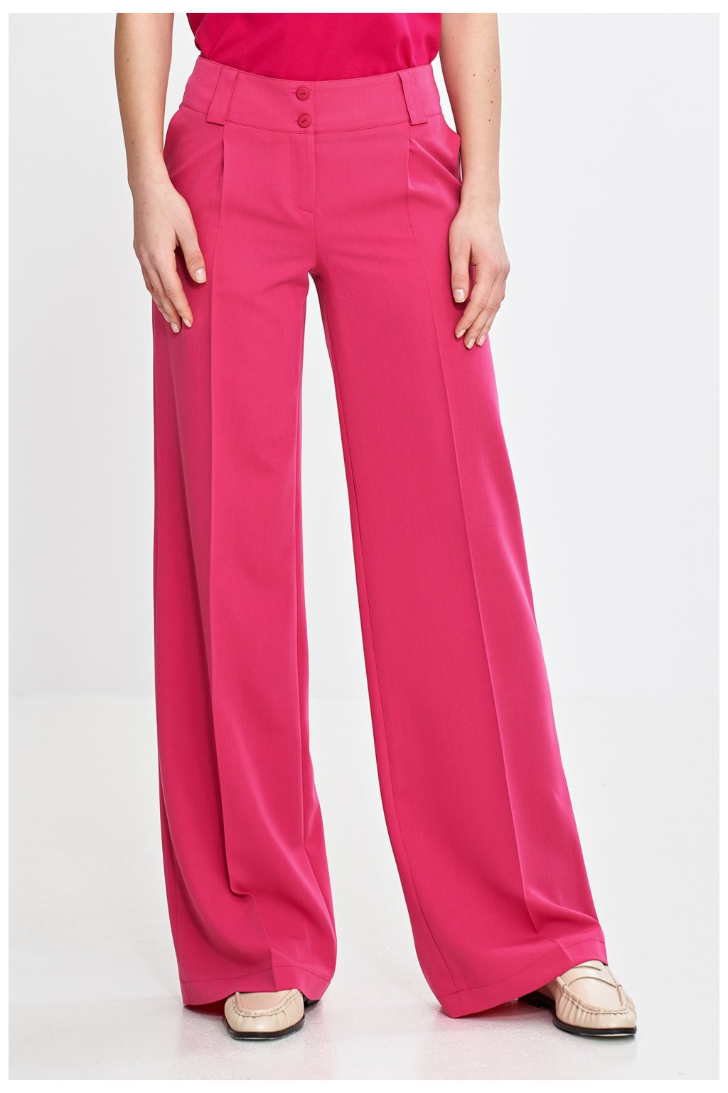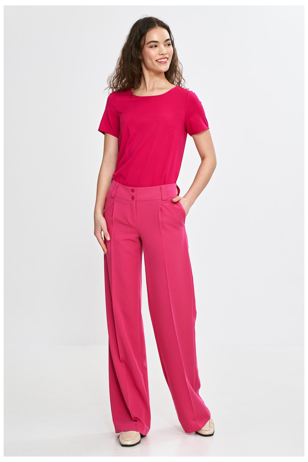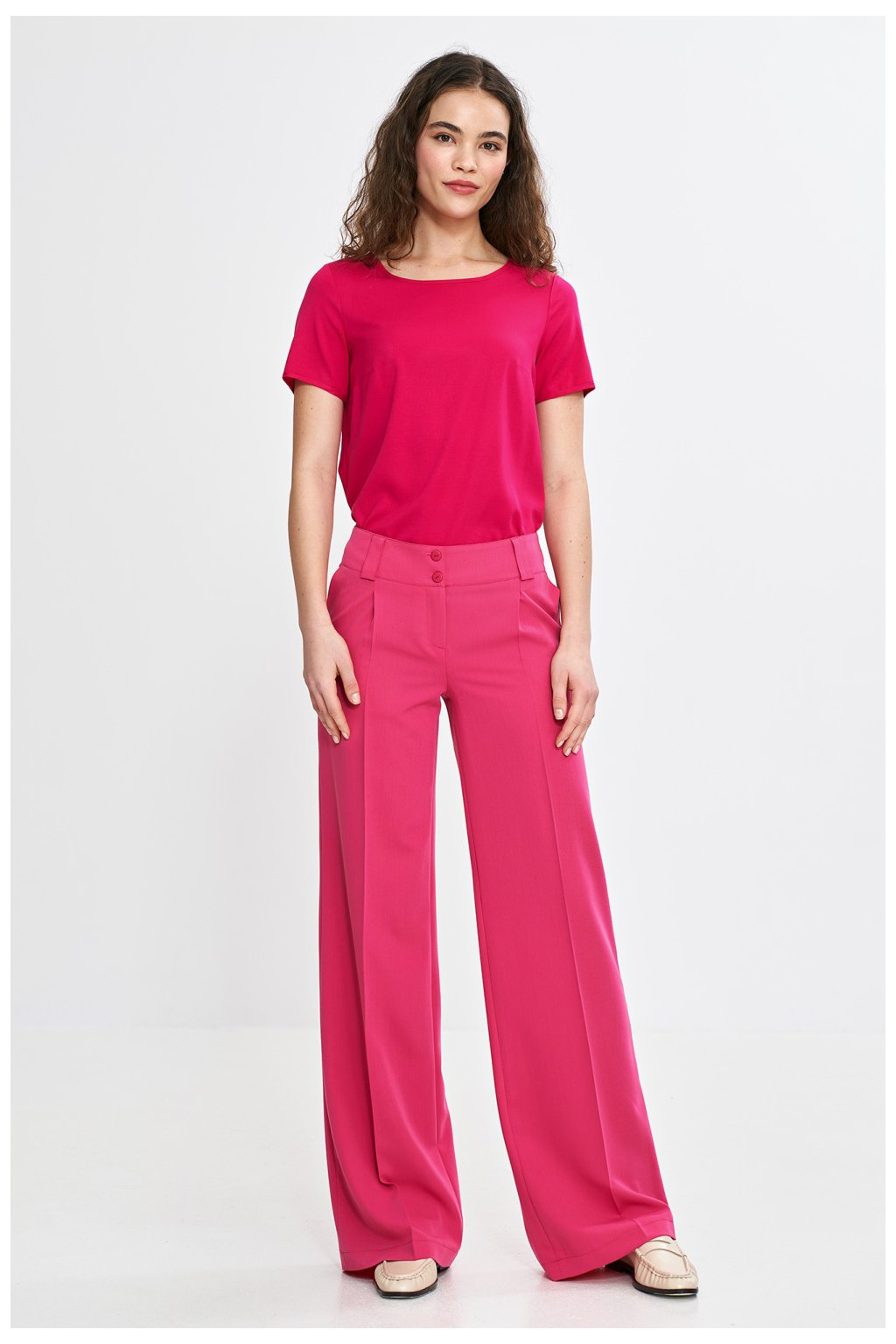 Elegantní dámské kalhoty s pravidelným střihem a středním pasem, kombinující eleganci s moderním designem. Široká nohavice typu wide leg jim dodává lehkost, a žehlené záhyby vpředu a vzadu zdůrazňují jejich nadčasový charakter. Zapínání na zip a dva knoflíky zajišťují pohodlí, a klasické boční kapsy a imitace kapes vzadu dodávají praktický prvek. Široký pás s preslemi na opasek dokonale zdůrazňuje pas, zaručující ideální přizpůsobení a pohodlí nošení. Skvěle se hodí jak do každodenních, tak elegantních stylizací.