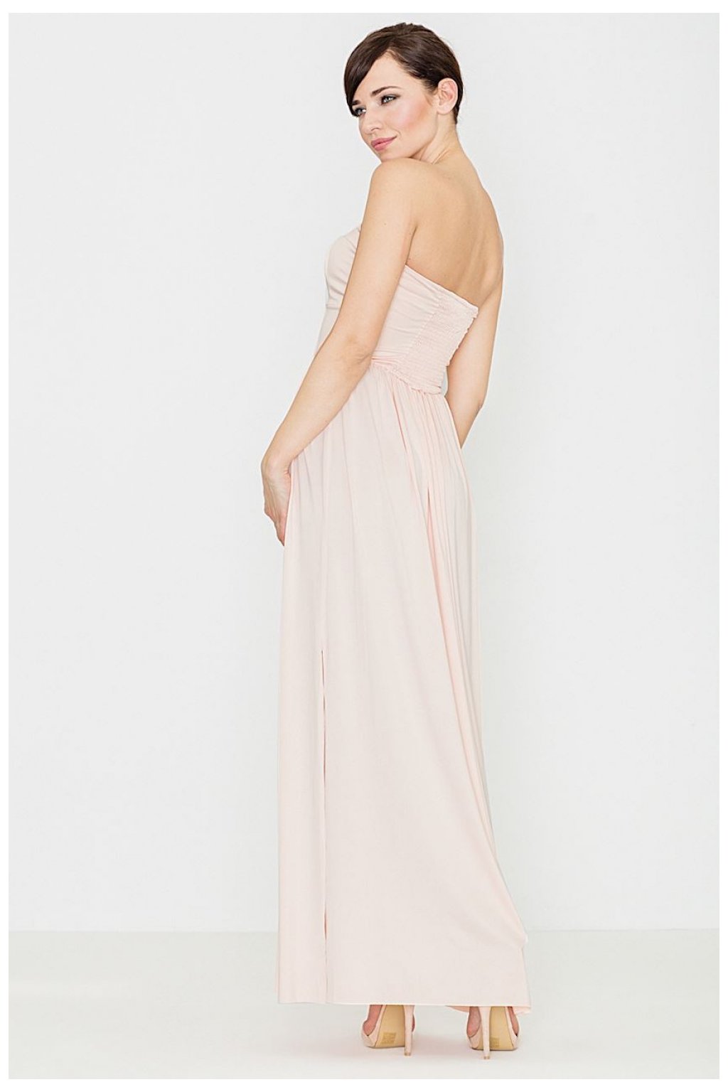 Šaty z jemných materiálů v módní maxi délce. Korzetový top dokonale odhaluje výstřih a ramena a skvěle doplňuje dlouhý spodní díl. Živůtek má dvojitou vrstvu látky. Šaty jsou v pase přestřižené. Hustě řasená spodní část jemně obepíná siluetu a dodává jí ženský charakter. Dlouhý rozparek na boku umožňuje odhalit tvarované nohy.