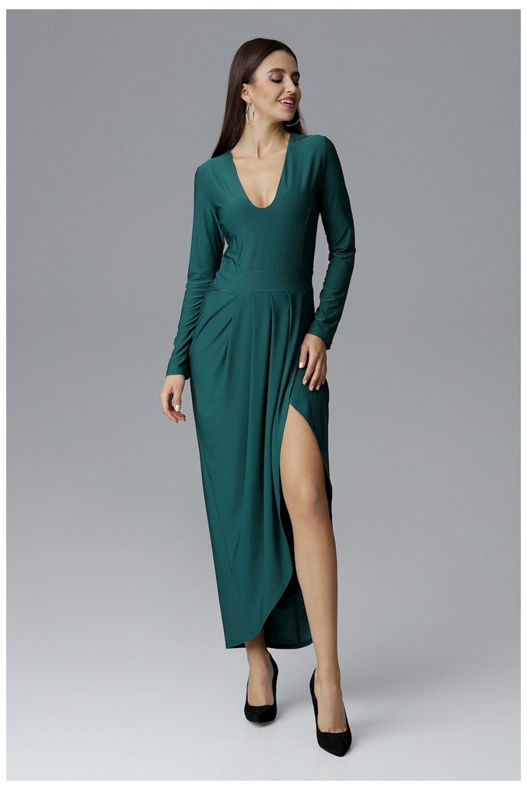 Elegantní dlouhé šaty se srdíčkovým výstřihem. Přiléhavý, asymetrický přední díl s rozparkem na stehnech. Model s dlouhými rukávy. Krásně zvýrazňuje postavu.