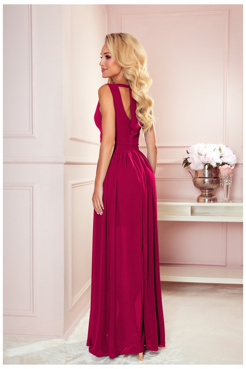Dlouhé šaty s výstřihem, rozparkem na nohou a zavazováním na zádech. Vyrobeno ze vzdušného materiálu ve vínové barvě. Zapíná se vzadu na krytý zip. Polský výrobek. Značka numoco.