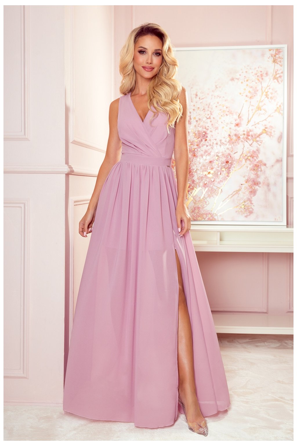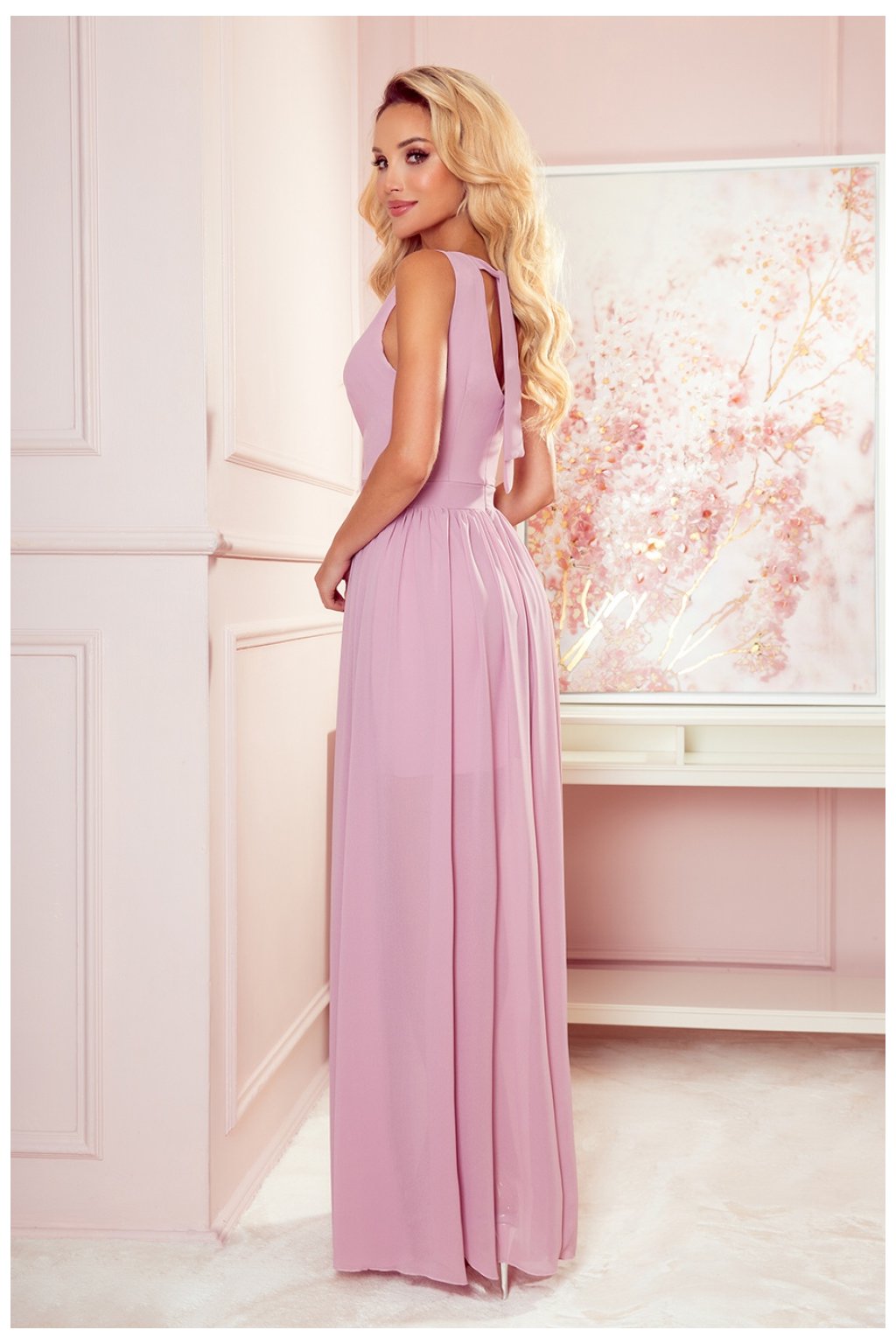 Dlouhé šaty s výstřihem, rozparkem na nohou a zavazováním na zádech. Je vyroben ze vzdušného materiálu v pudrově růžové barvě. Zapíná se vzadu na krytý zip. Polský výrobek. Značka numoco.