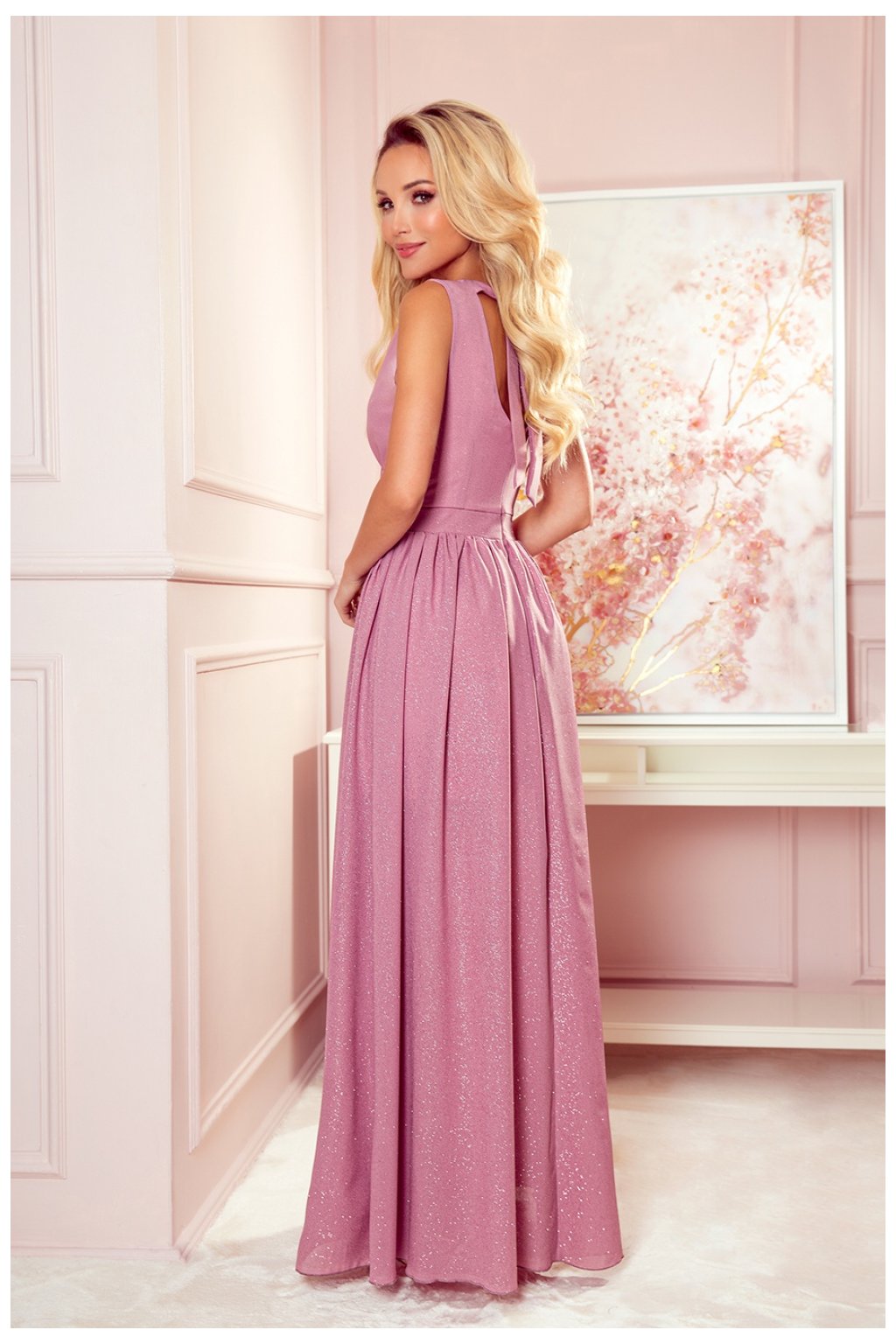 Dlouhé šaty s výstřihem, rozparkem na nohou a zavazováním na zádech. Je vyroben ze vzdušné tkaniny v pudrově růžové barvě s brokátem. Zapínání na zádech na krytý zip. Polský výrobek. Značka numoco.