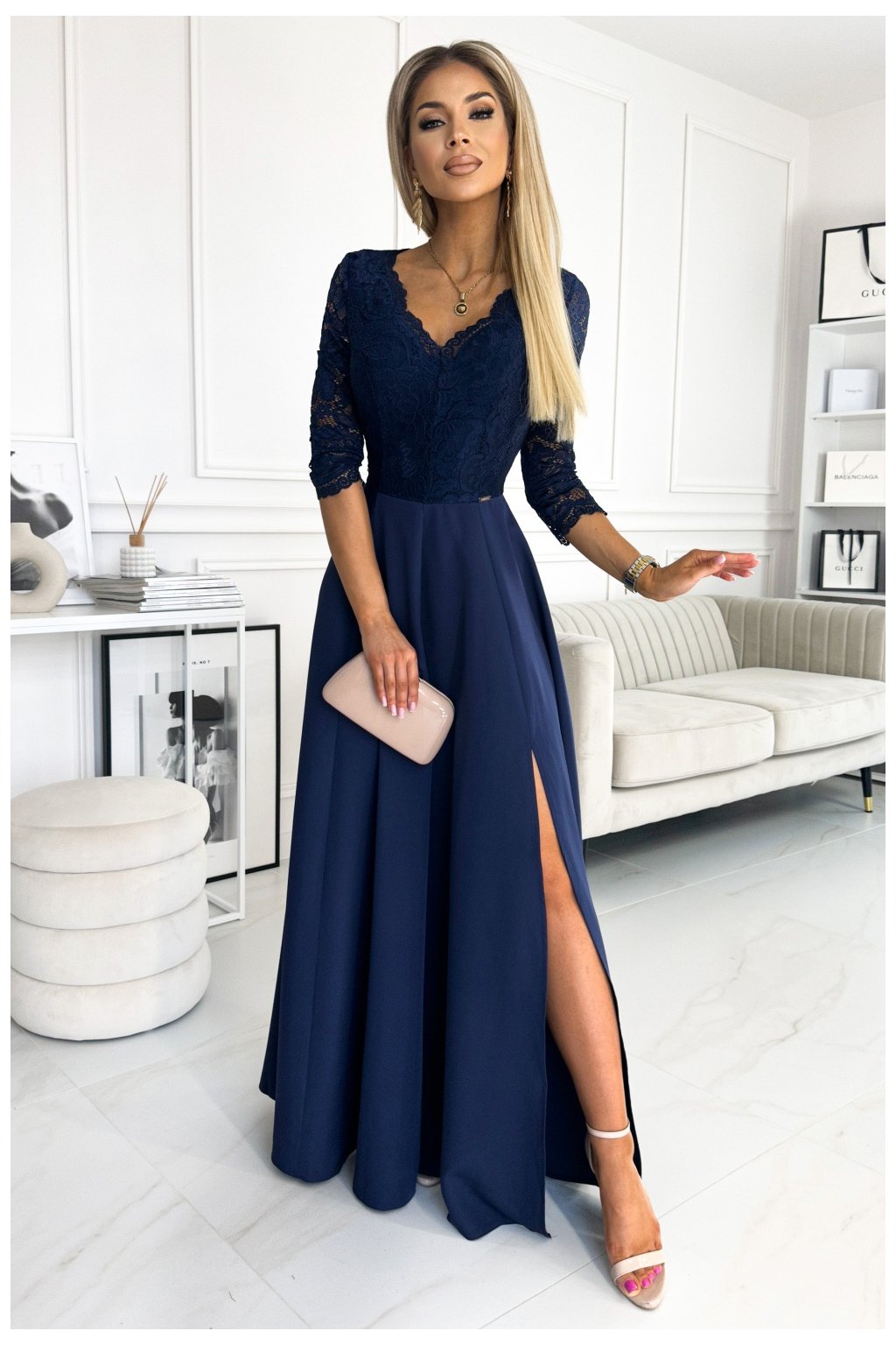 Elegantní dlouhé krajkové šaty se srdíčkovým výstřihem. Krásně tvarovaný výstřih a rozparek na sukni vytvářejí neobvyklou kreaci v tmavě modré barvě. Polská výroba. Značka Numoco.