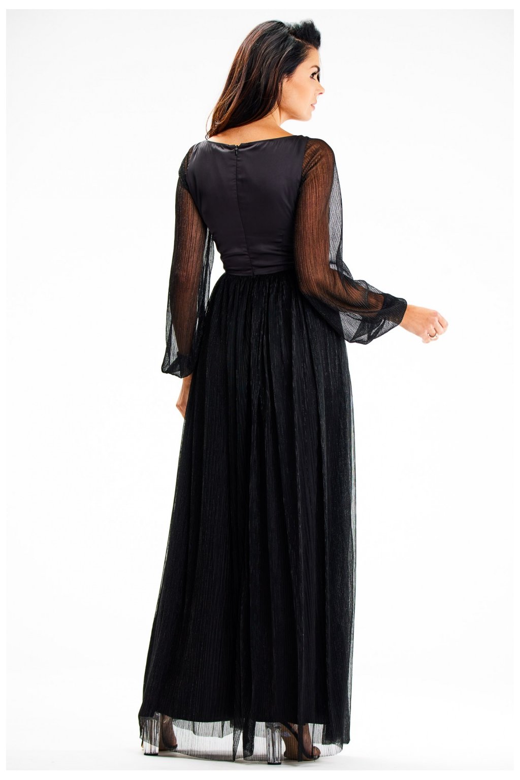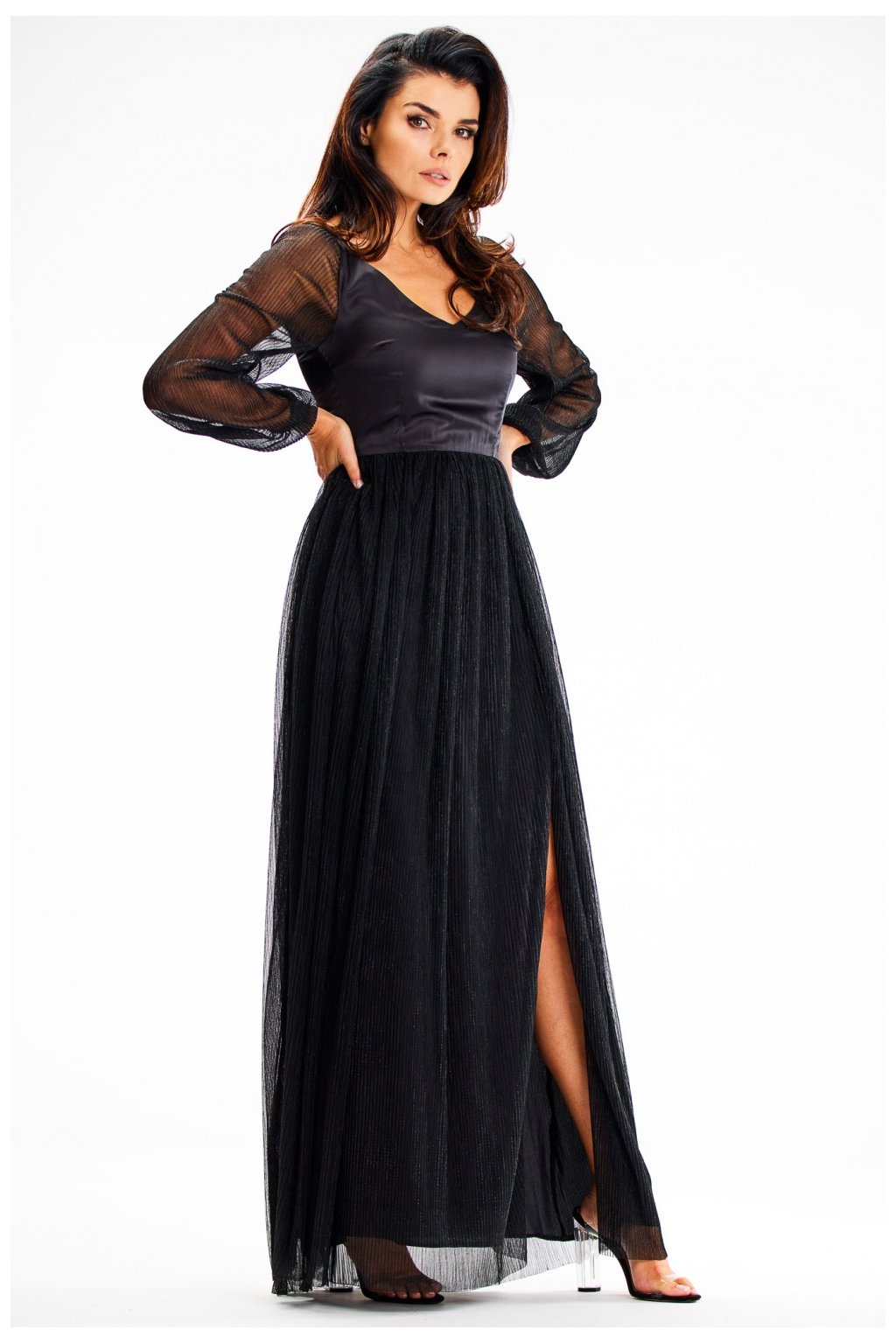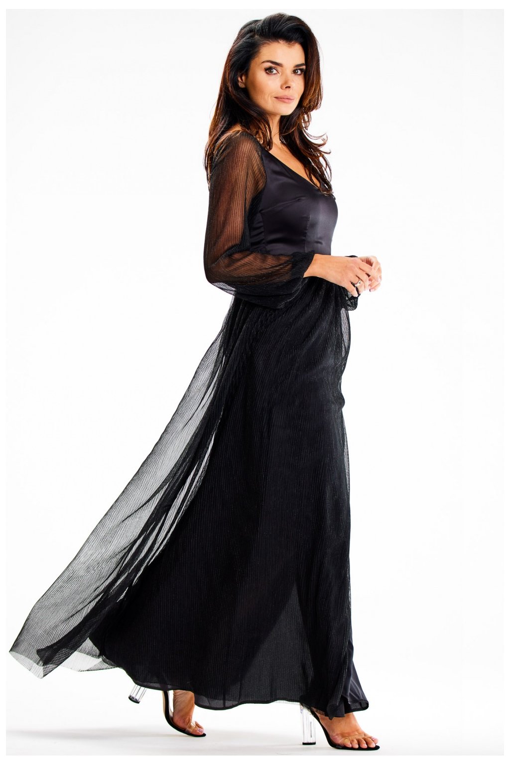 Maxi šaty s nápadným rozparkem na levé nohavici. Lesklá síťovina, ze které jsou rukávy a spodní lem, upoutá pozornost a dodává celému stvoření jemný třpyt. Horní část šatů s hlubokým výstřihem, vyrobená z hladkého saténu.