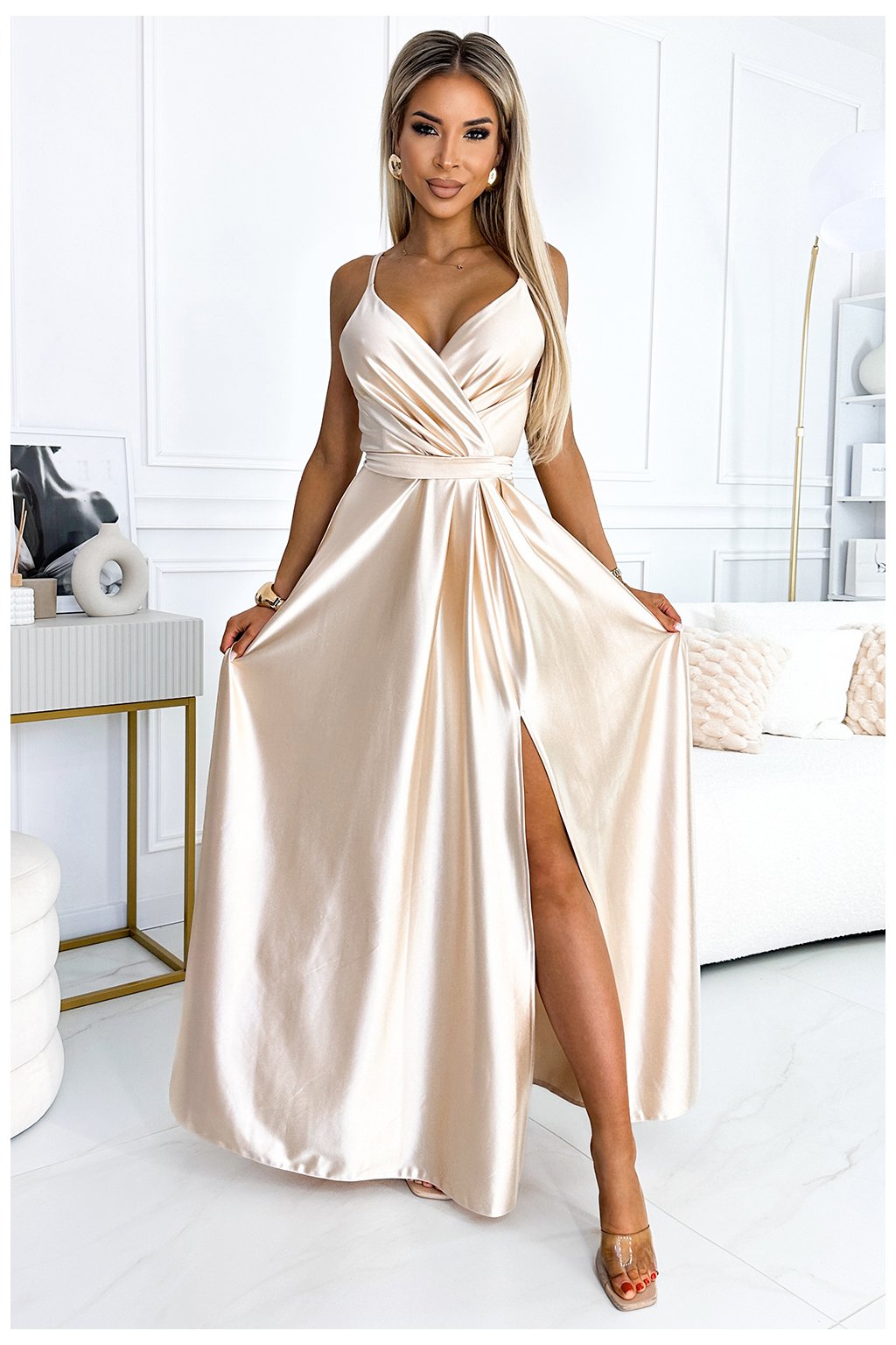 Elegantní maxi dlouhé saténové šaty s rozparkem na nohou a páskem. Krásně tvarovaný výstřih a rozparek na sukni vytvářejí neobvyklou kompozici. Vyrobeno z lesklého, hladkého, mírně elastického saténu v béžové barvě. Šaty ideální na svatbu, Silvestra, ples, karneval a jiné významnější příležitosti. Vyrobeno v Polsku. Značka Numoco.