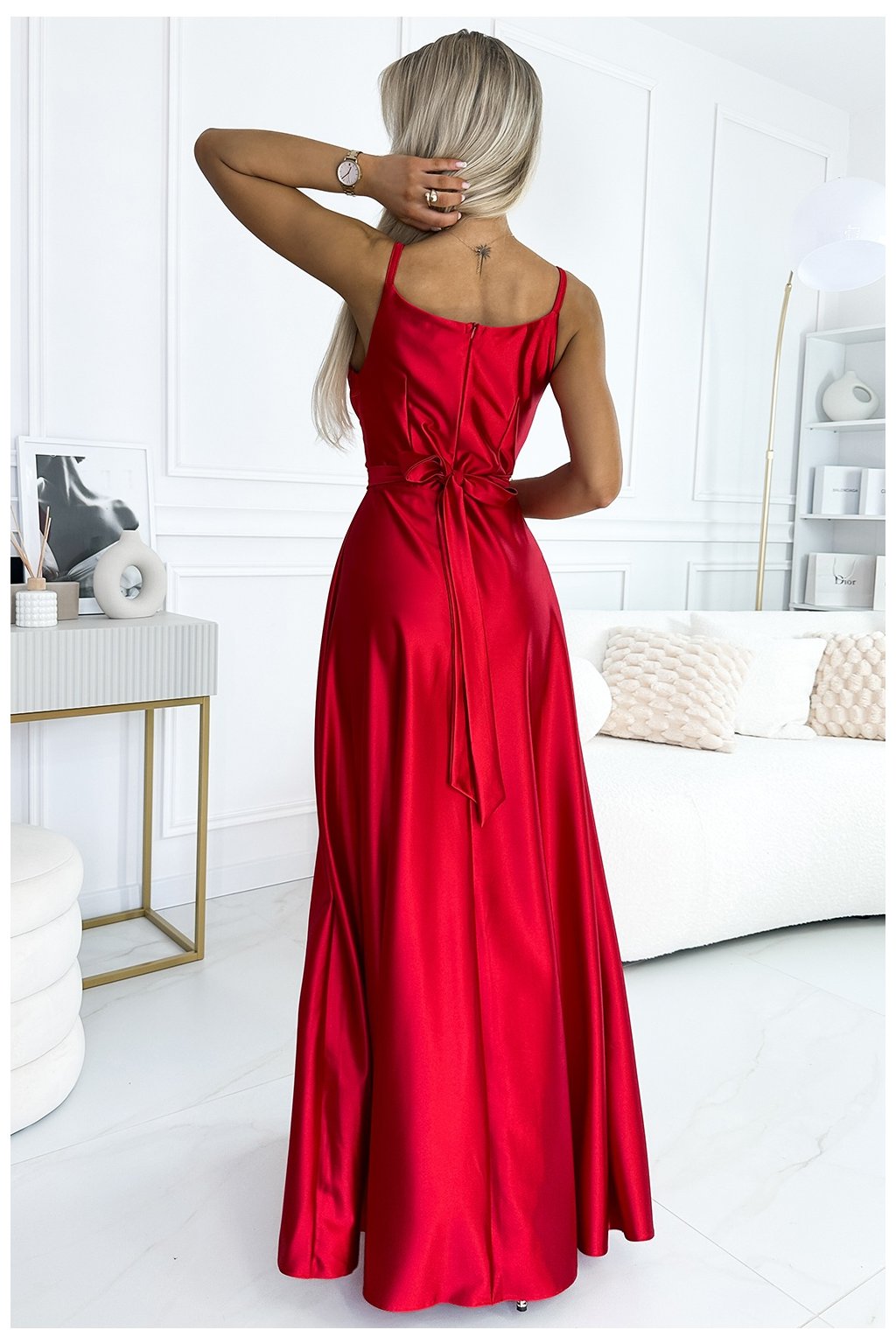 Elegantní maxi dlouhé saténové šaty s rozparkem na nohou a páskem. Krásně tvarovaný výstřih a rozparek na sukni vytvářejí neobvyklou kompozici. Jsou vyrobeny z lesklého, hladkého, mírně elastického saténu v červené barvě. Šaty ideální na svatbu, Silvestra, ples, karneval a jiné významnější příležitosti. Vyrobeno v Polsku. Značka Numoco.