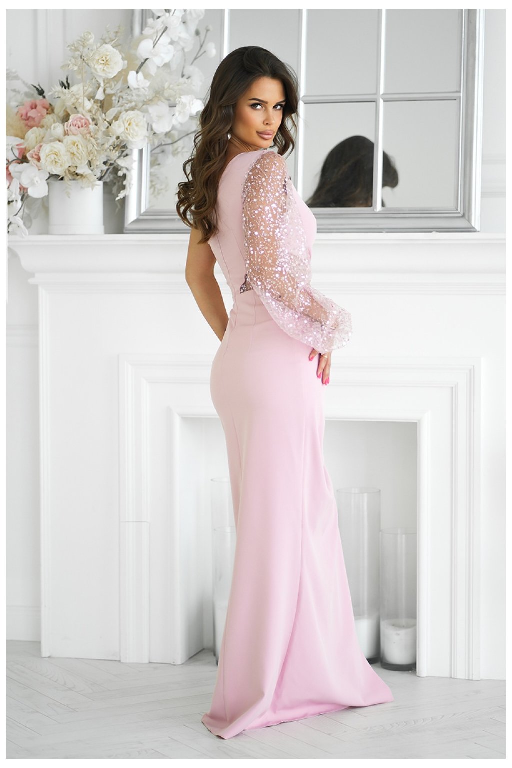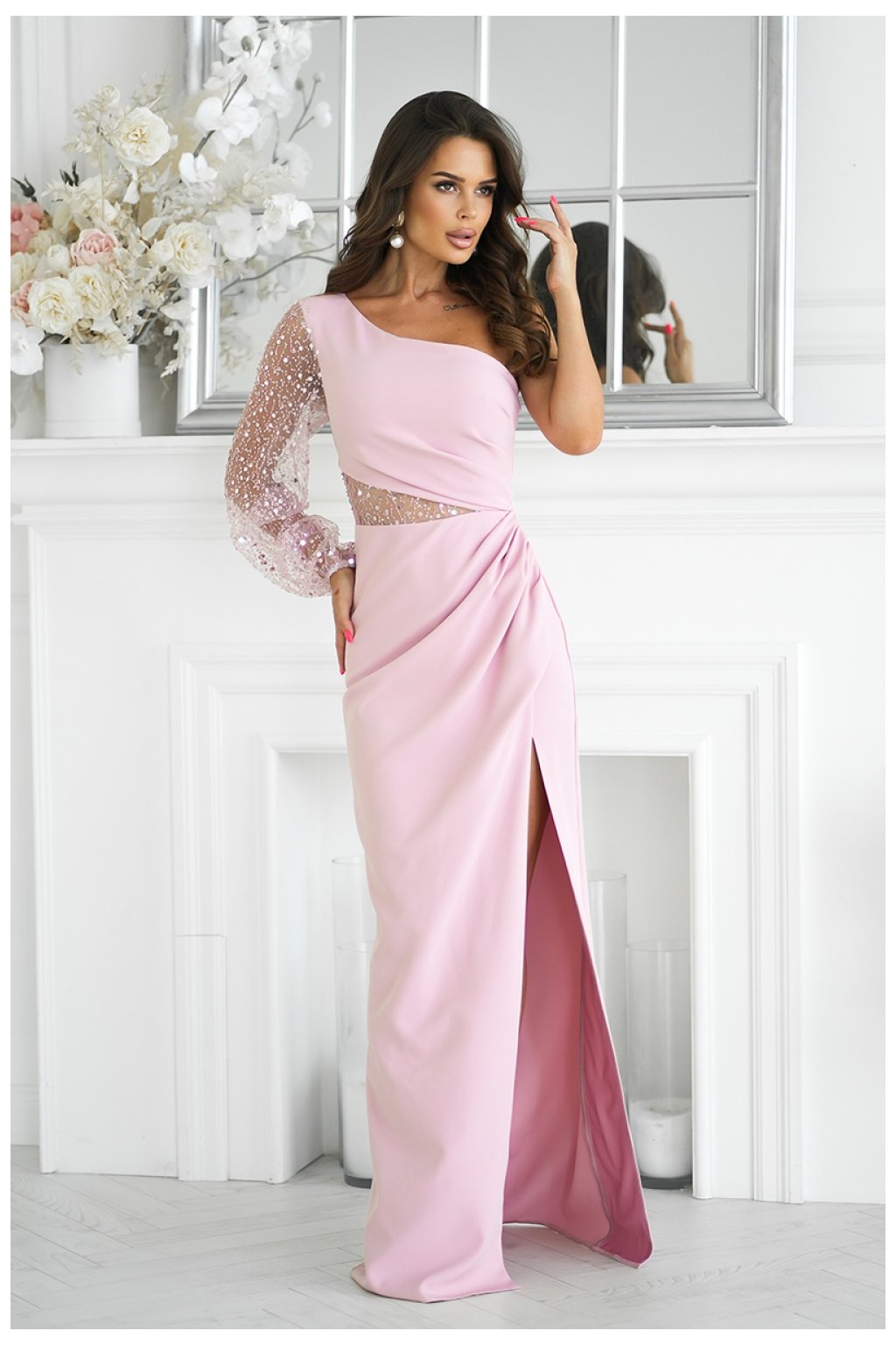 Model s krásnými flitrovými rukávy na jedno rameno. Asymetrický top, rovněž s flitrovou vsadkou. Spodní část kreace je hladká, řasená, s nápadným rozparkem na nohavici. Šaty se zapínají na skrytý zip a mají podšívku. Mimořádně elegantní, stylové šaty ideální na plesy, maturitní plesy a svatby.Velikost | Délka | Obvod prsou | Obvod v pase |